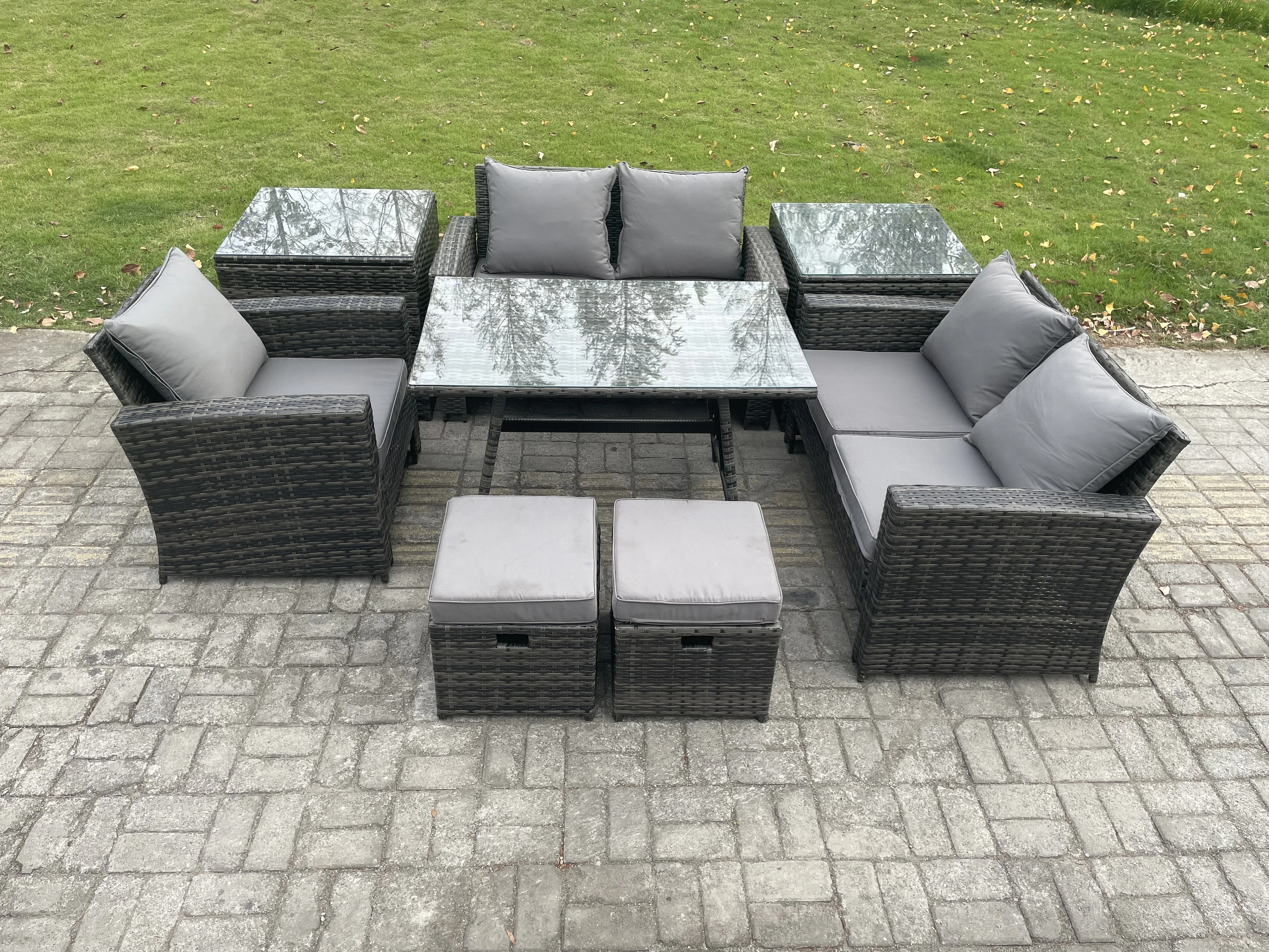 Garten Esstisch Set Polyrattan Outdoor Möbel Sofa mit Rechteckiger Esstisch Doppelsitz Sofa 2 Beistelltischen 2 kleine Fußhockern Dunkelgrau Gemischt