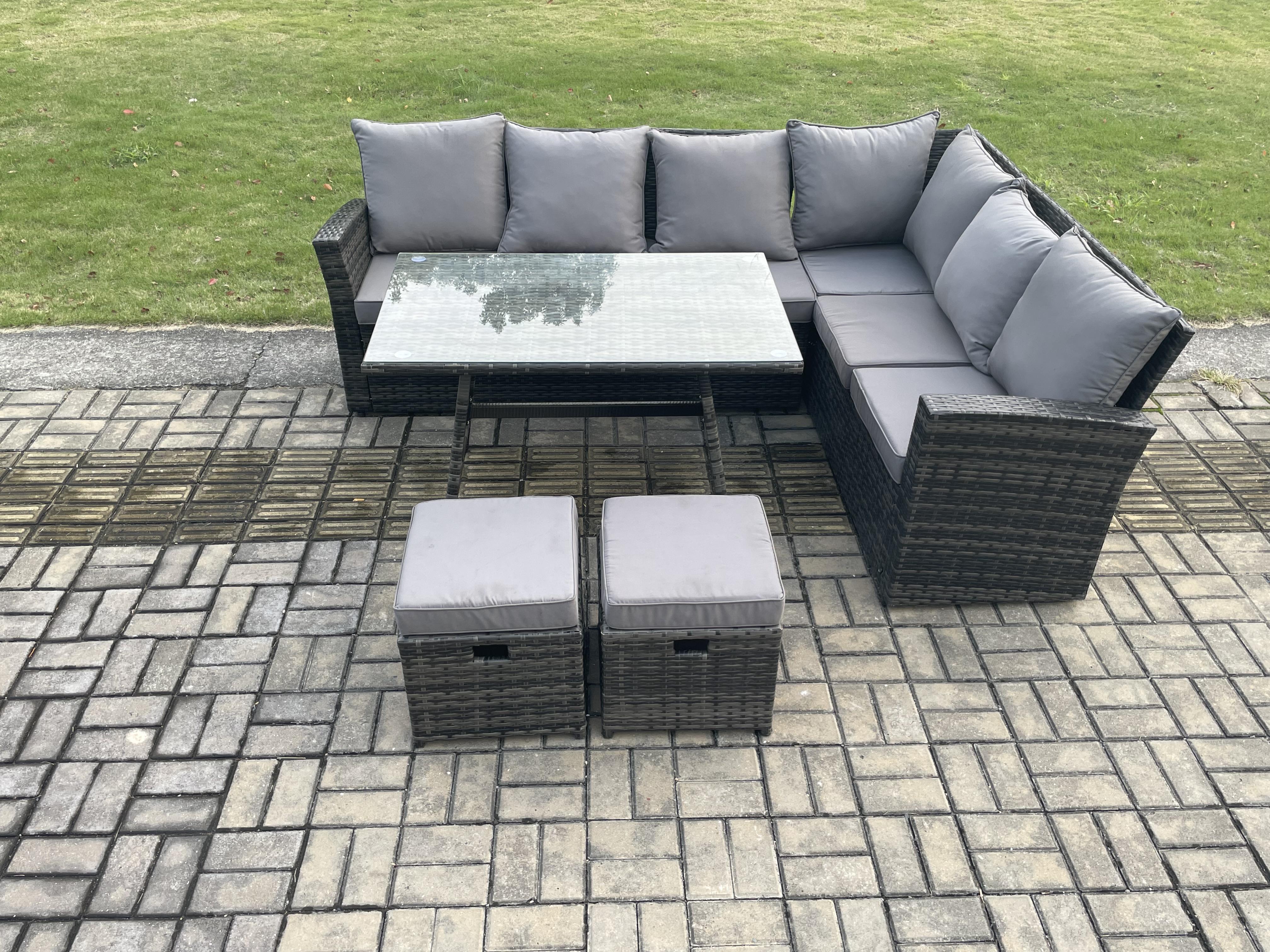 Garten Lounge Set Polyrattan Gartenmöbel Set Rechteckiger Esstisch mit Temper Glass 2 kleine Fußhockern Dunkelgrau Gemischt