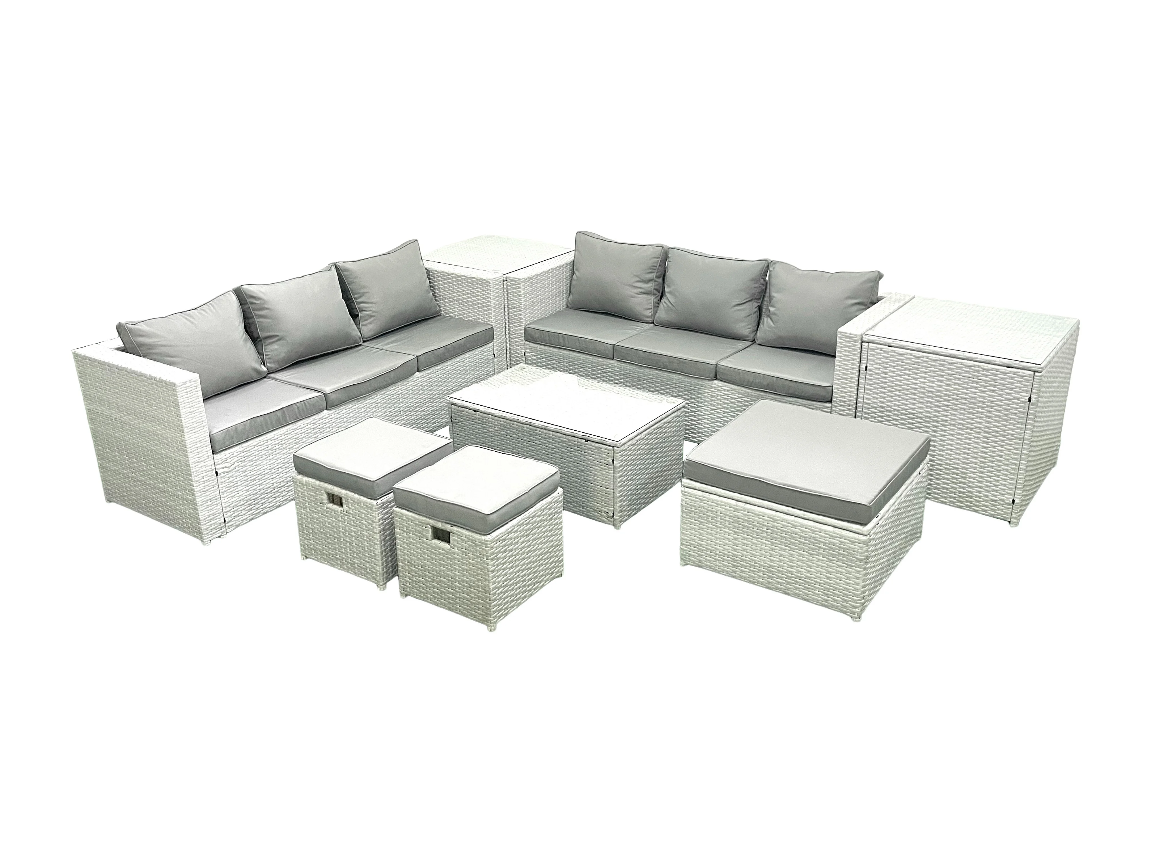 Garten Polyrattanmöbel Set 9-Sitzer Rattan Garten Sofa Set mit 3 Hockern 2 Beistelltischen Hellgrau gemischt