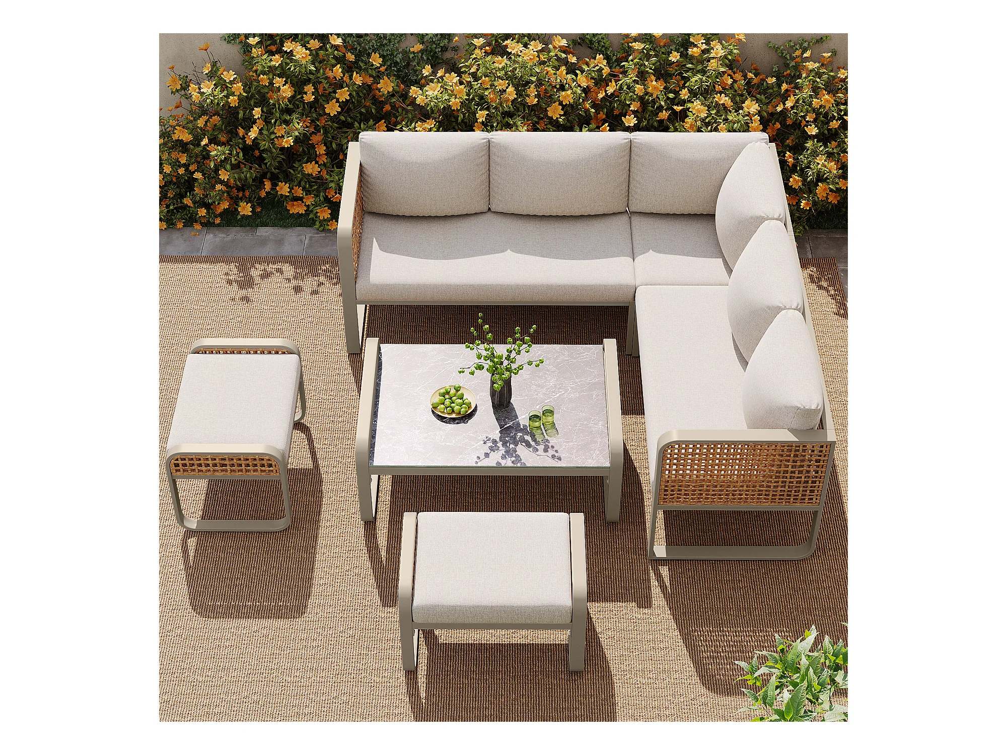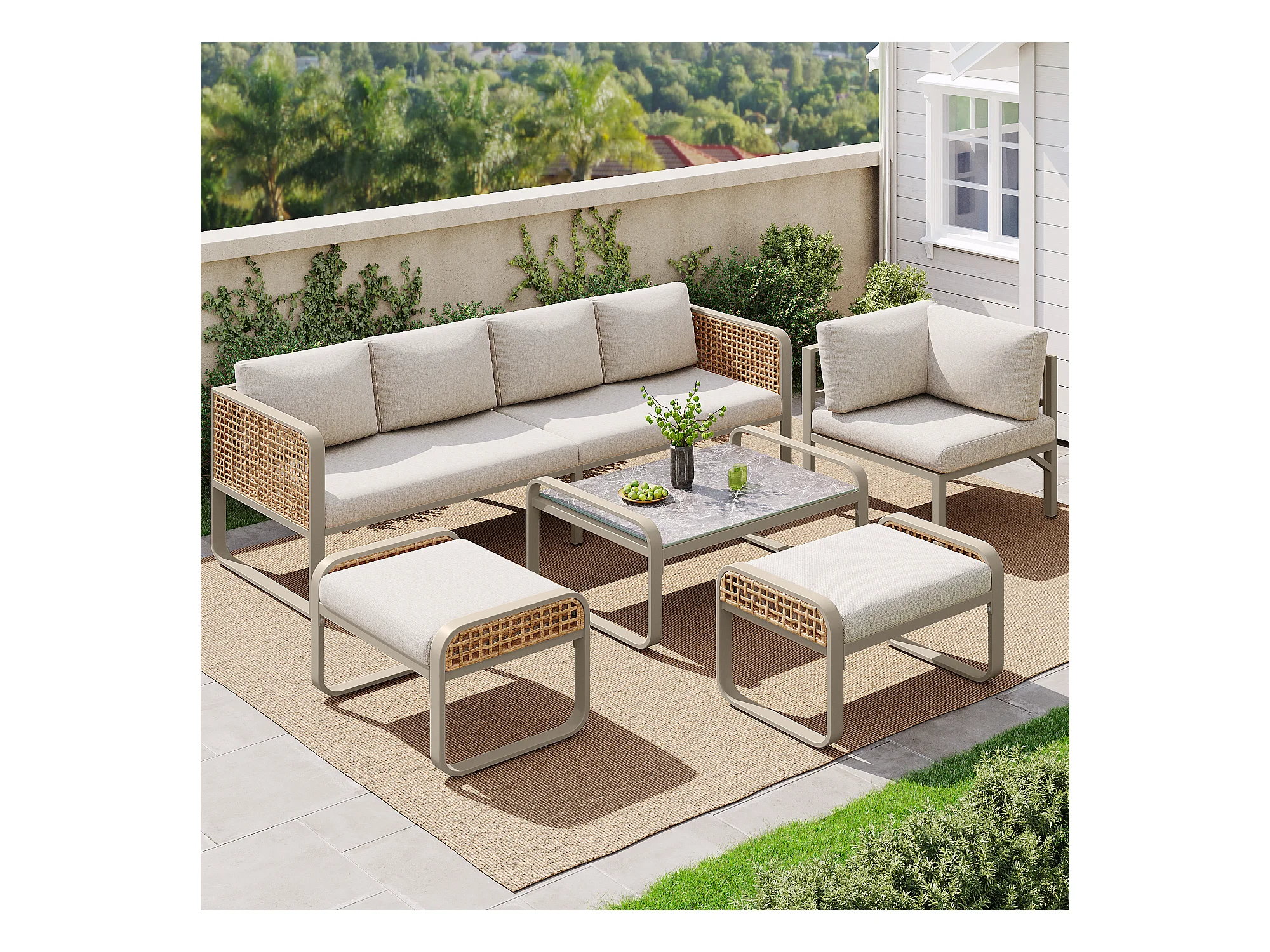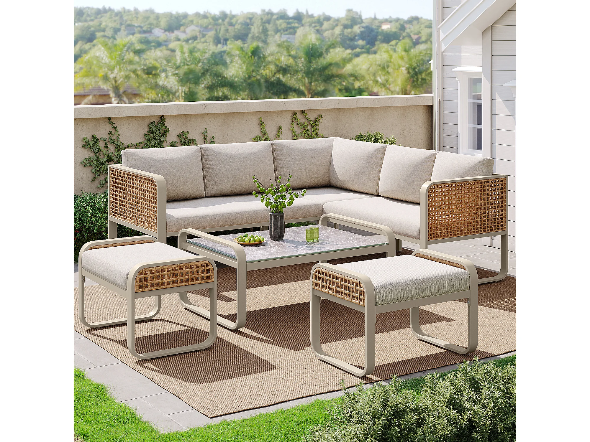 Gartenmöbel-Set, Rattanmöbelgruppe für 6-7 Personen, Eckcouch - aus verzinktem Eisen, höhenverstellbare Füße, Beige