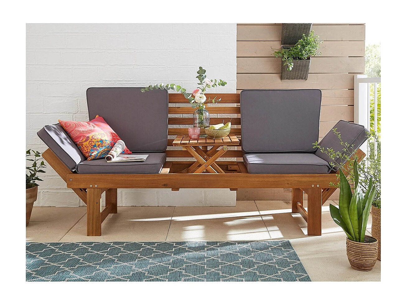 GARTENBANK Akazie 200 Multifunktionell, mit Polstern, integrierter Tisch naturfarben