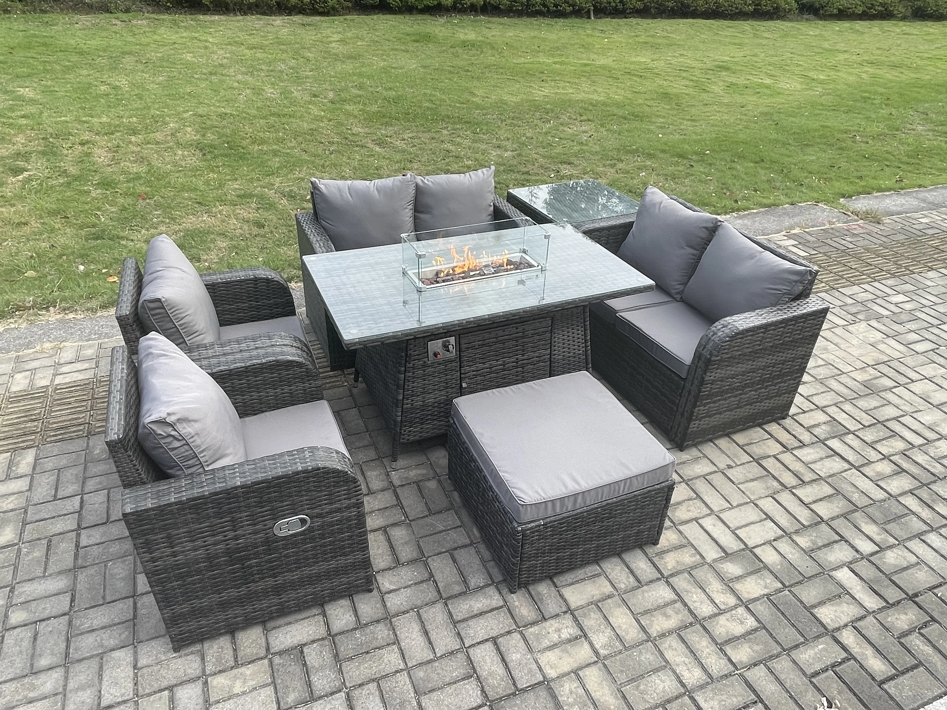 Gartengarnitur Polyrattan mit Gas Feuerstelle Dunkelgrau 7-Sitzer
