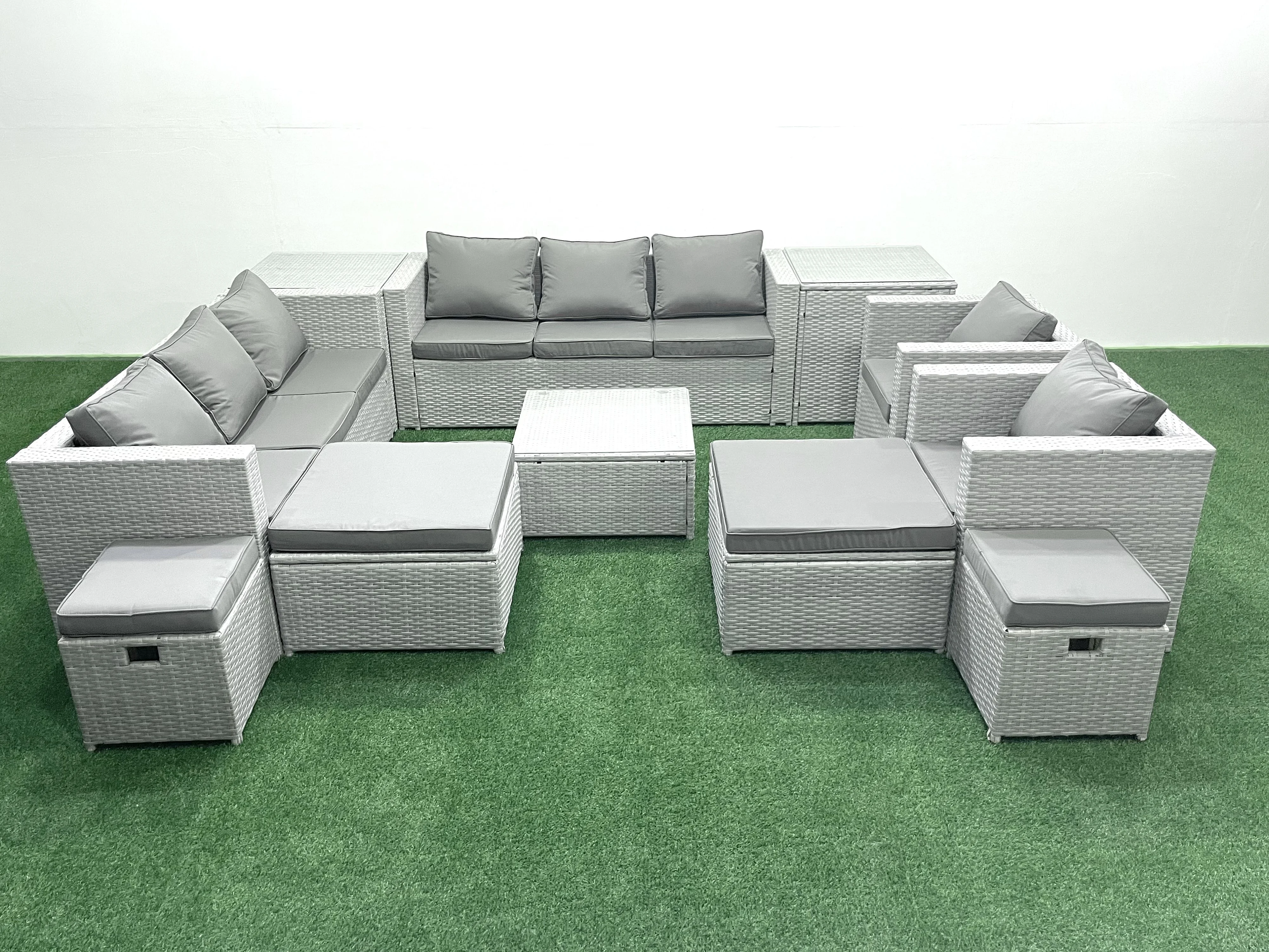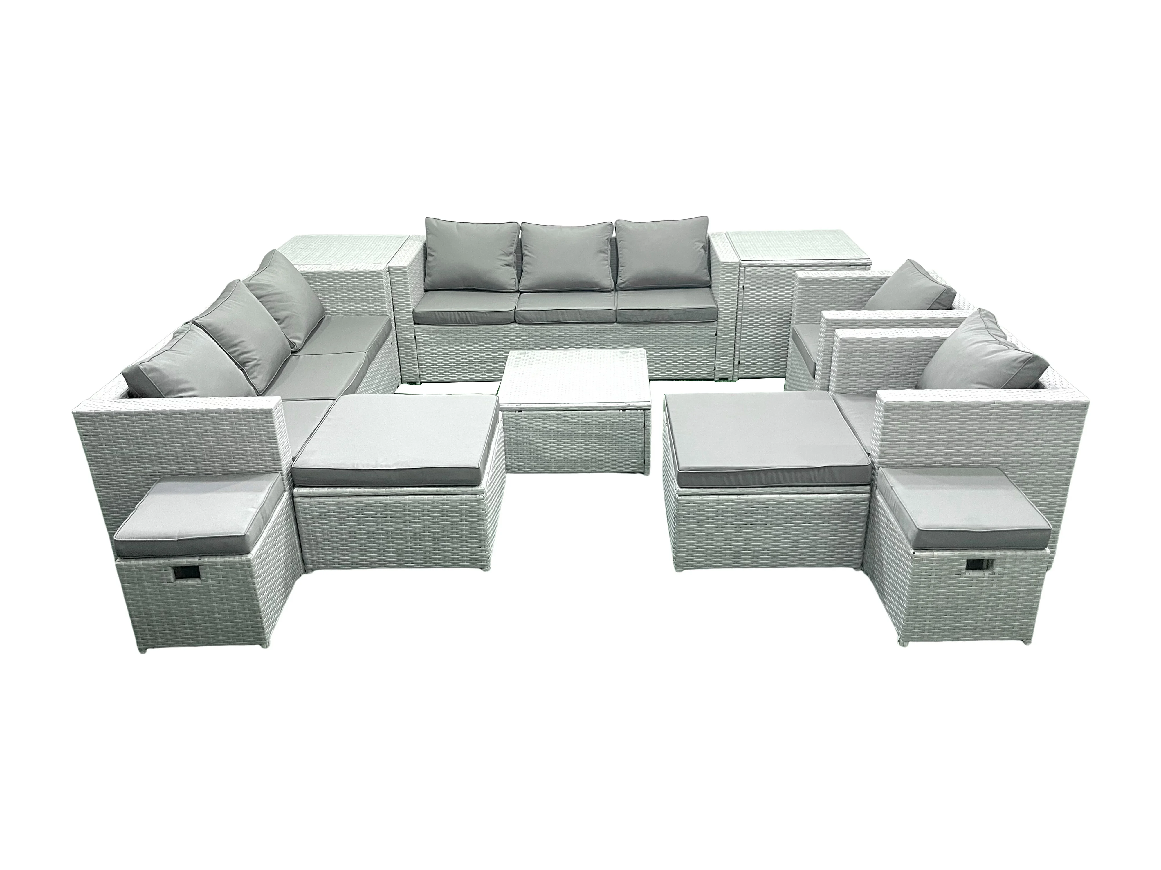 Gartenmöbel-Set 12-Sitzer Polyrattan Sofa Set mit 4 Hockern 2 Beistelltischen Hellgrau gemischt