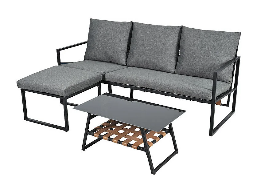 Gartenmöbel-Set - 3-Sitzer Sofa, Glastisch + Hocker - feuerverzinkter Stahl, Grau