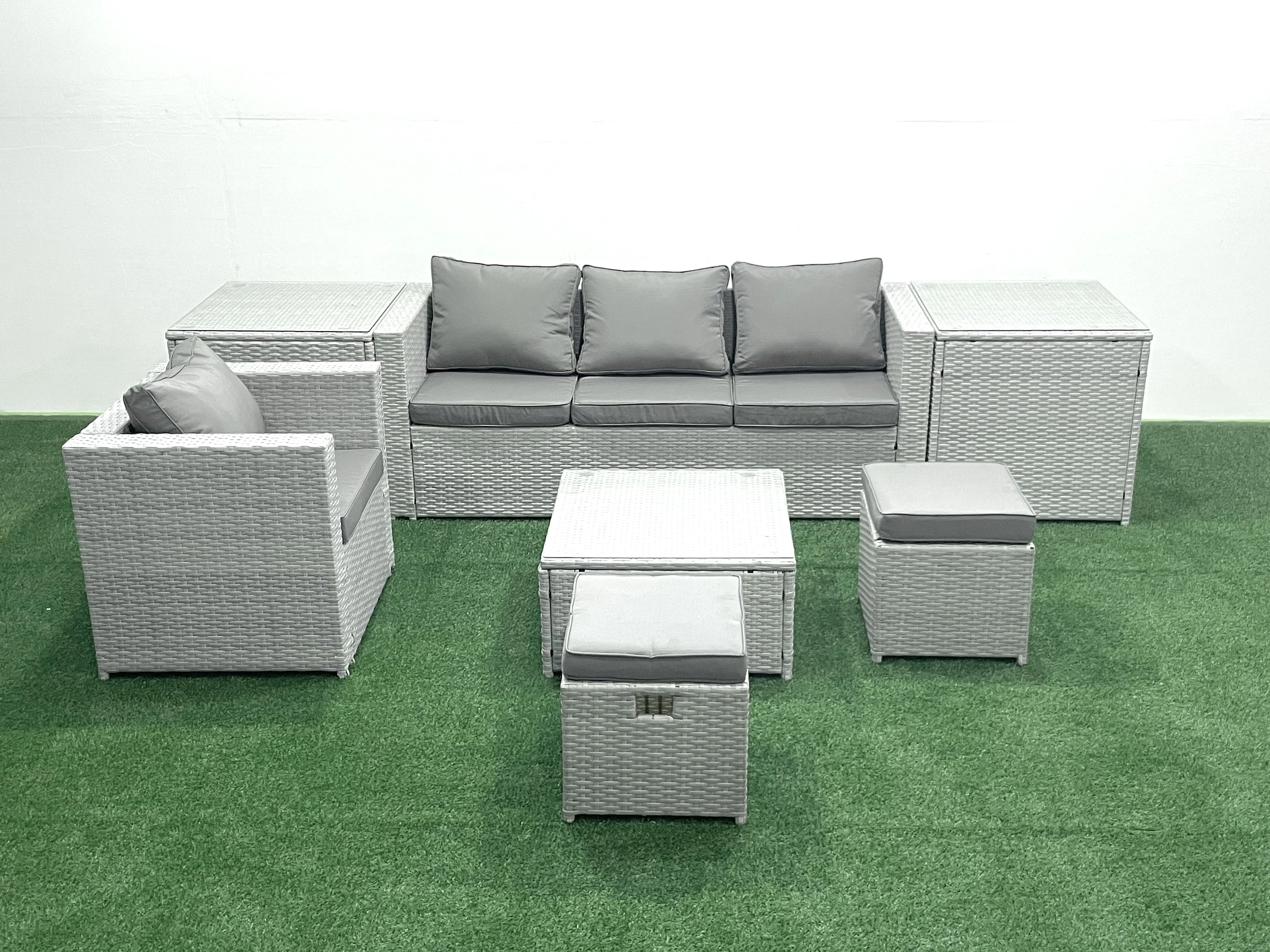 Gartenmöbel-Set 6-Sitzer Polyrattan Sofa Set mit 2 Großer Hockern Sessel 2 Beistelltischen Hellgrau gemischt