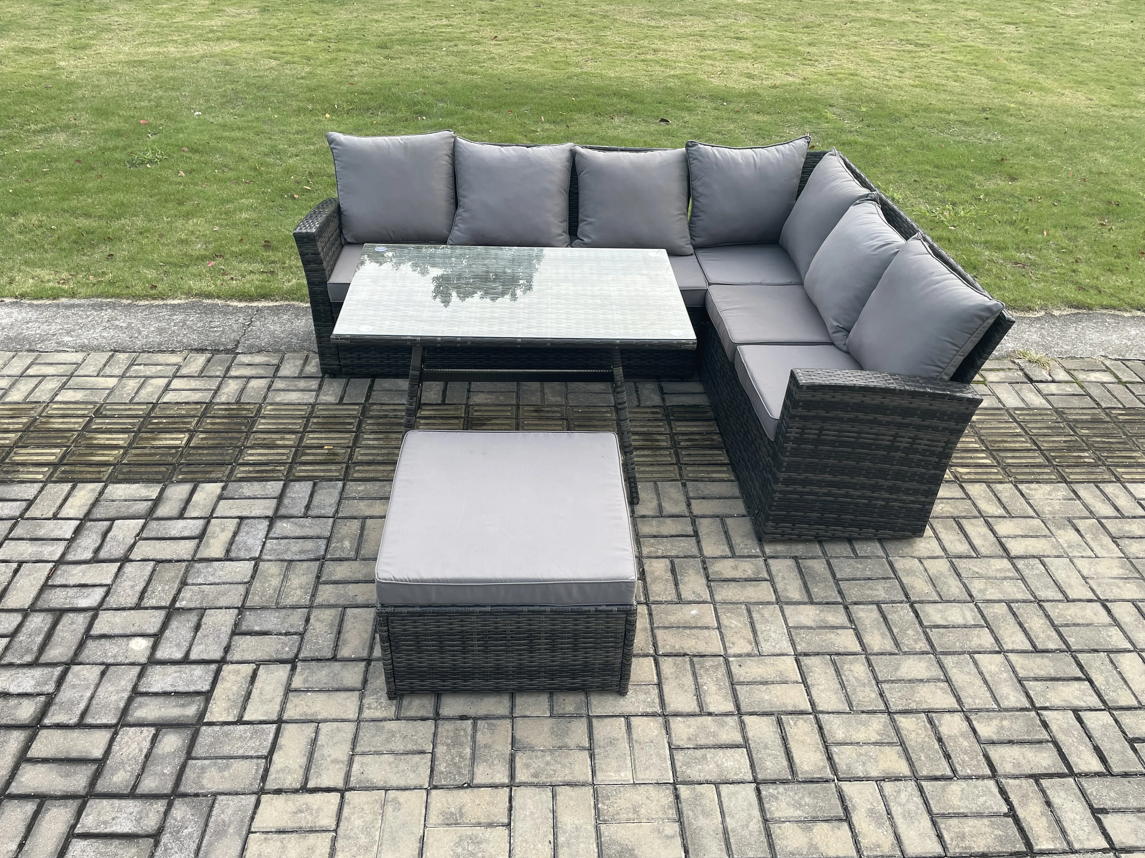 Gartenmöbel-Set Rattan Ecksofa Esstisch Set mit 2 Großer Hockern 7-Sitzer Dunkelgrau Gemischt