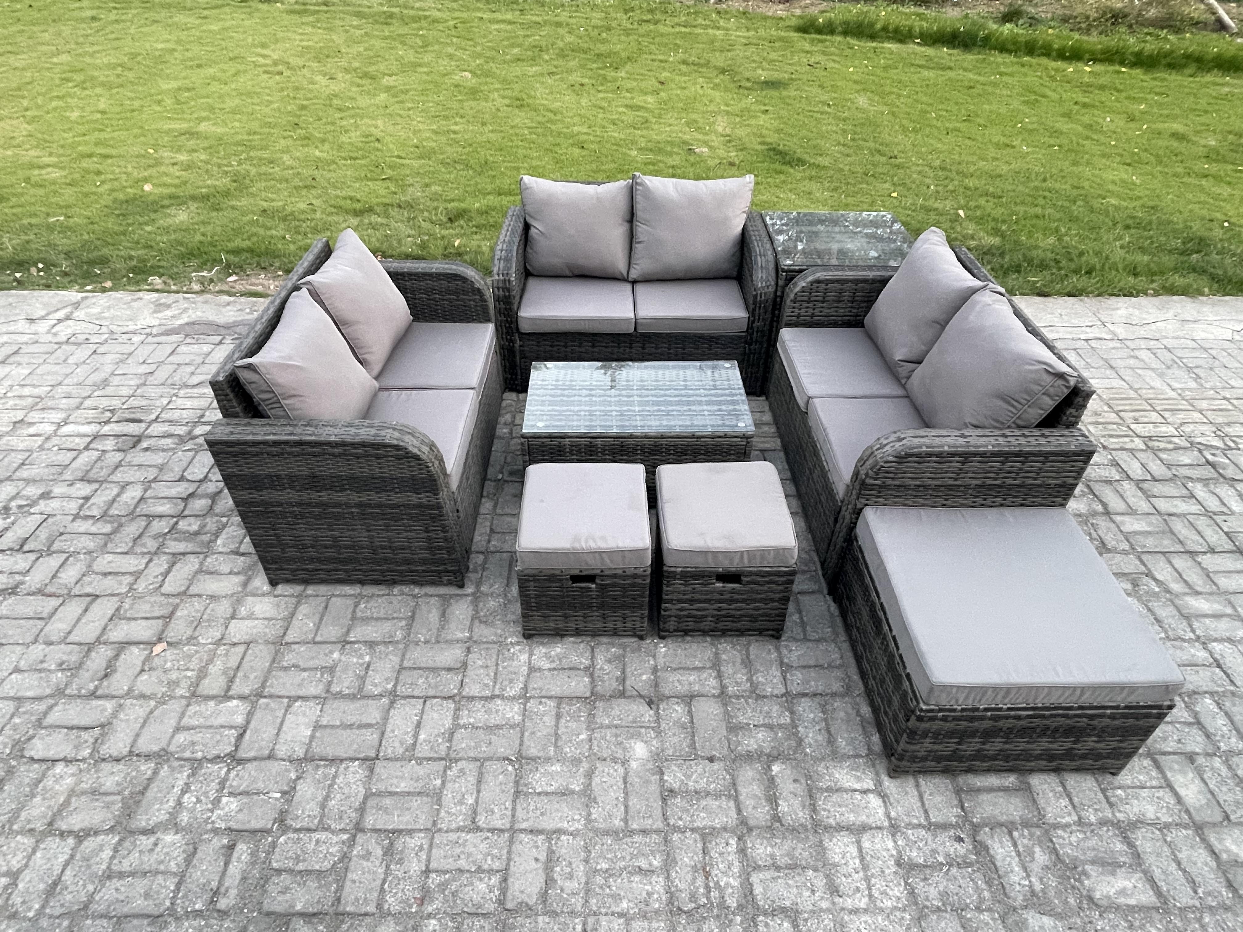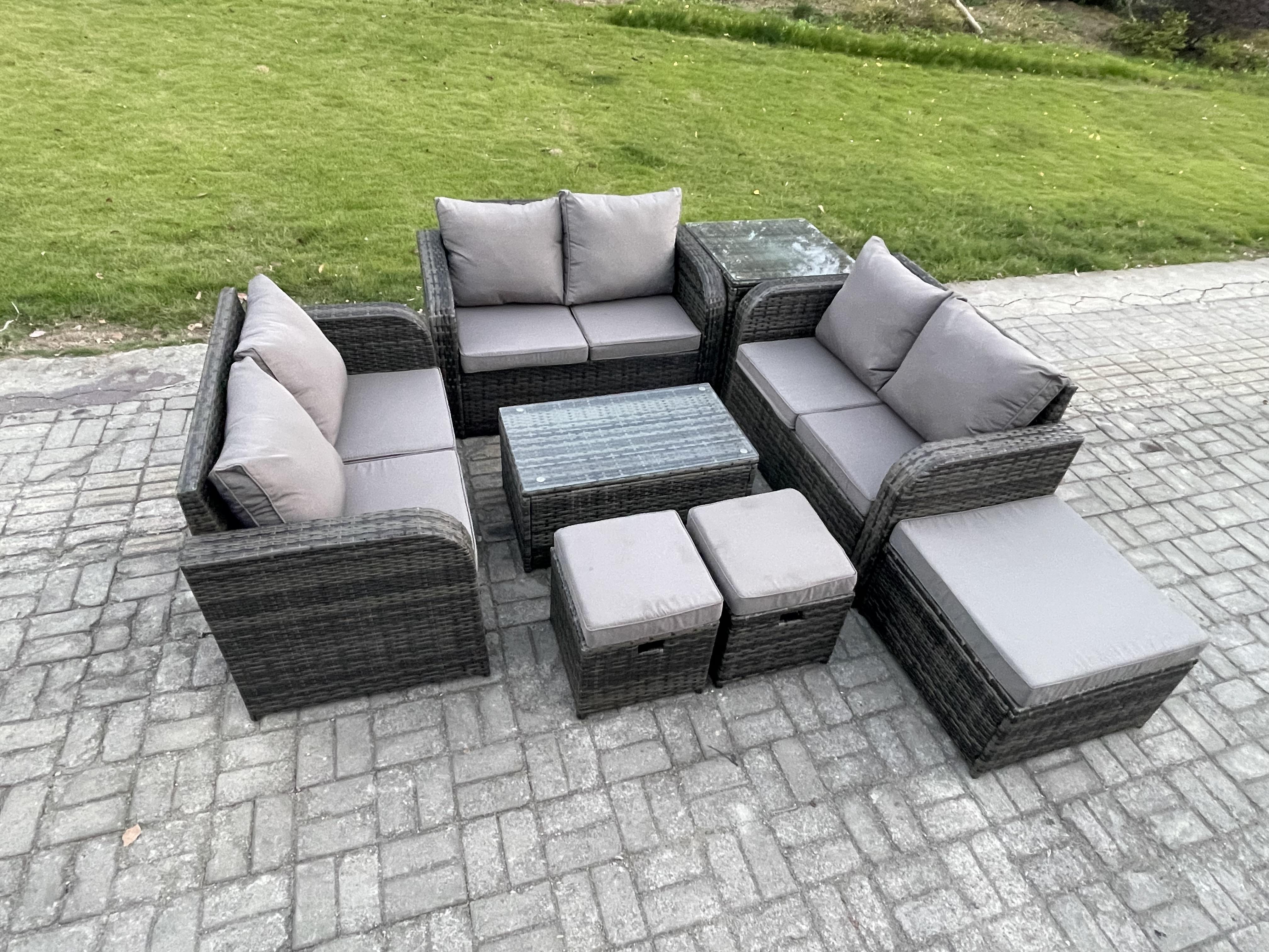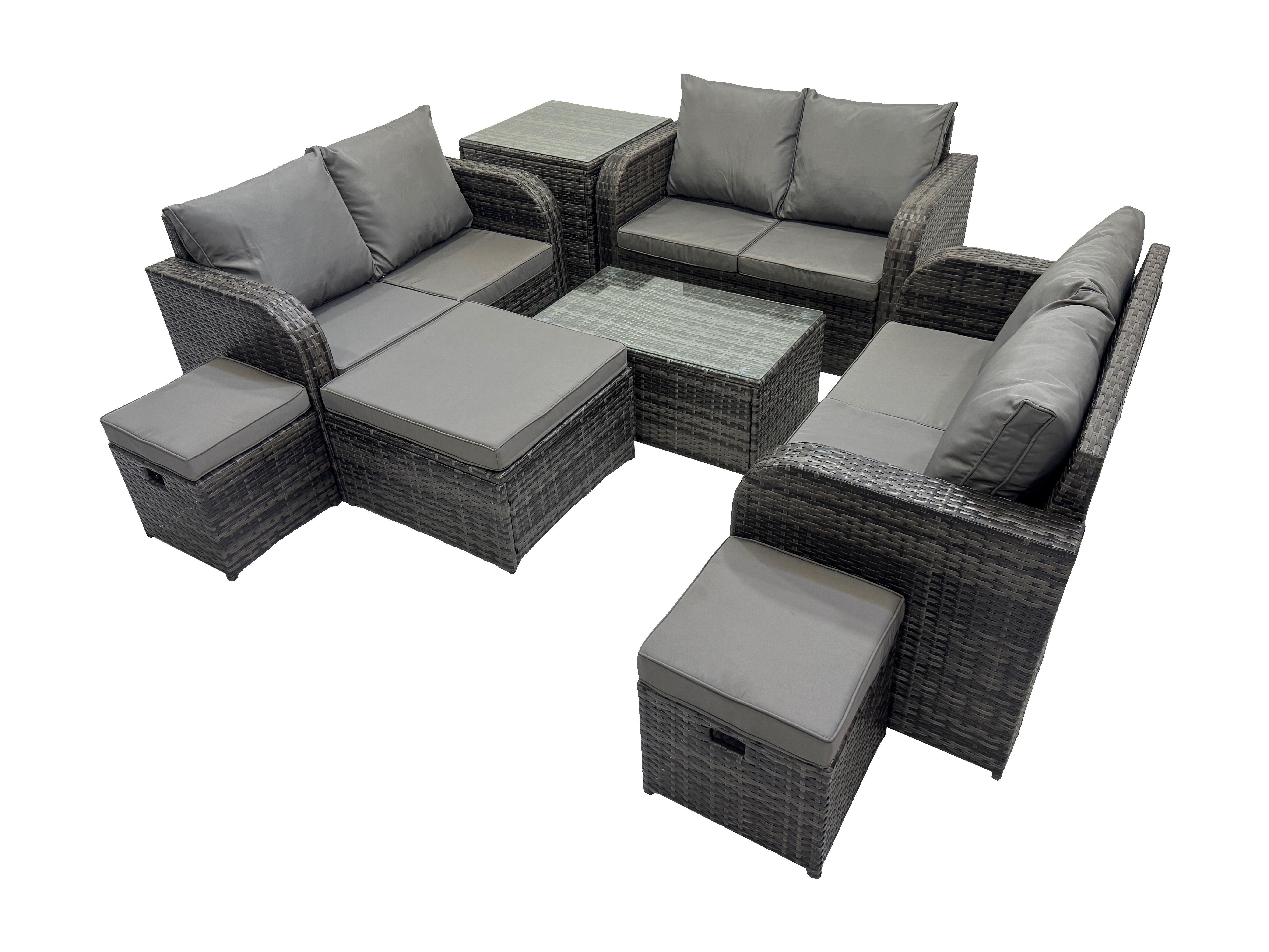 Gartenmöbel-Sets 9-Sitzer Polyrattan Möbel Sofa Sets mit Rechteckiger Couchtisch Love Sofa 3 Hockern Beistelltisch Dunkelgrau Gemischt