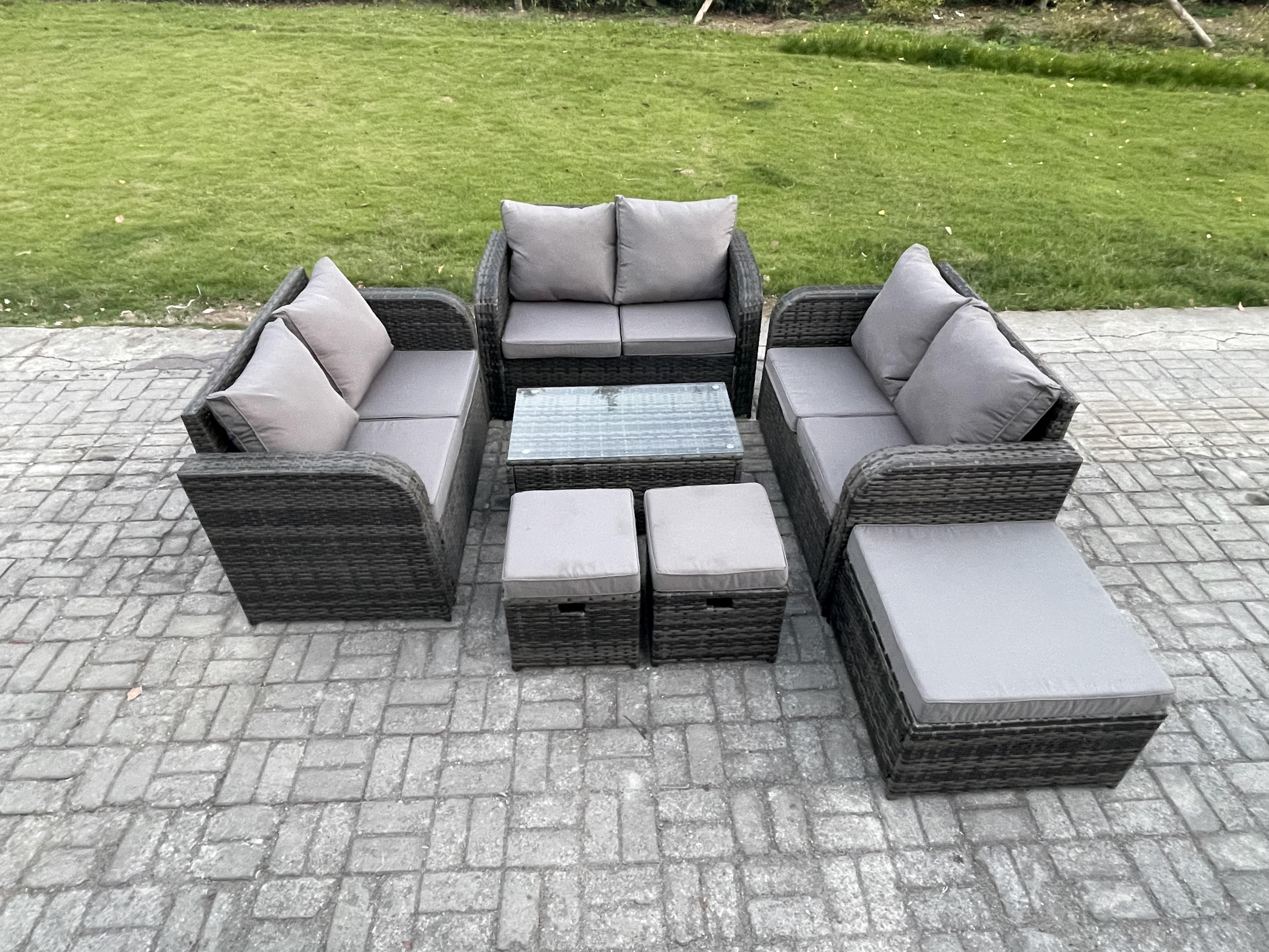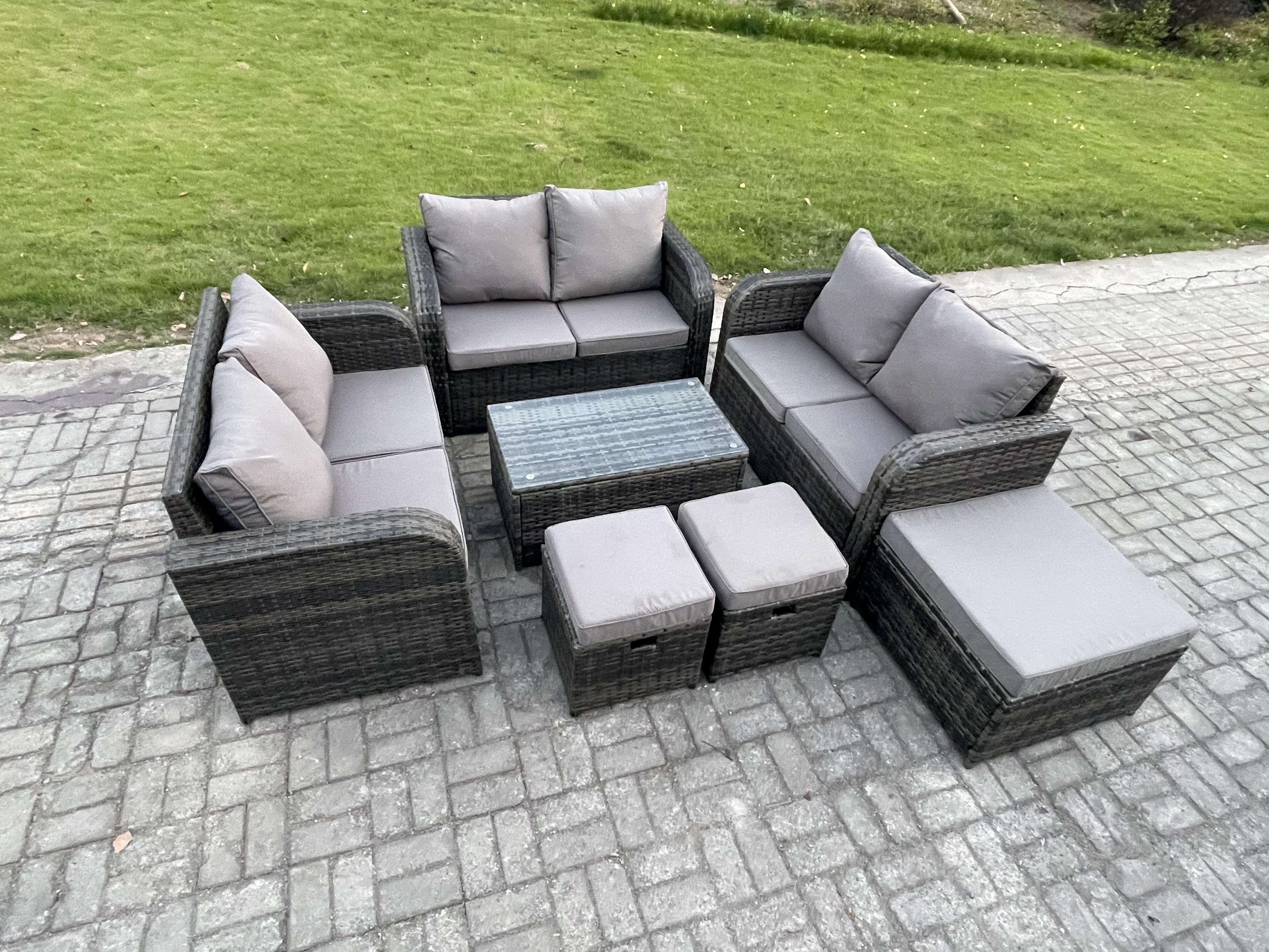 Gartenmöbel-Sets 9-Sitzer Polyrattan Möbel Sofa Sets mit Rechteckiger Couchtisch Love Sofa 3 Hockern Dunkelgrau Gemischt
