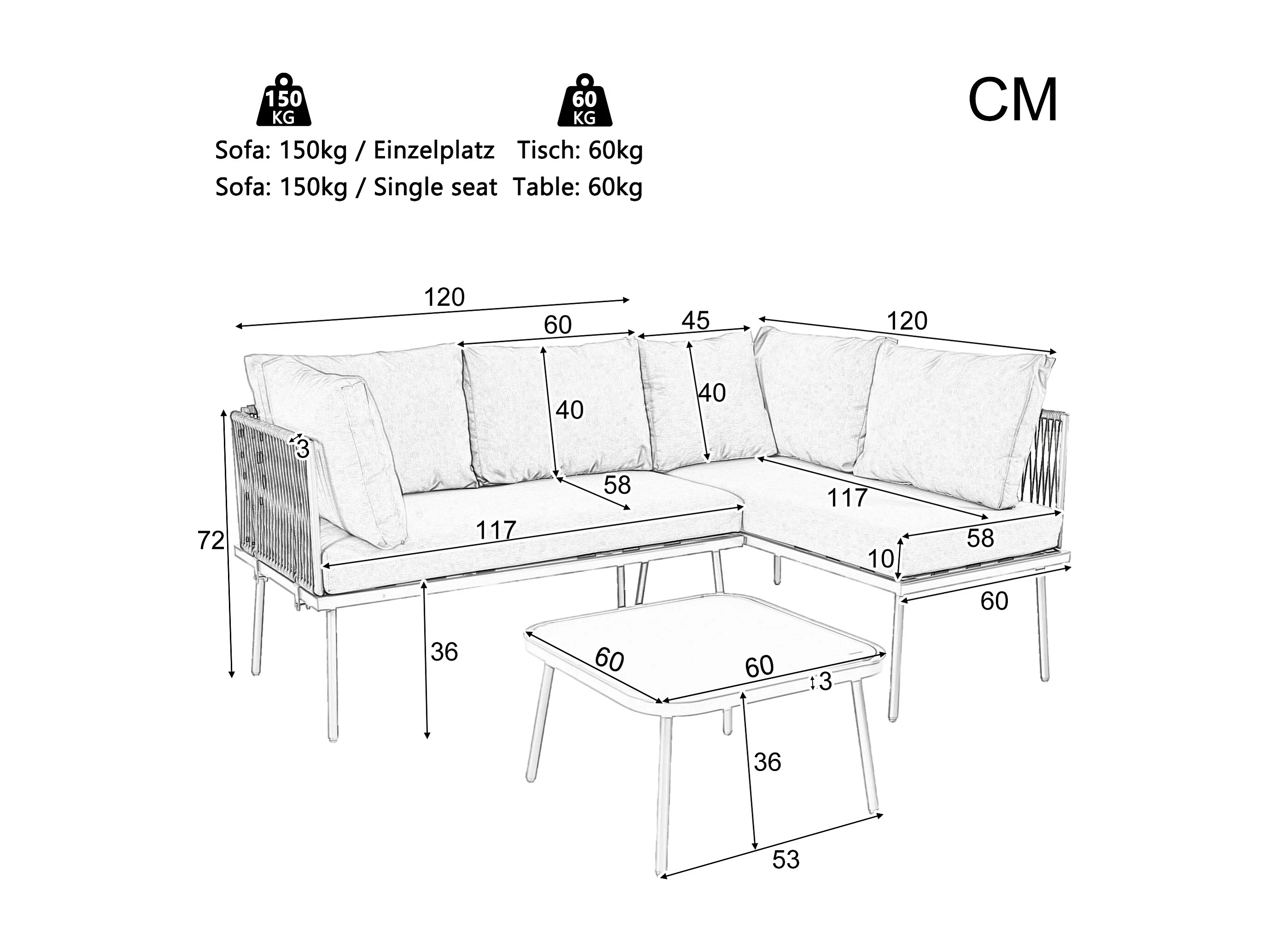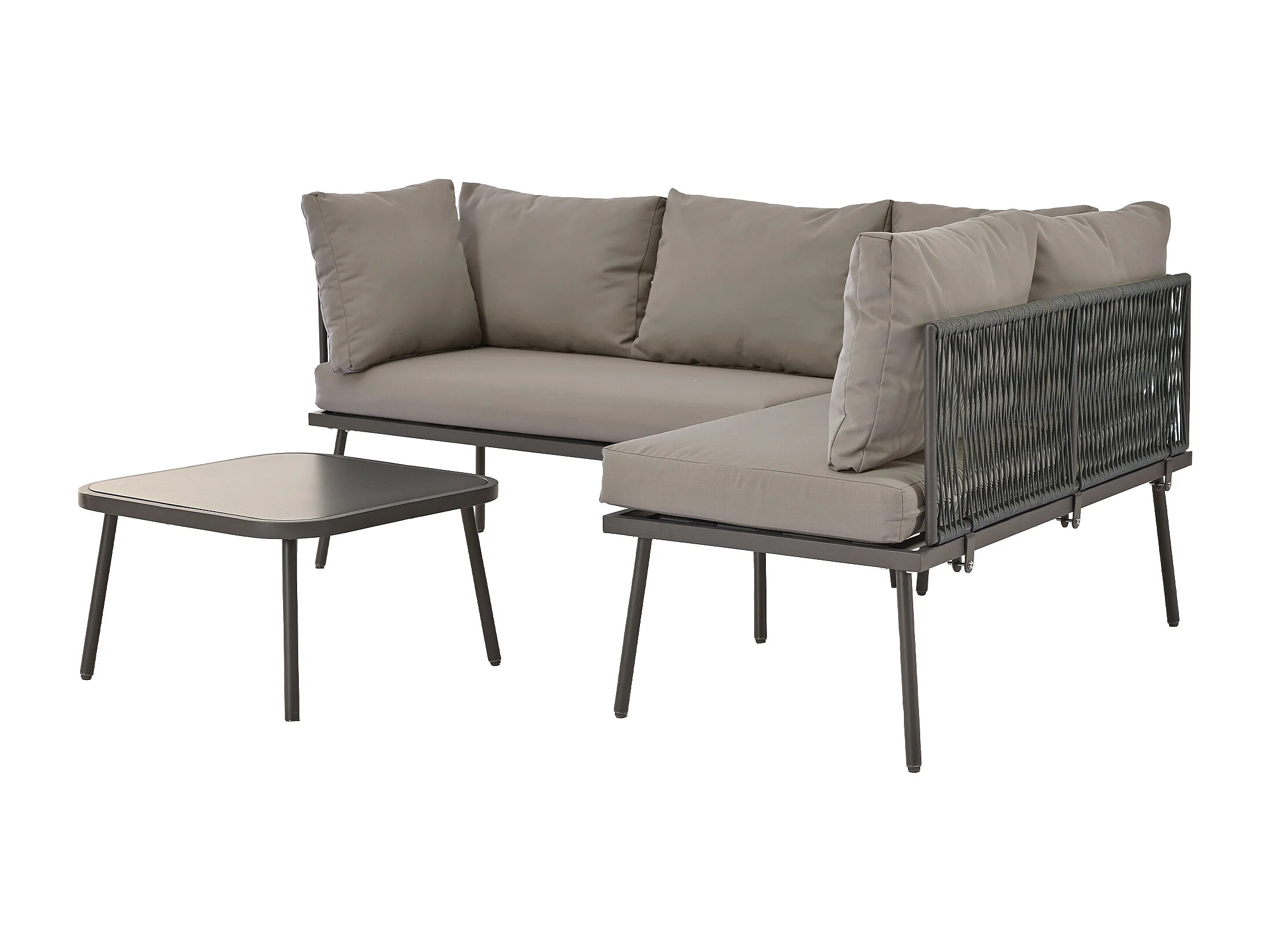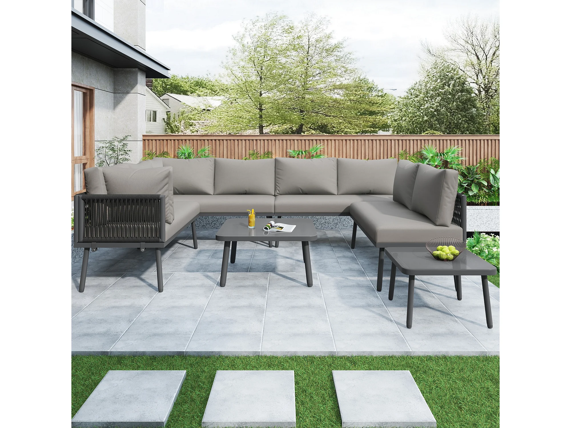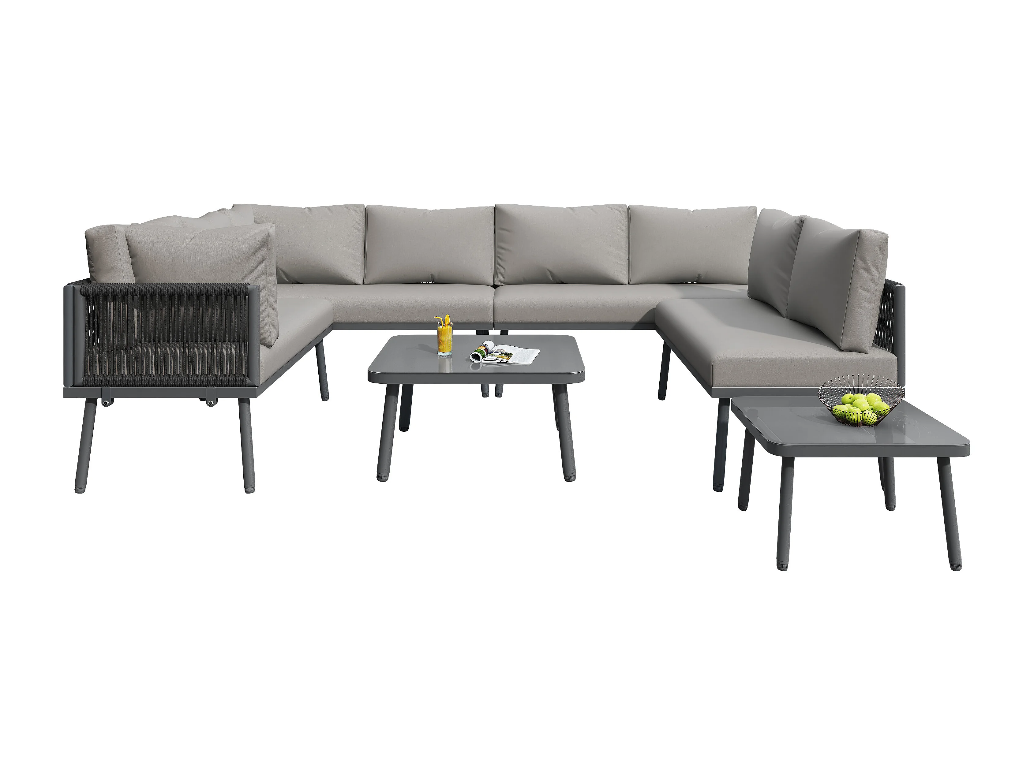 Gartenmöbelgarnitur bestehend aus zwei Tischen und vier Zweisitzersofas mit Kissen, grau