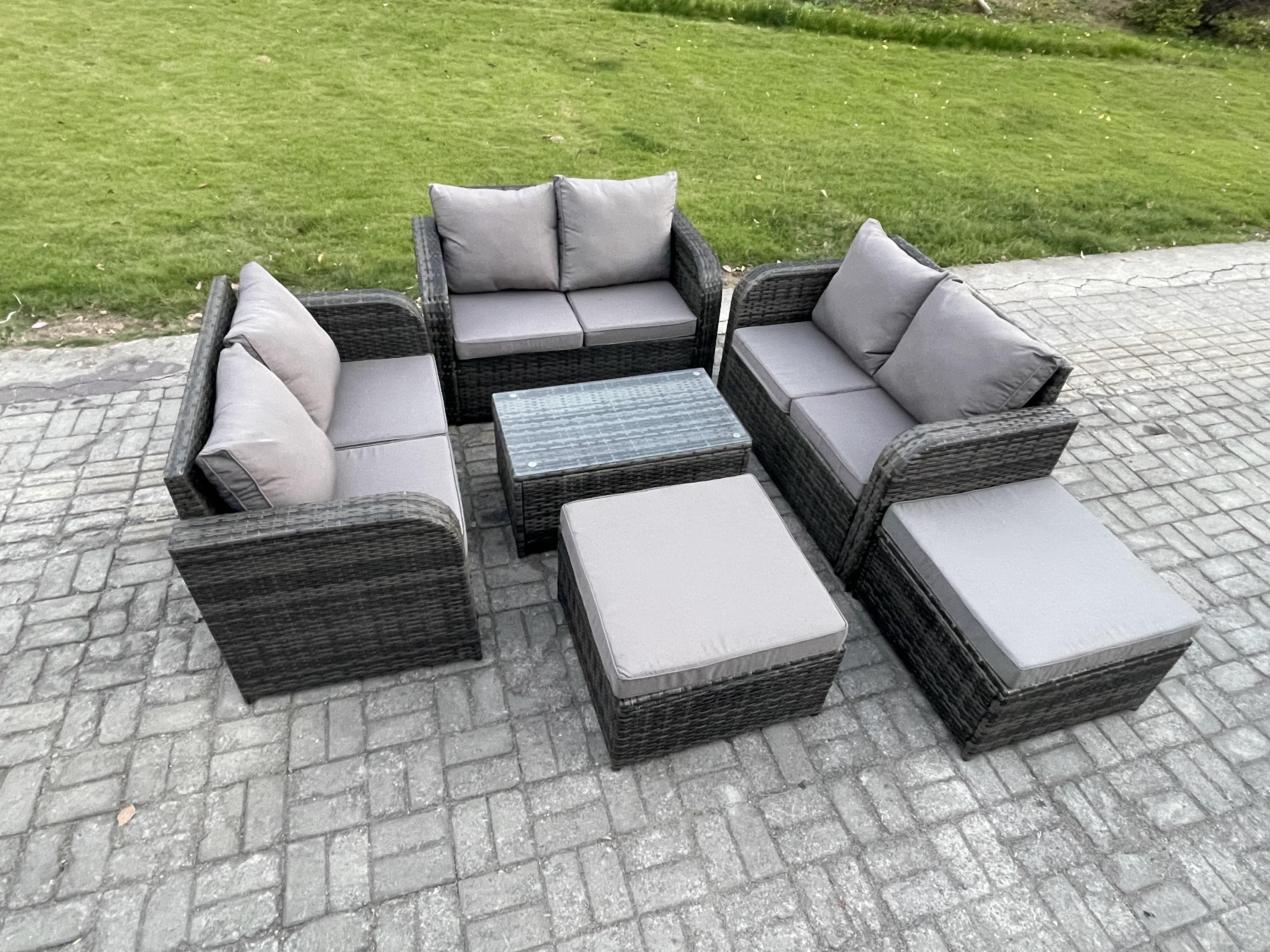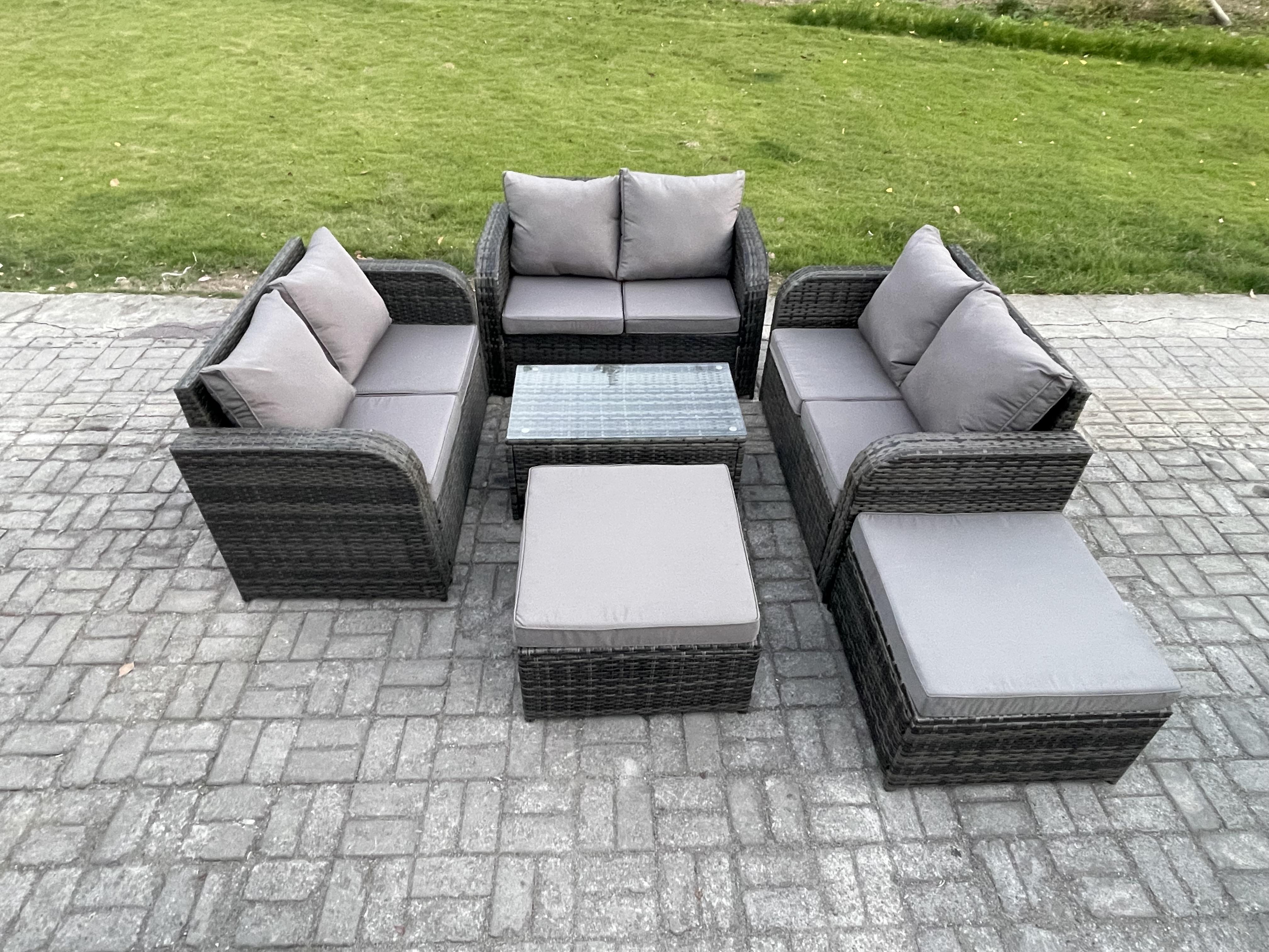 Gartenmöbelset Rattan Garten Sofa im Freien Sessel mit Gehärteter Glastisch 2 hohen Hockern Dunkelgrau Gemischt