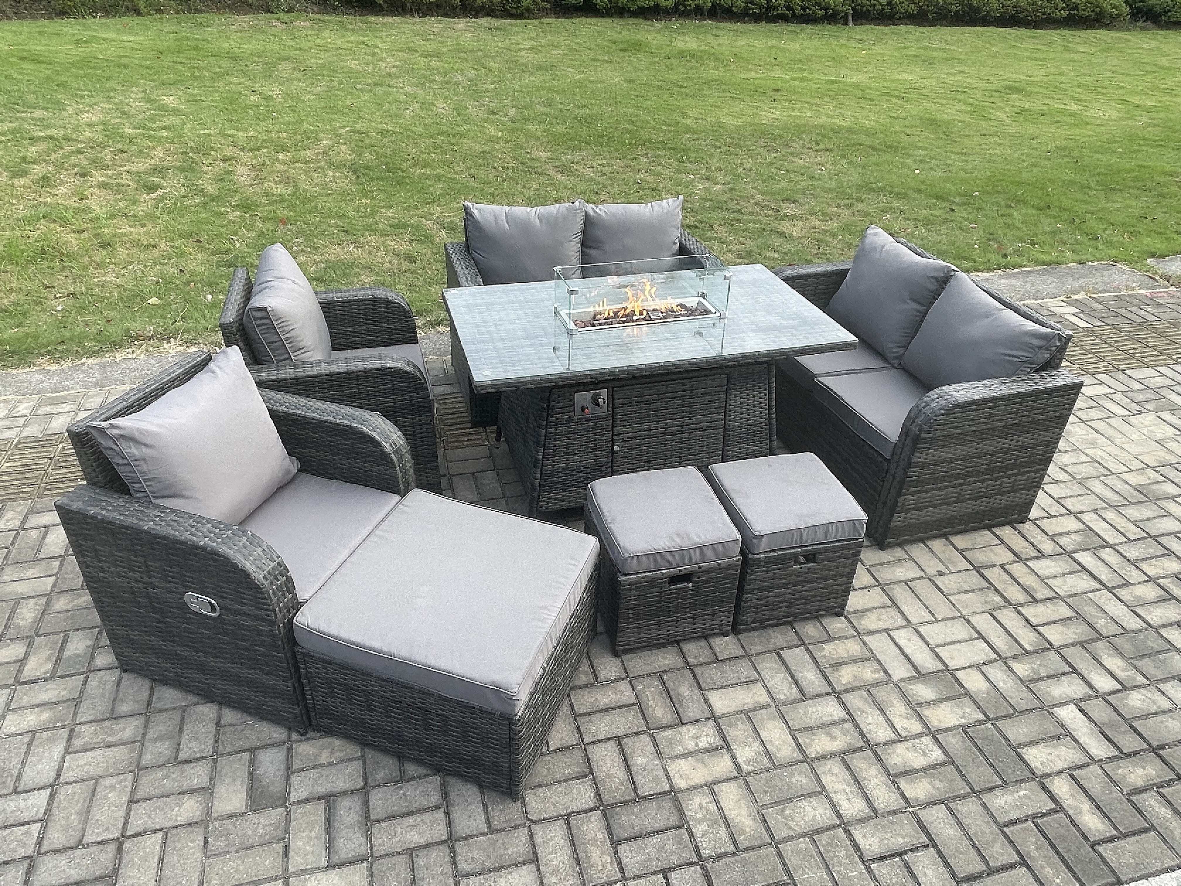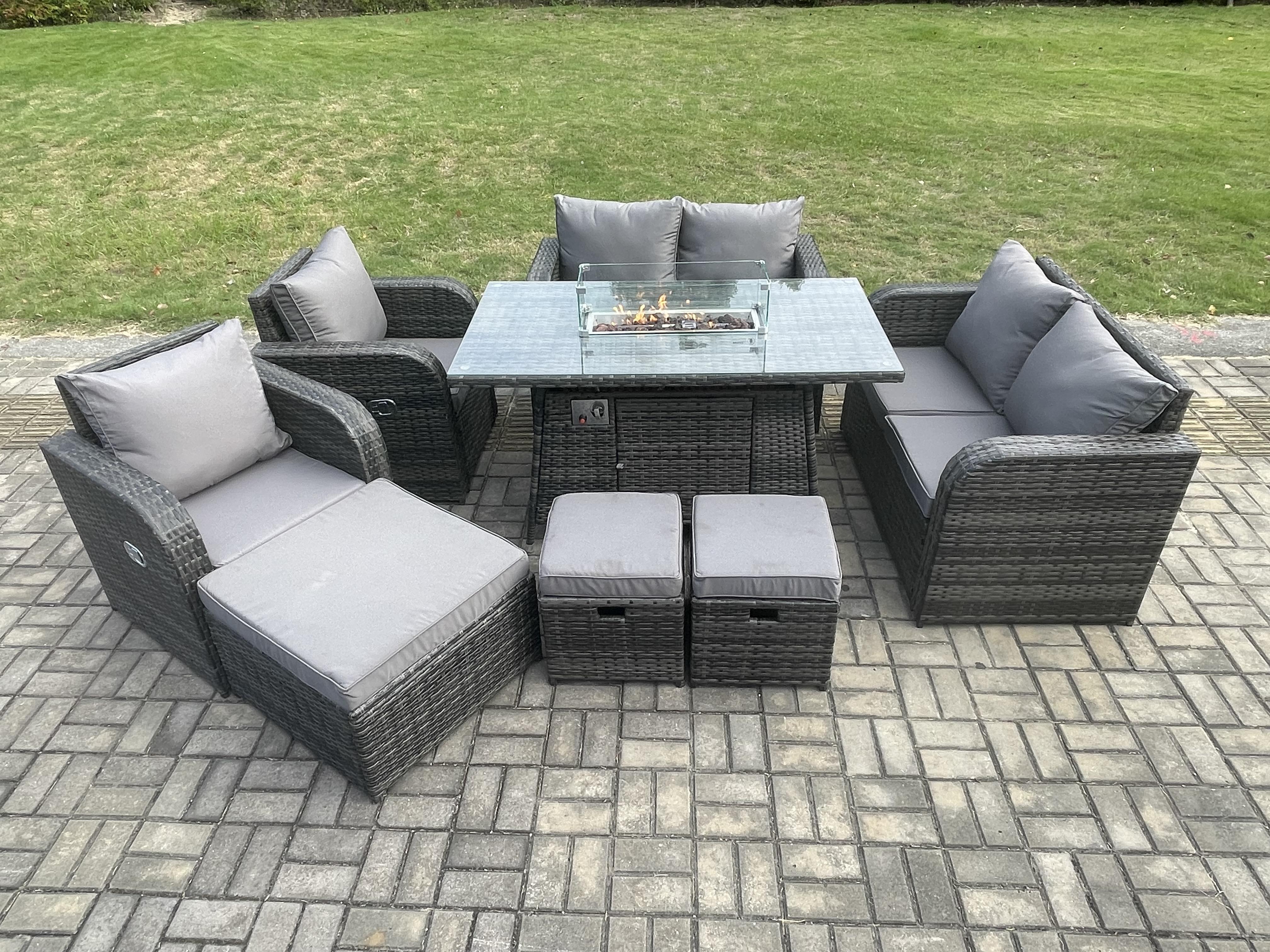 Gartensofa Garnitur mit Gas Feuerstelle 9-Sitzer Dunkelgrau