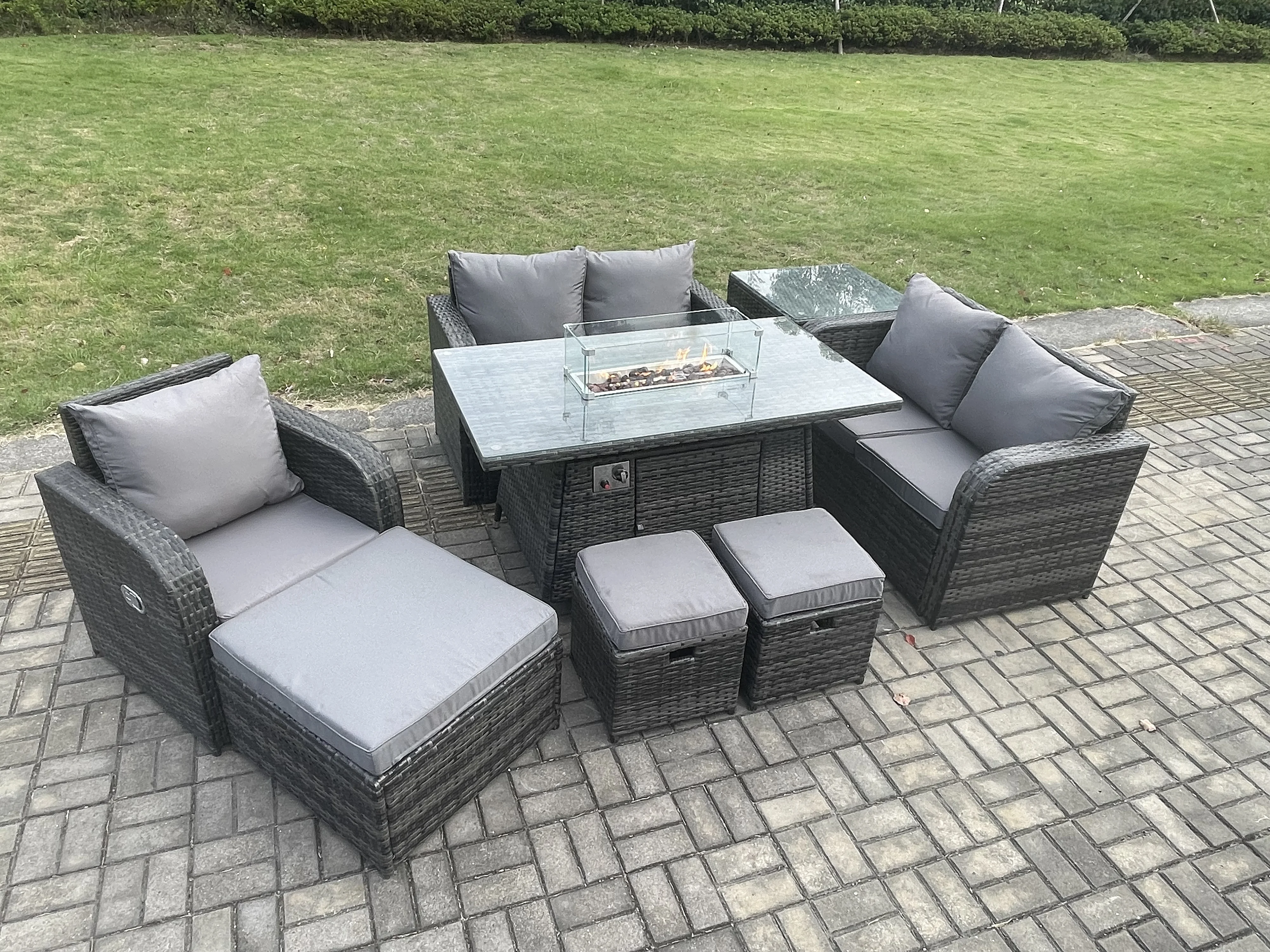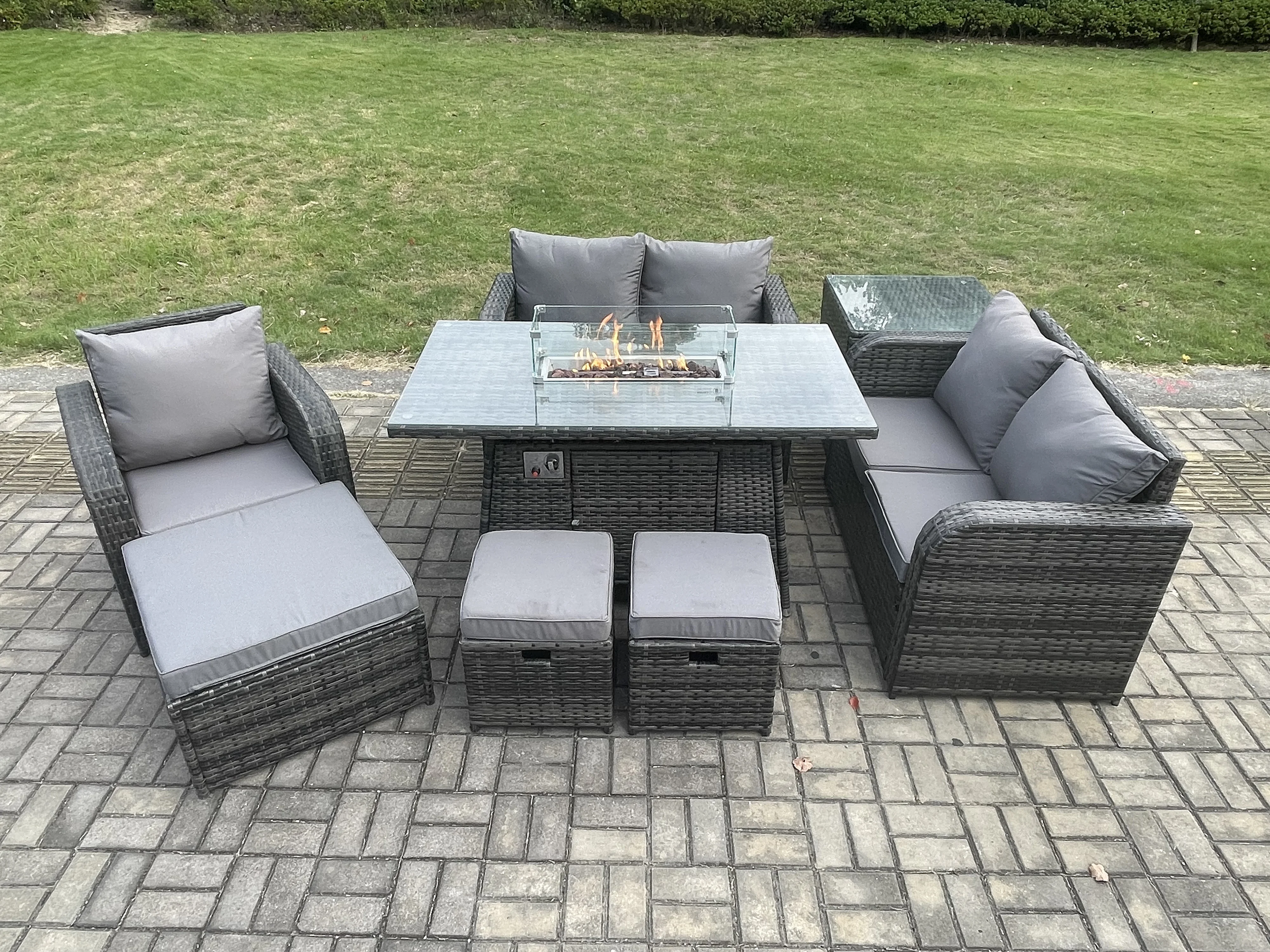 Gartensofa Set mit Gas Feuertisch Dunkelgrau 8-Sitzer