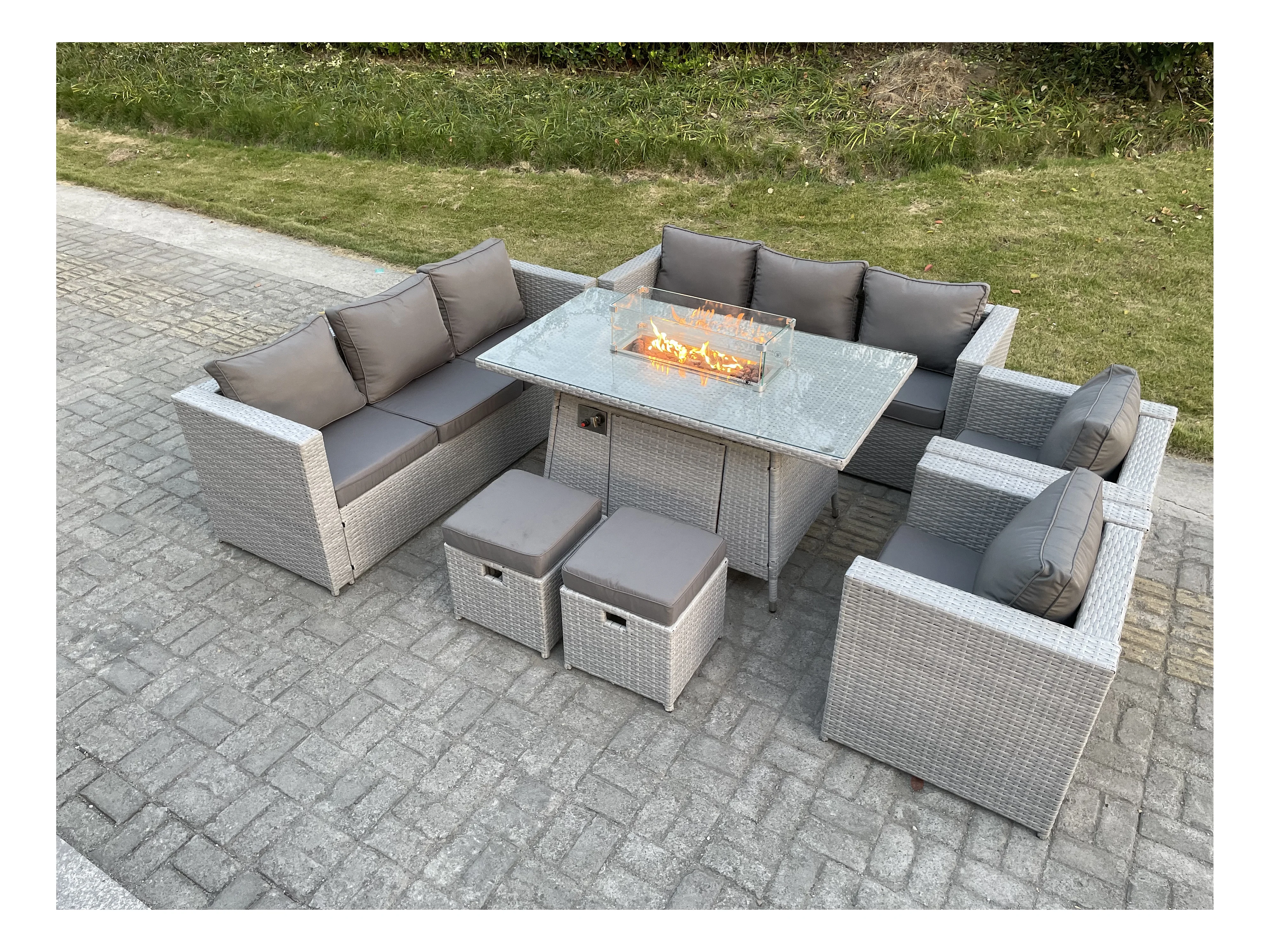 Gas Feuertisch für den Außenbereich Rattan Gartenmöbel Set mit 2 Sofa 2 Sessel 2 Kleiner Hocker Gas Feuerstelle Helles Grau