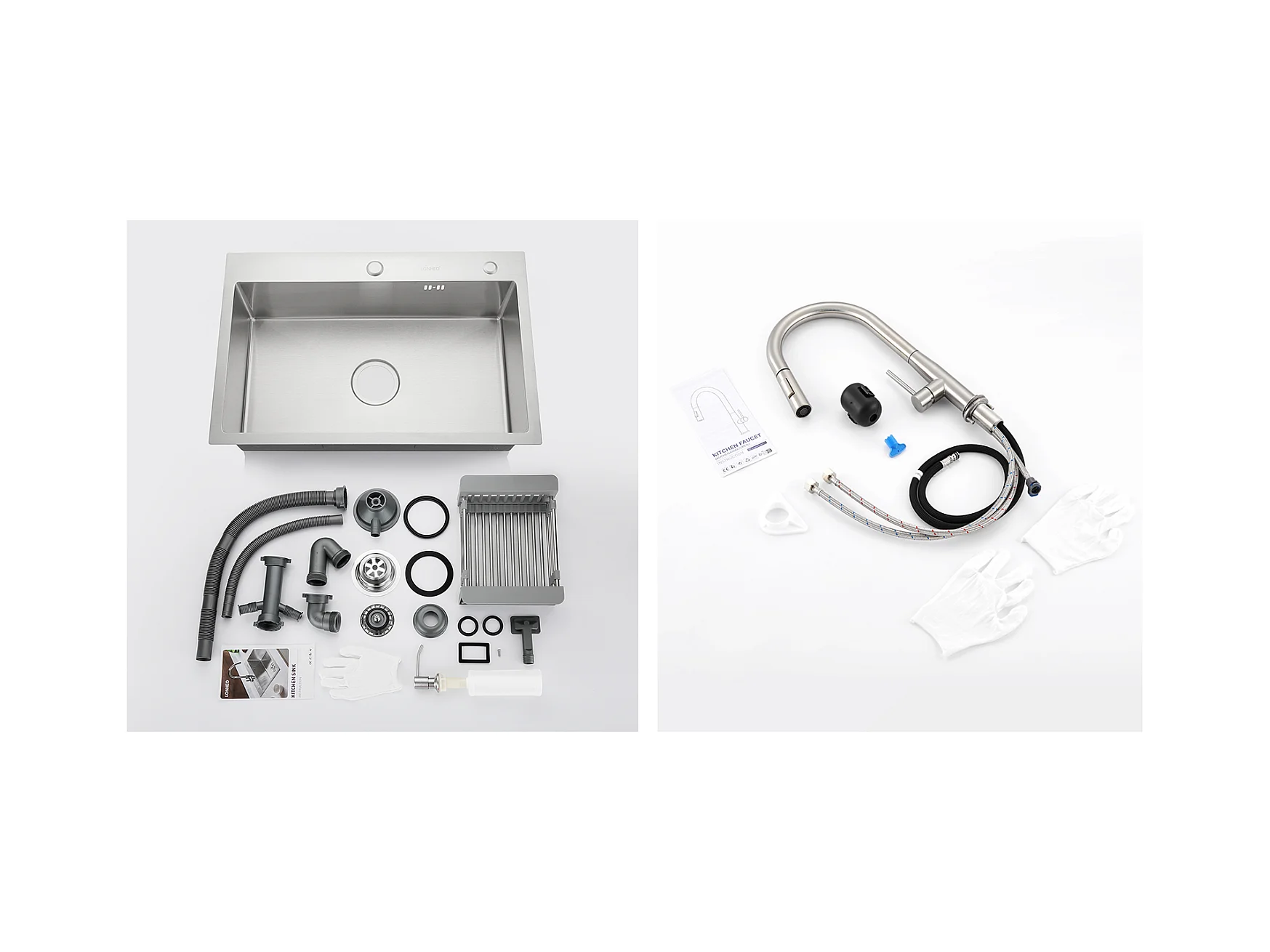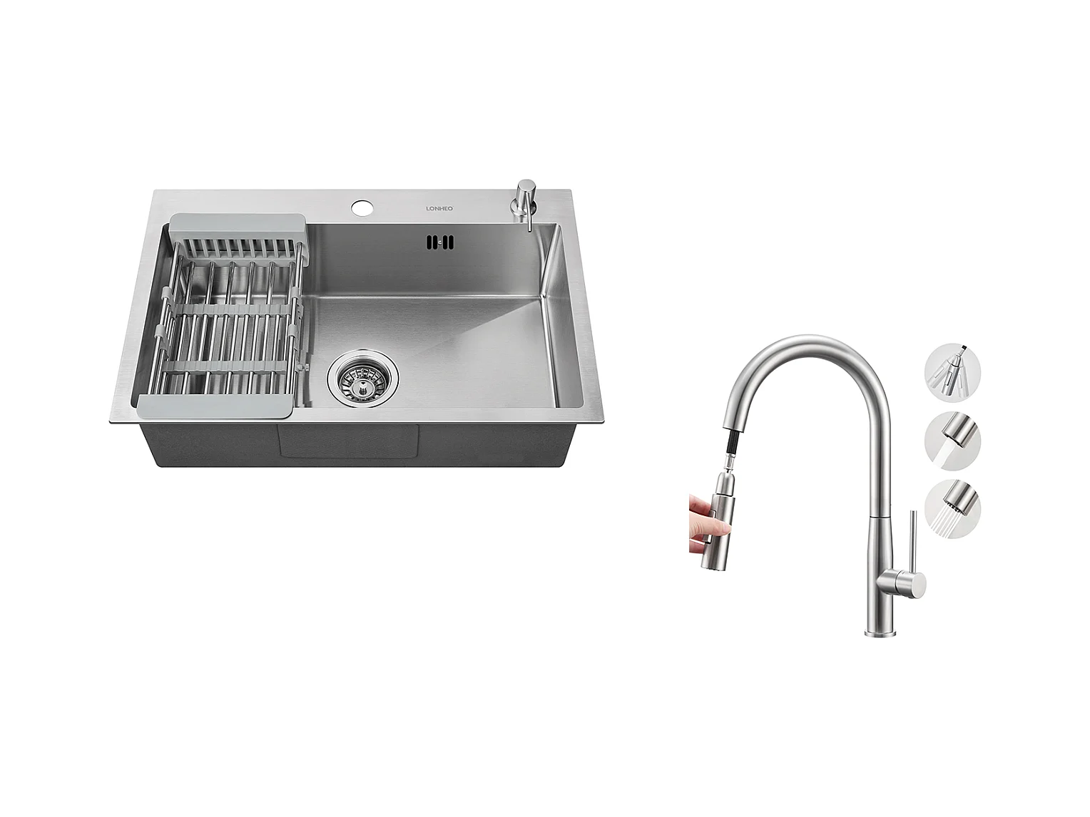 Gebürstete Küchenspüle 68 x 45 x 19 cm mit Seifenspender, Abtropfkorb + Küchenmixer, ausziehbarer Dusche, 2 Modi, Kalt-/Warmwasser, gebürstet