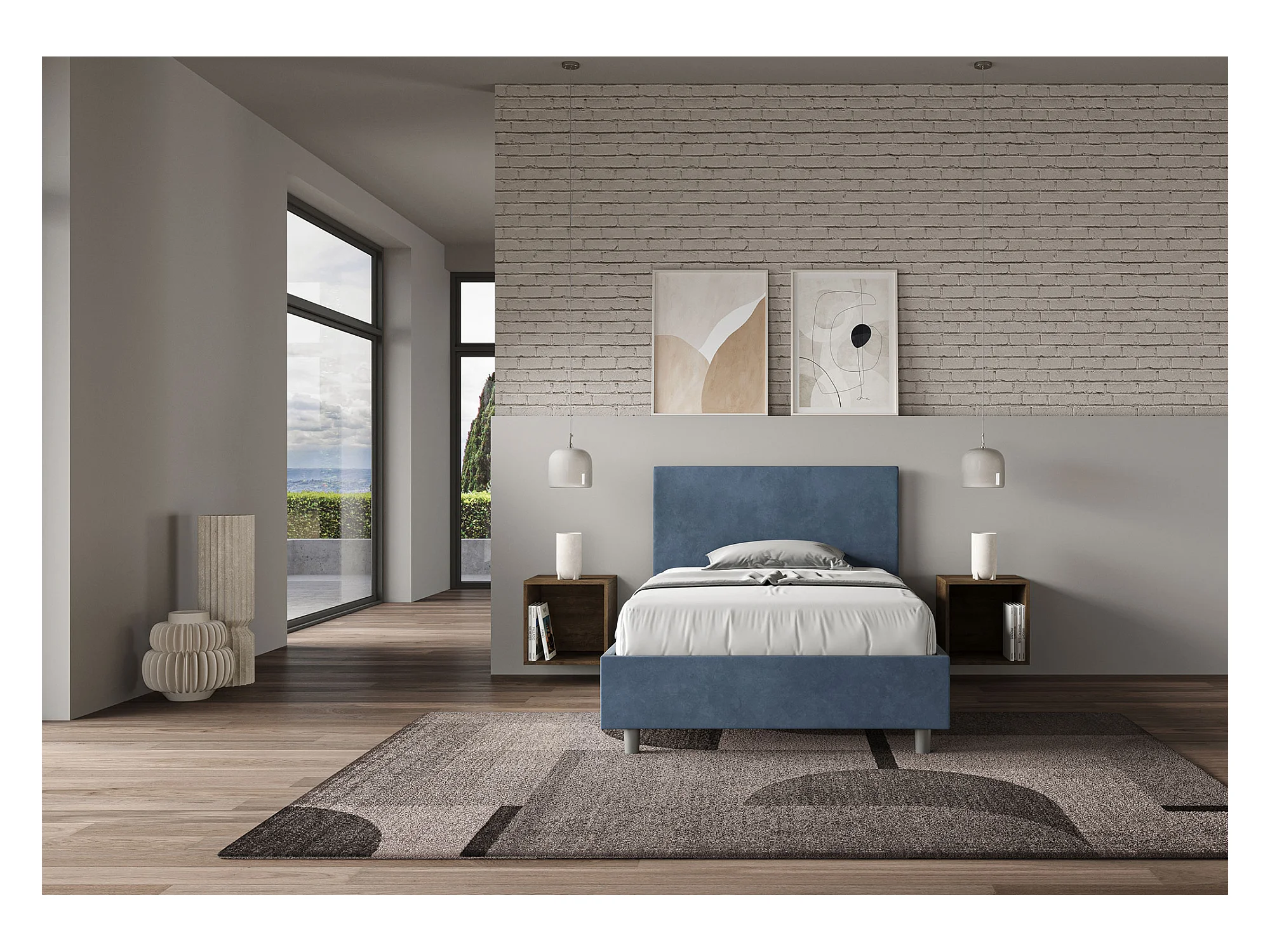 Blaues Mikrofaserbett Adele mit gepolstertem Untergestell 120x210