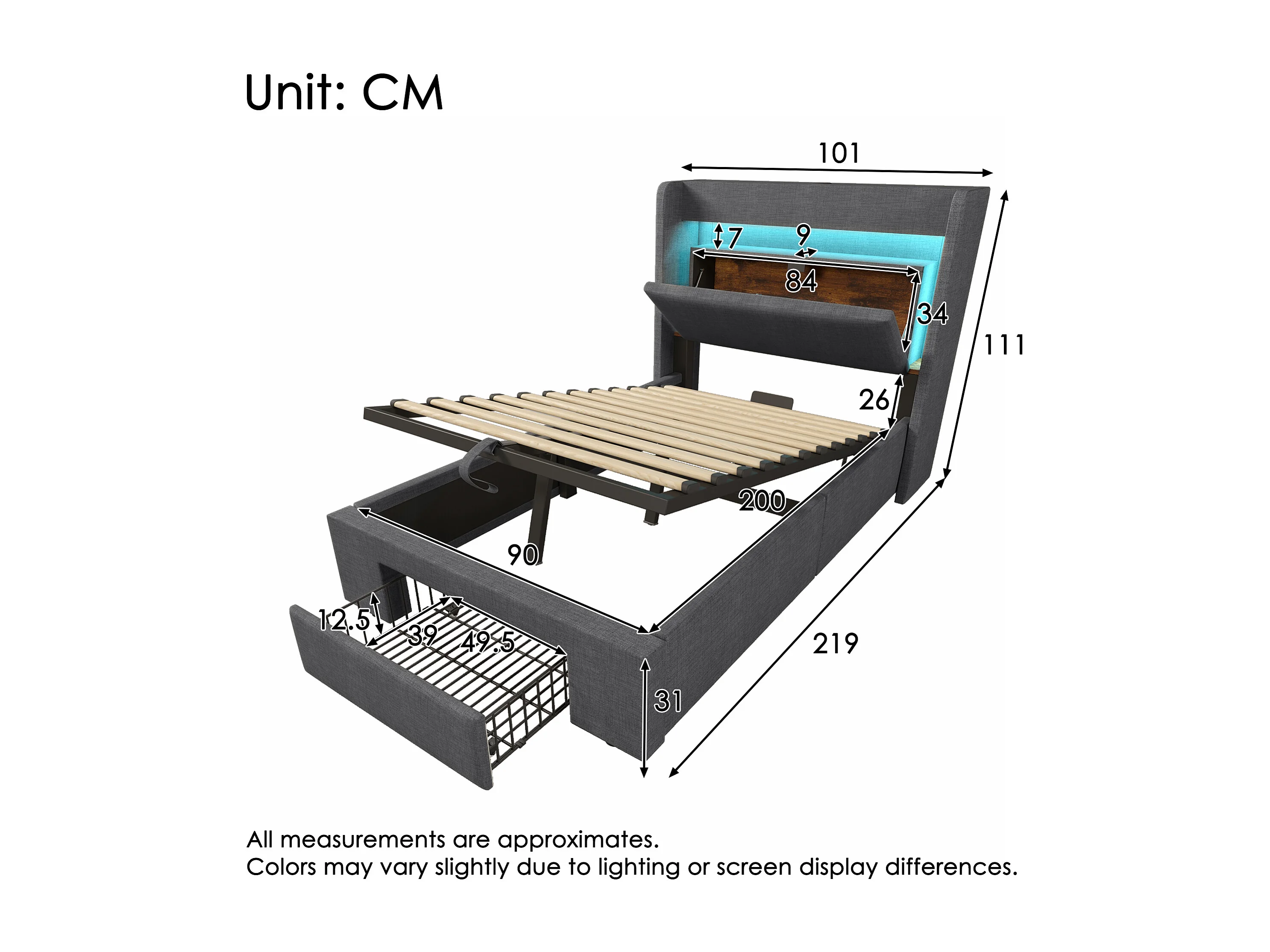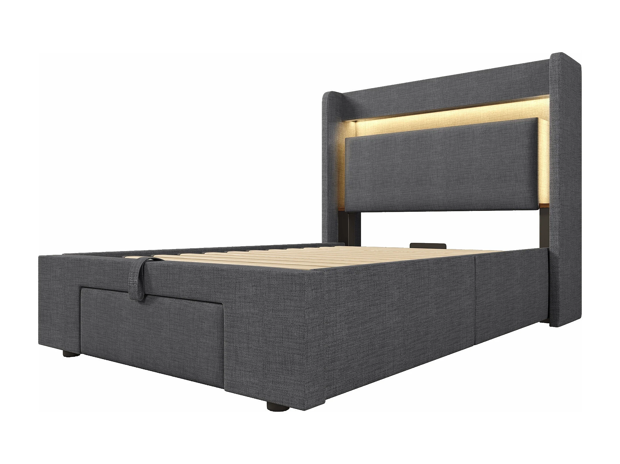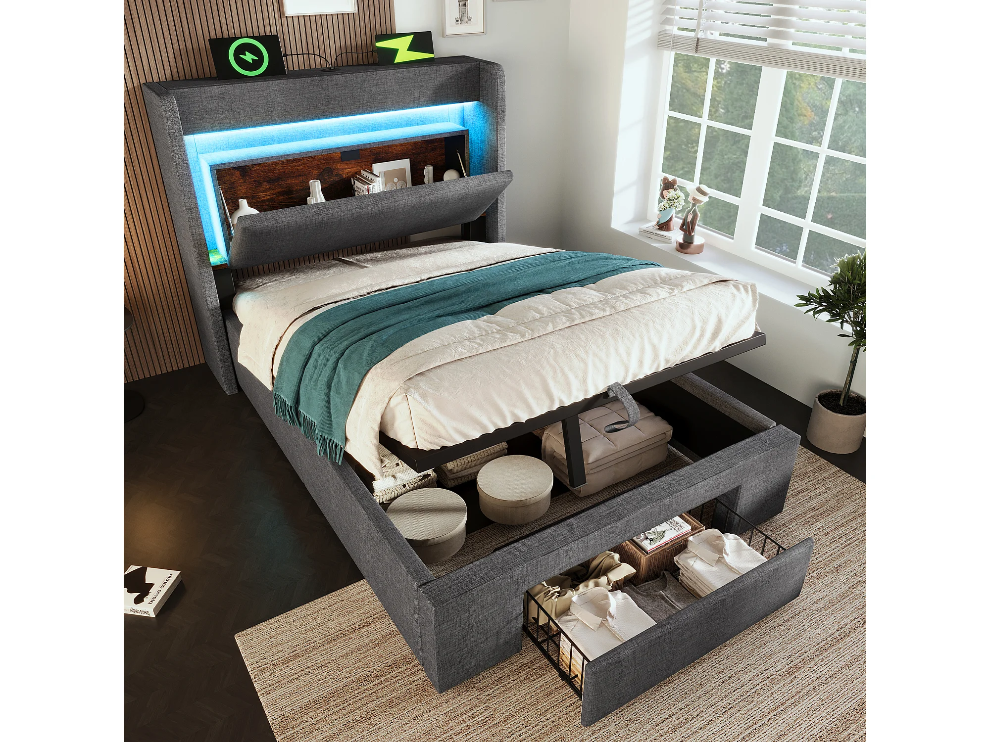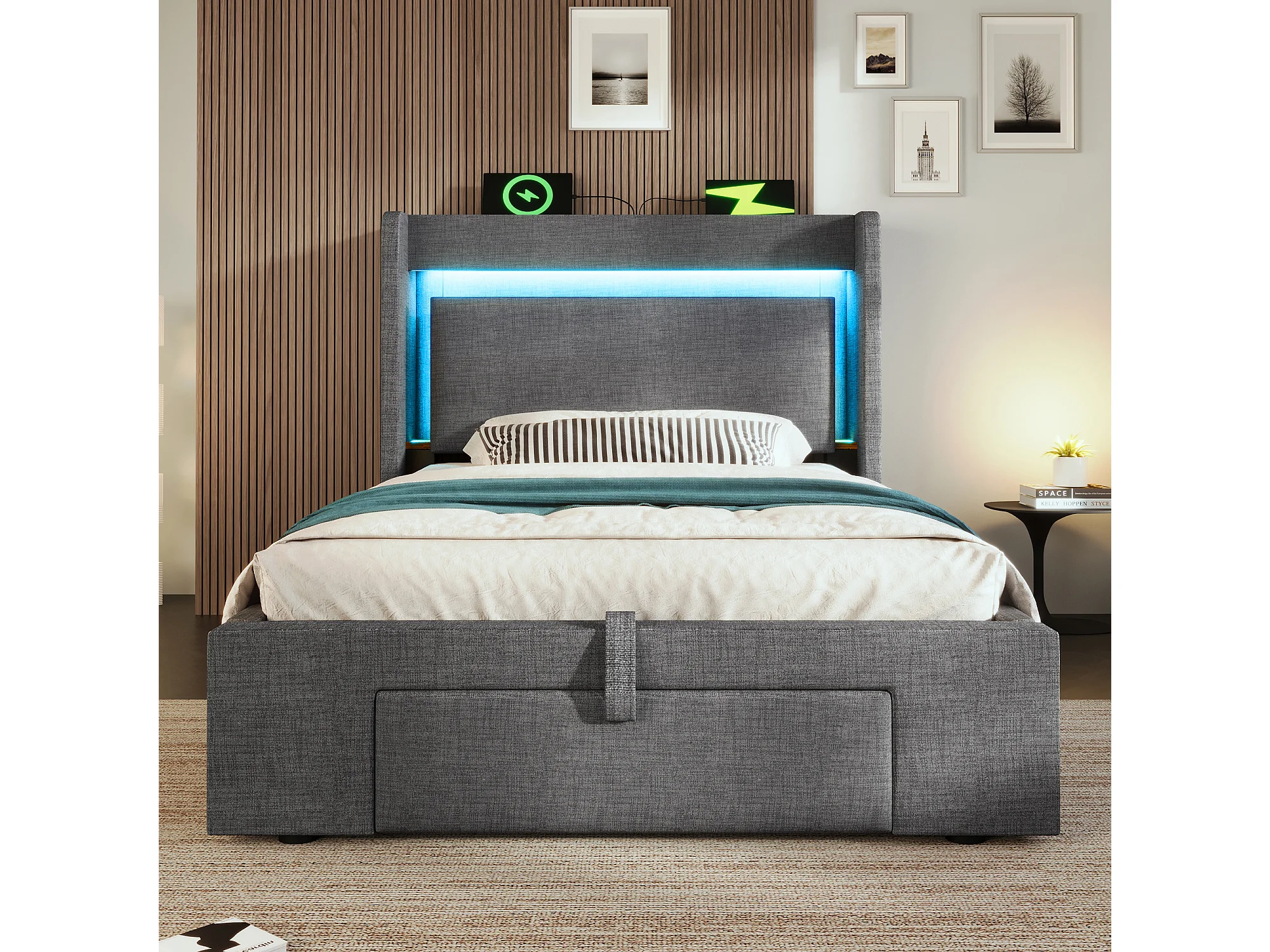 Gepolstertes Bett mit Stauraum 90x200cm - mit LED und USB-Anschluss - mit 1 Schublade - Kopfteil mit Stauraum - Leinen - Grau​ (ohne Matratze)