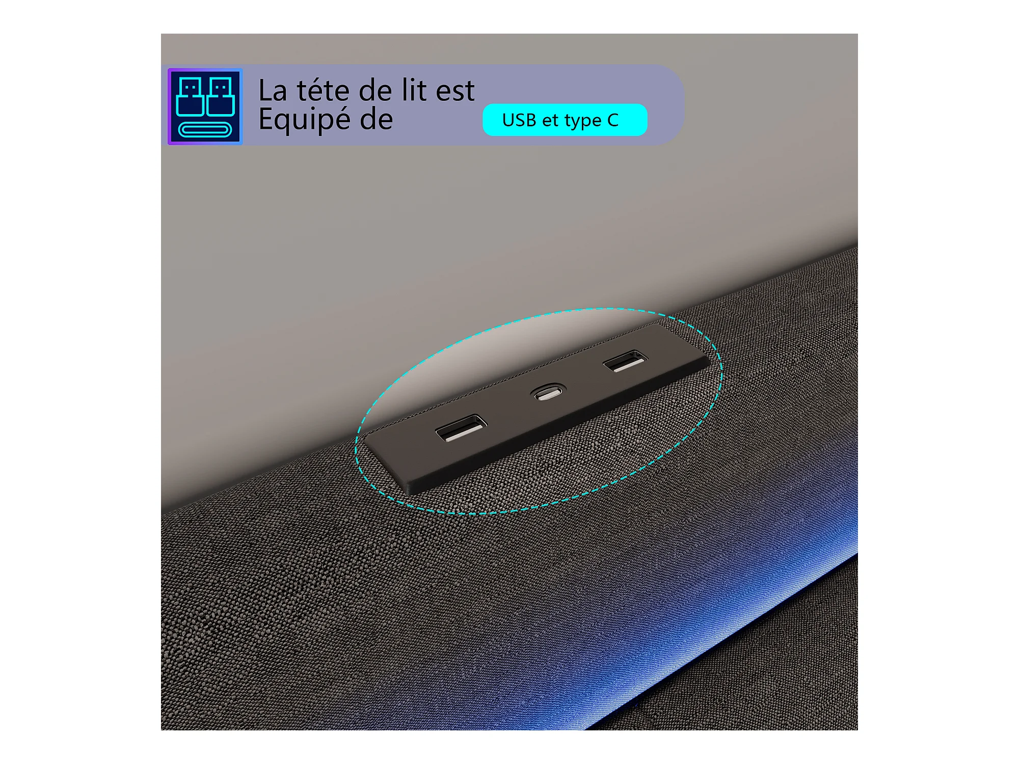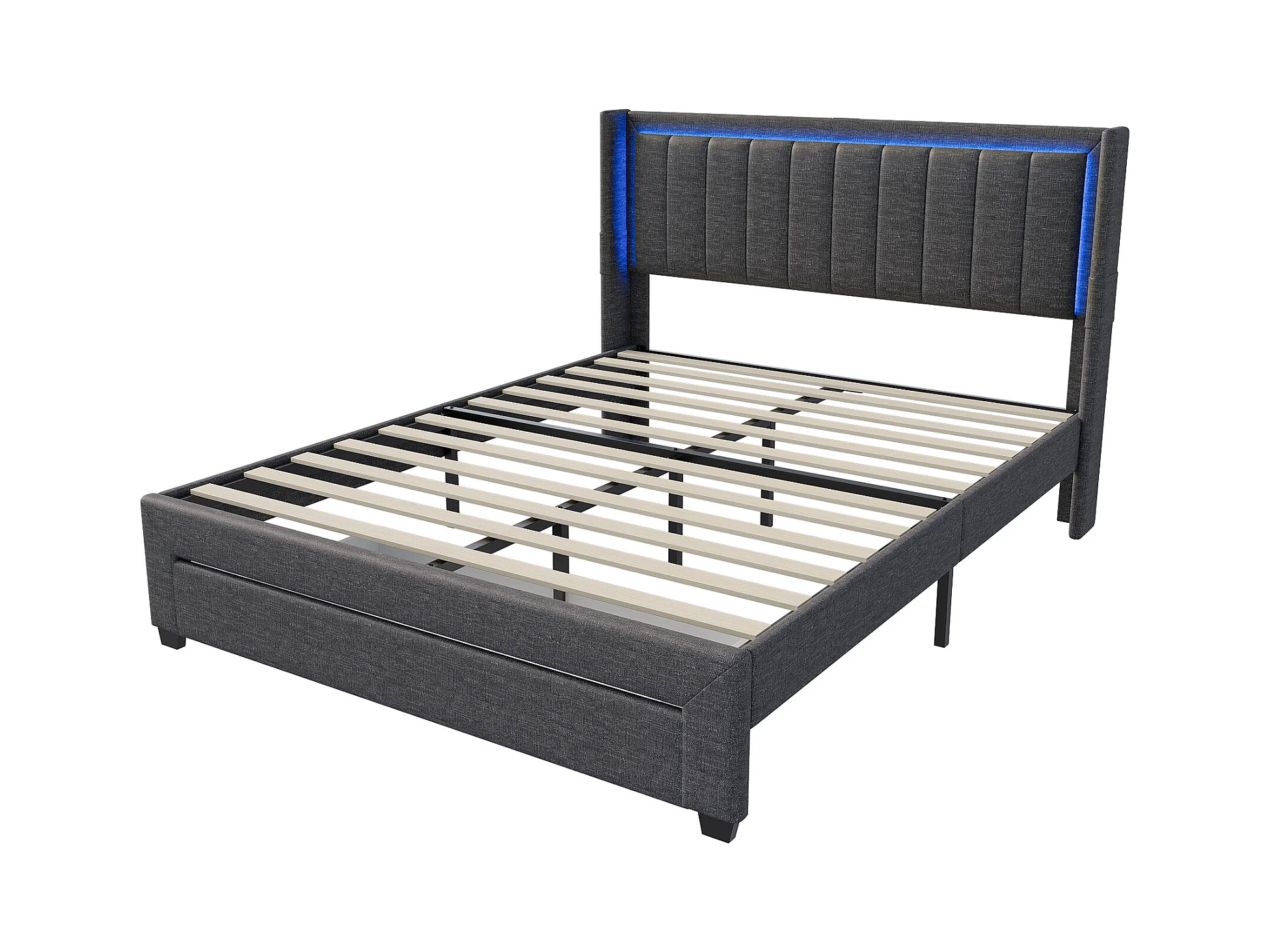 Gepolstertes Doppelbett 180x200cm mit Schublade, LED und USB, grau