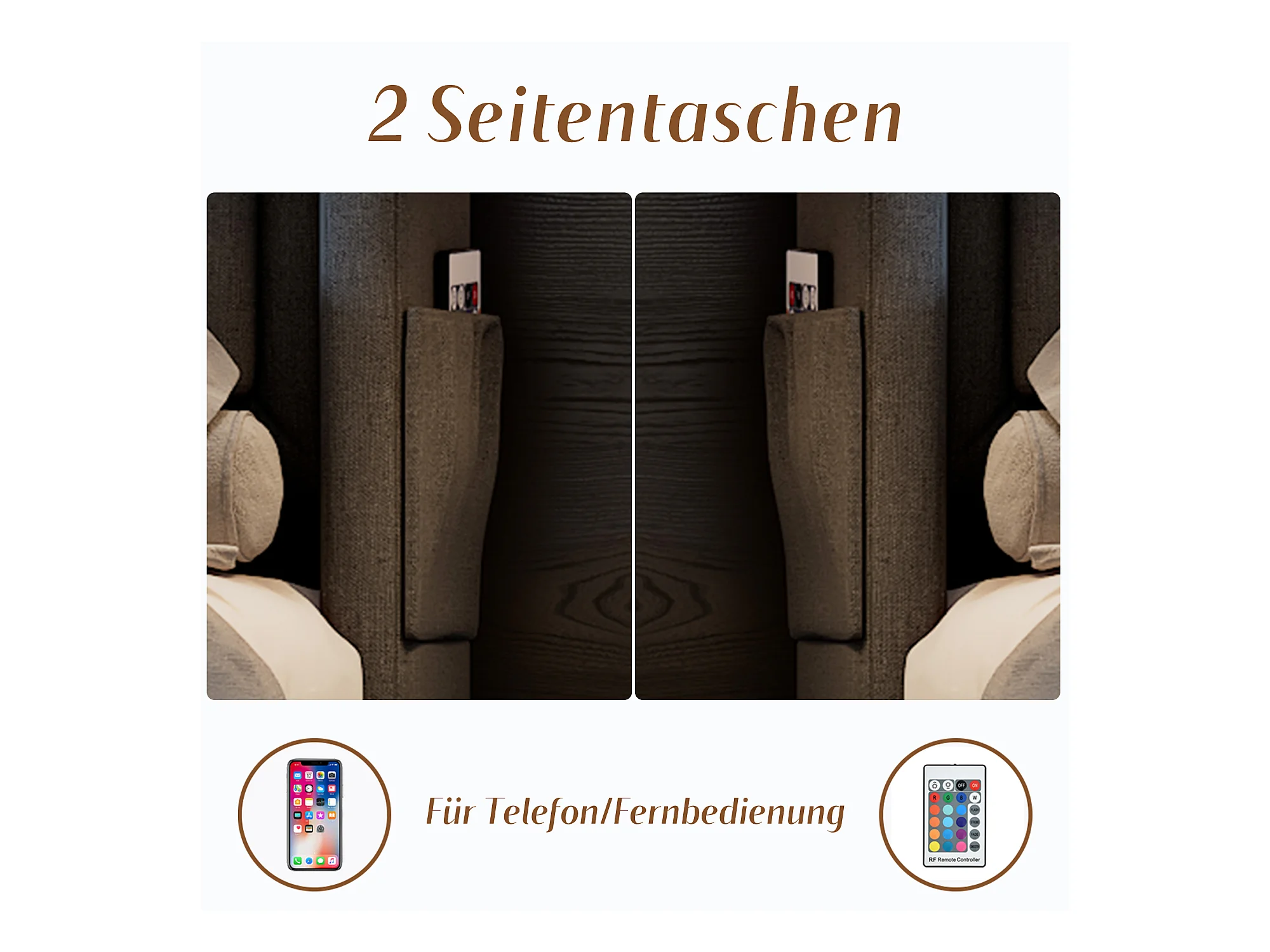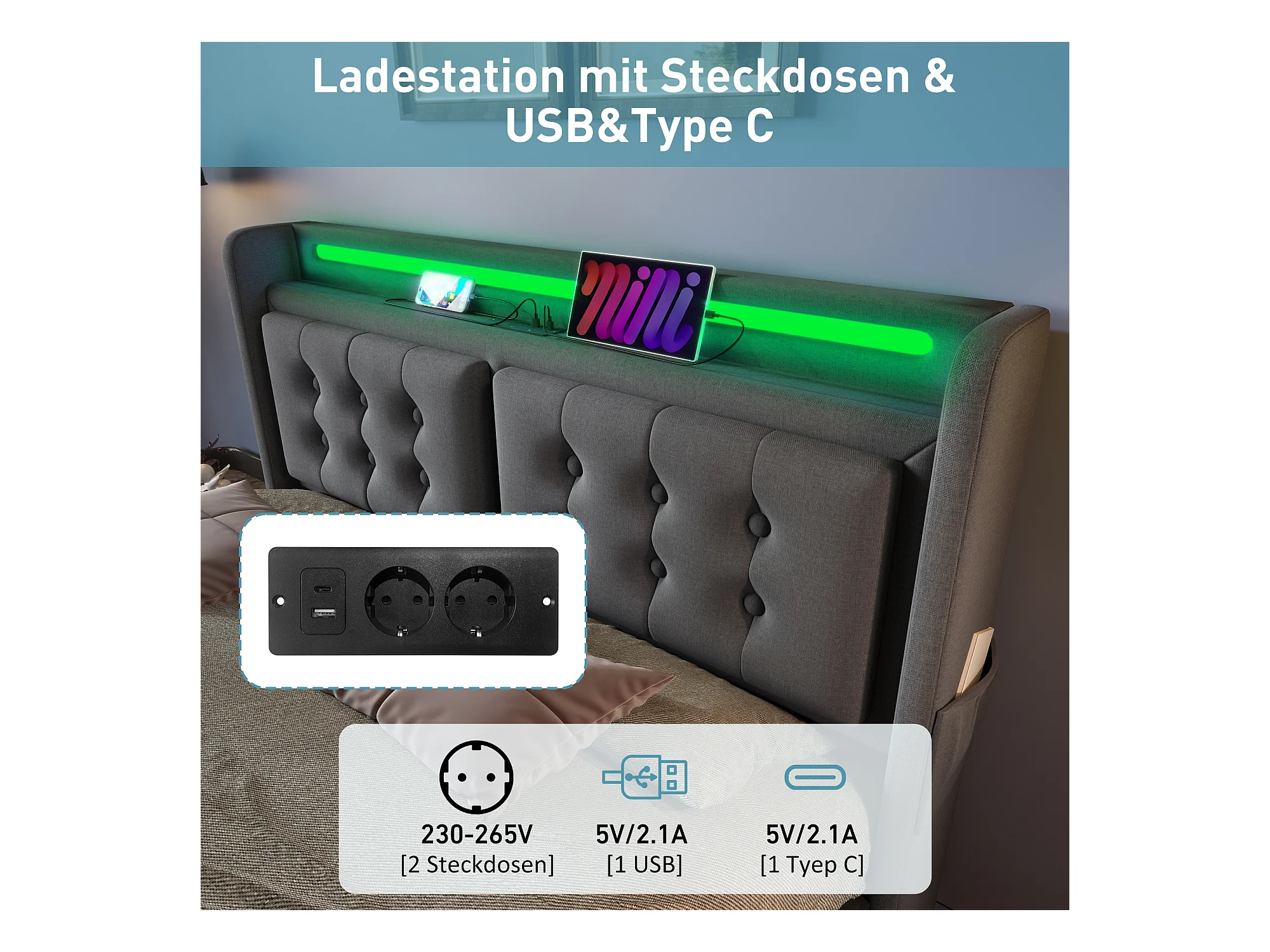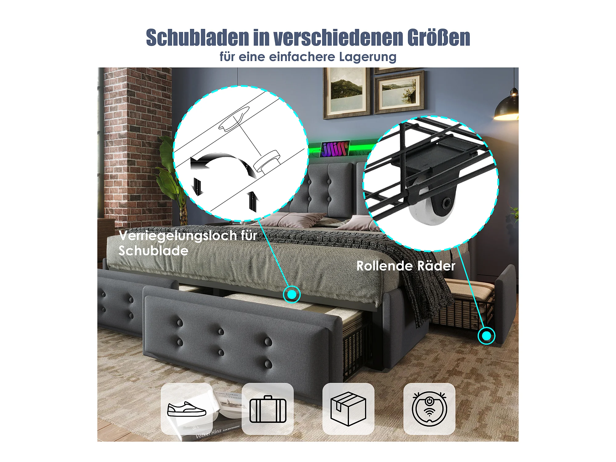 Gepolstertes Doppelbett mit Stauraum - 140 x 200 cm - Matratze + Leds + 4 Schubladen + Kopfteil mit USB - Baumwollstoff - Grau