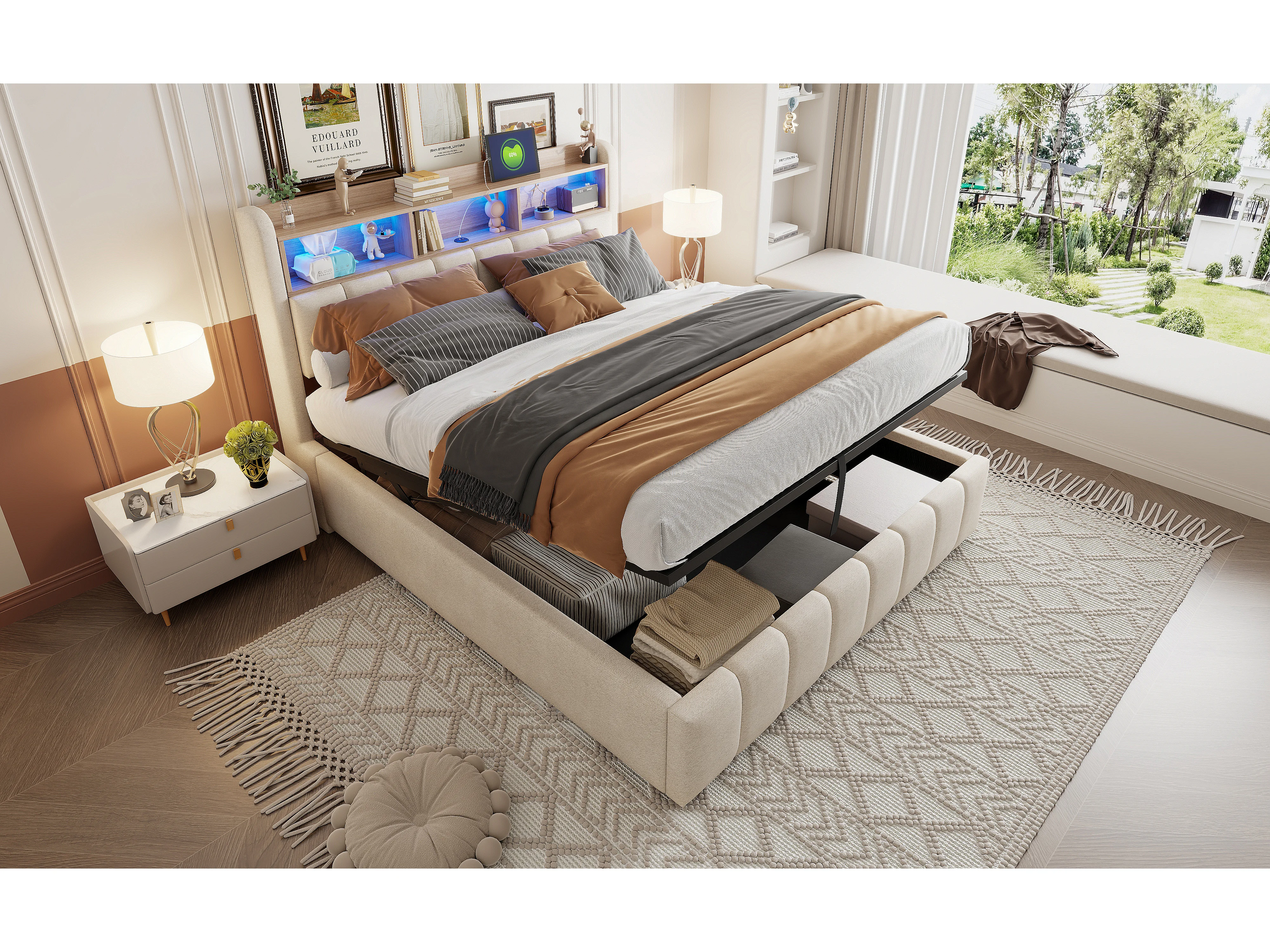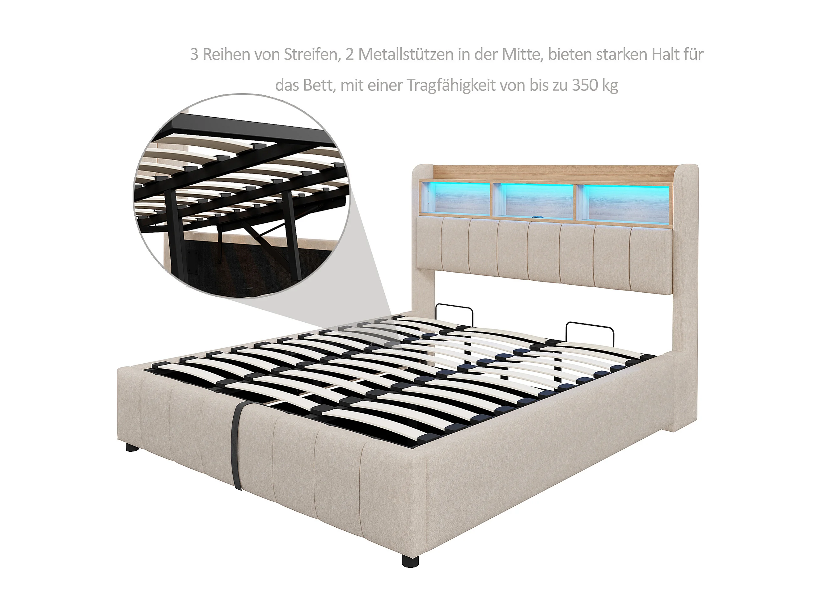 Gepolstertes Doppelbettbett mit Stauraum – 180 x 200 cm – mit LED-Beleuchtung + USB-Anschluss + Kopfteil mit Stauraum – Leinen + Metall + Sperrholz + MDF – Beige