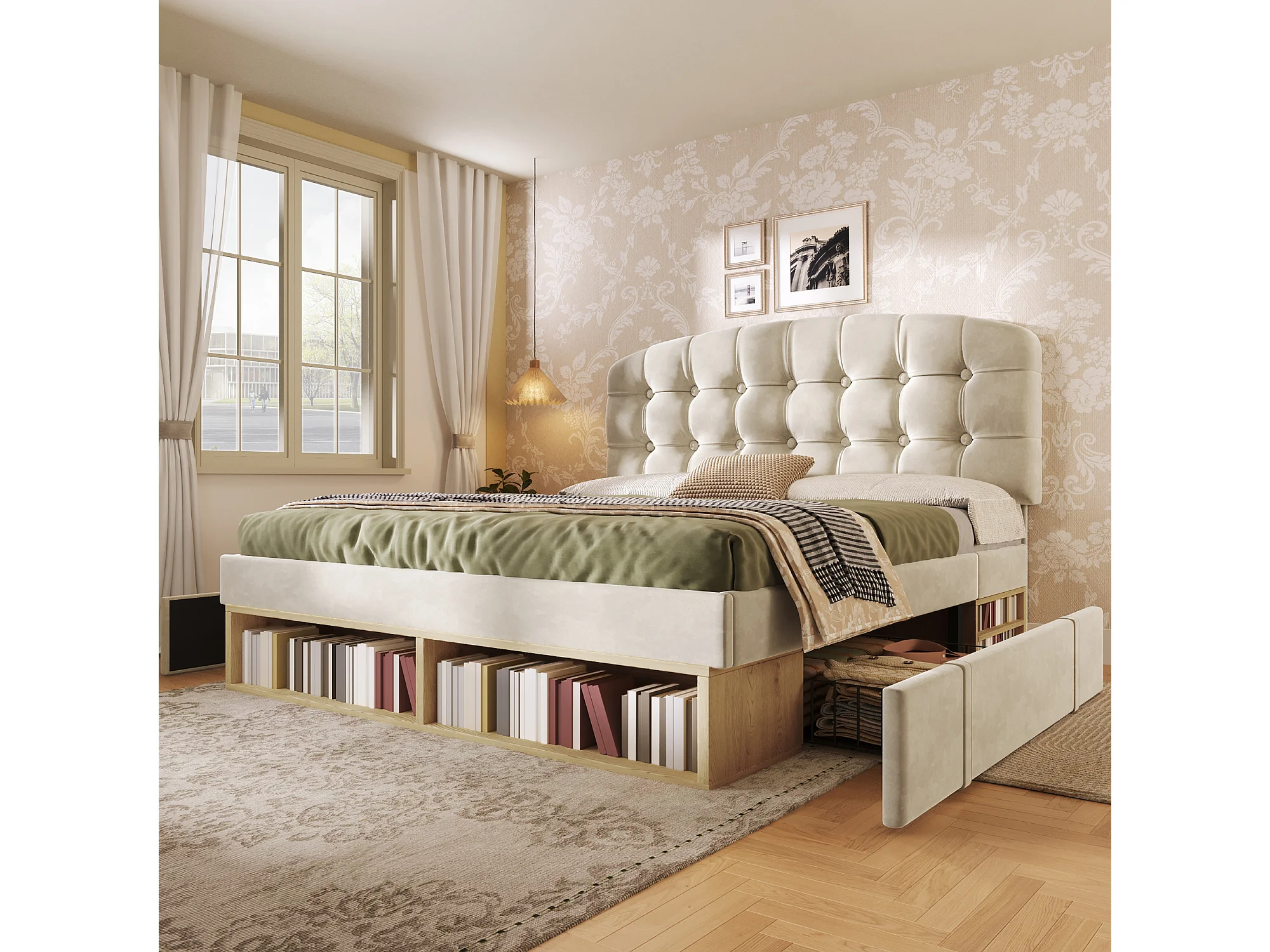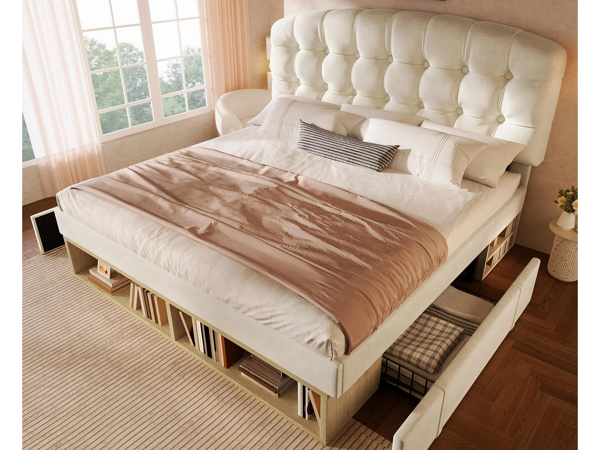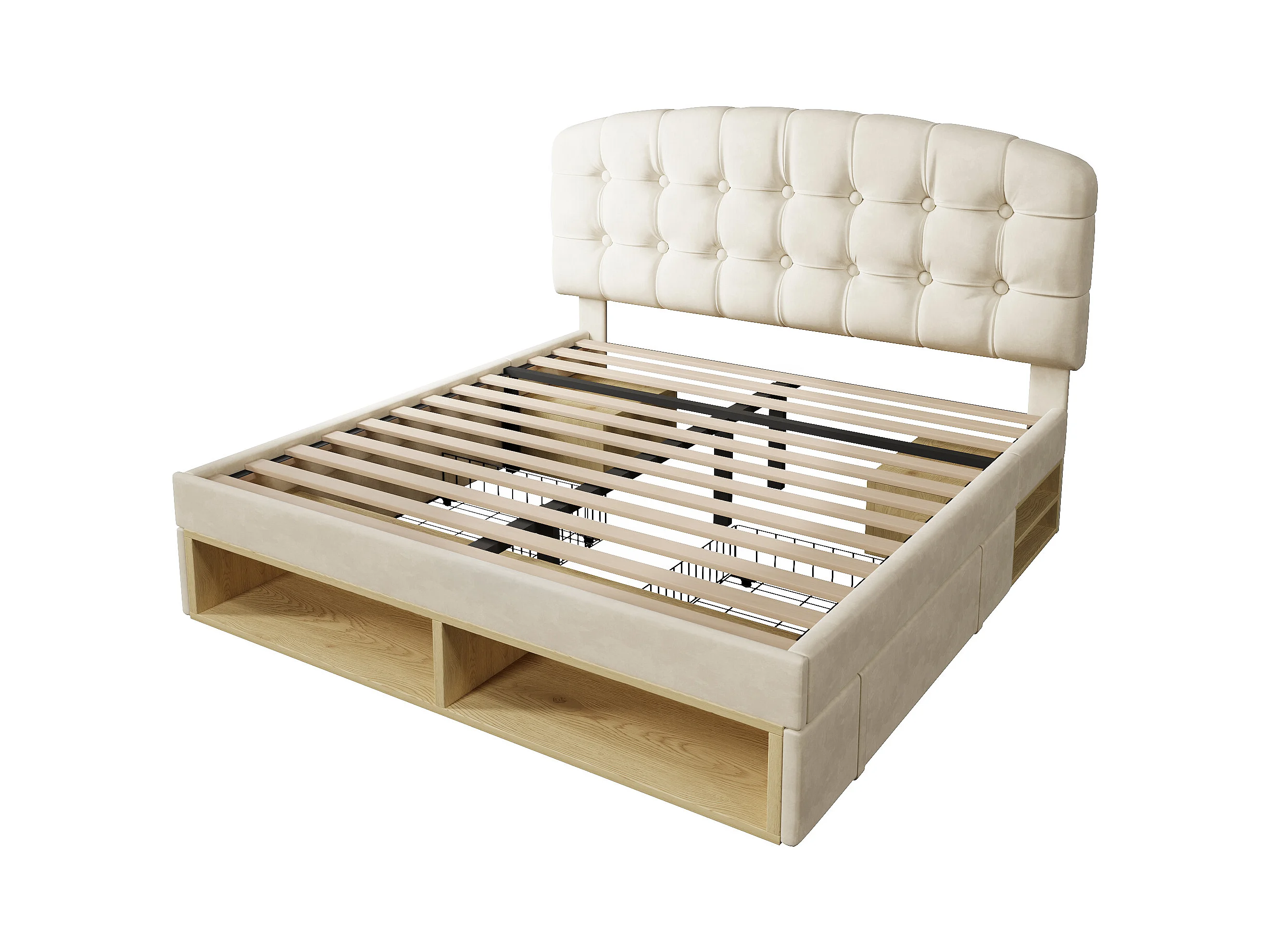 Gepolstertes Einzelbett 140x200cm - verstellbares Kopfteil - mit Schubladen und Stauraum - Samt - Beige​ (ohne Matratze)