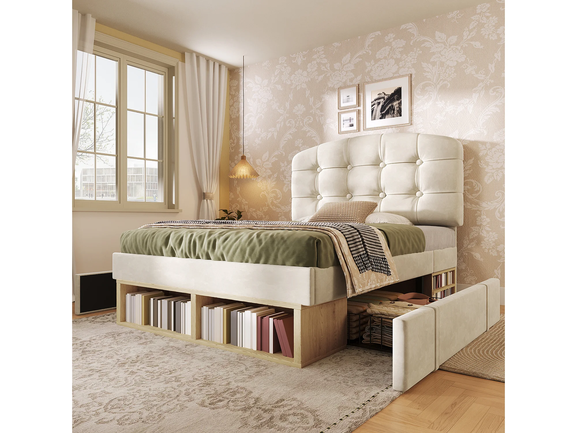 Gepolstertes Einzelbett 90x200cm - verstellbares Kopfteil - mit Schubladen und Stauraum - Samt - Beige​ (ohne Matratze)