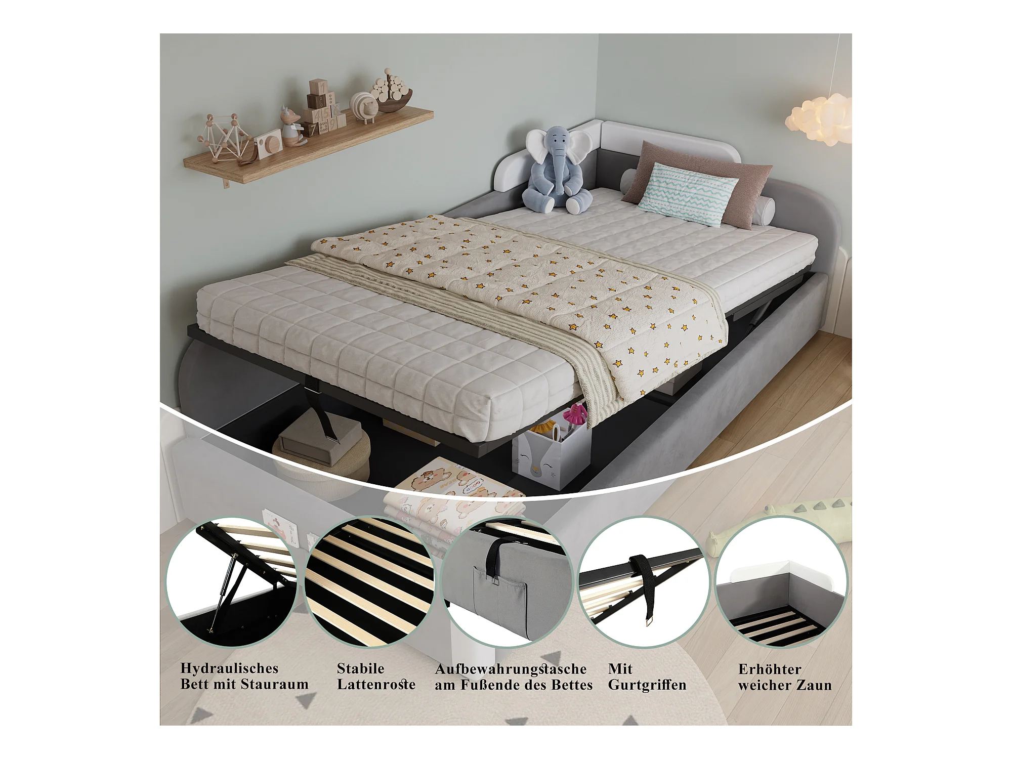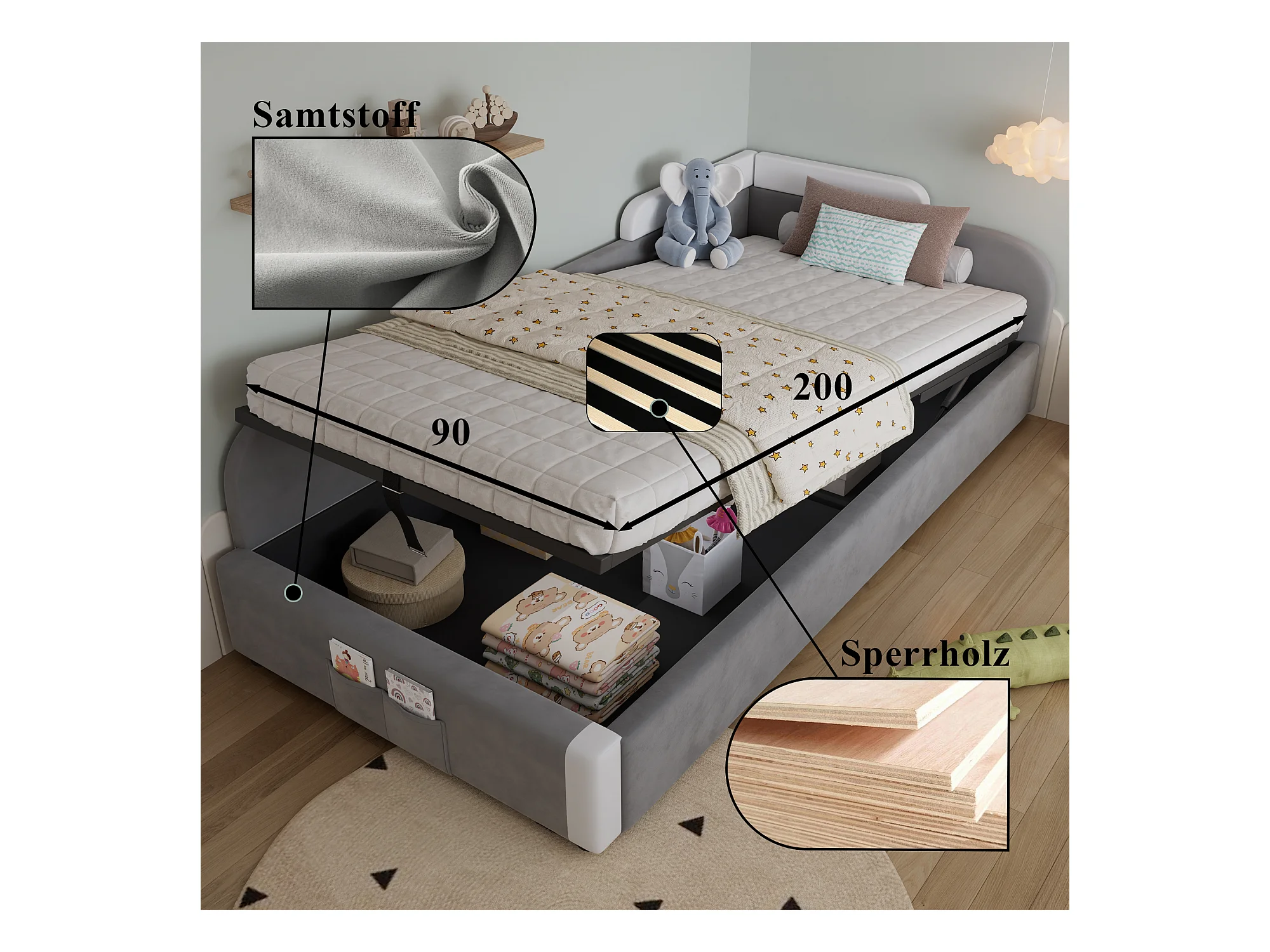 Gepolstertes Kinderbett - 90 x 200 cm - Hydraulikbox + Barriere - Samt + Sperrholz - Grau (linkes Panel)