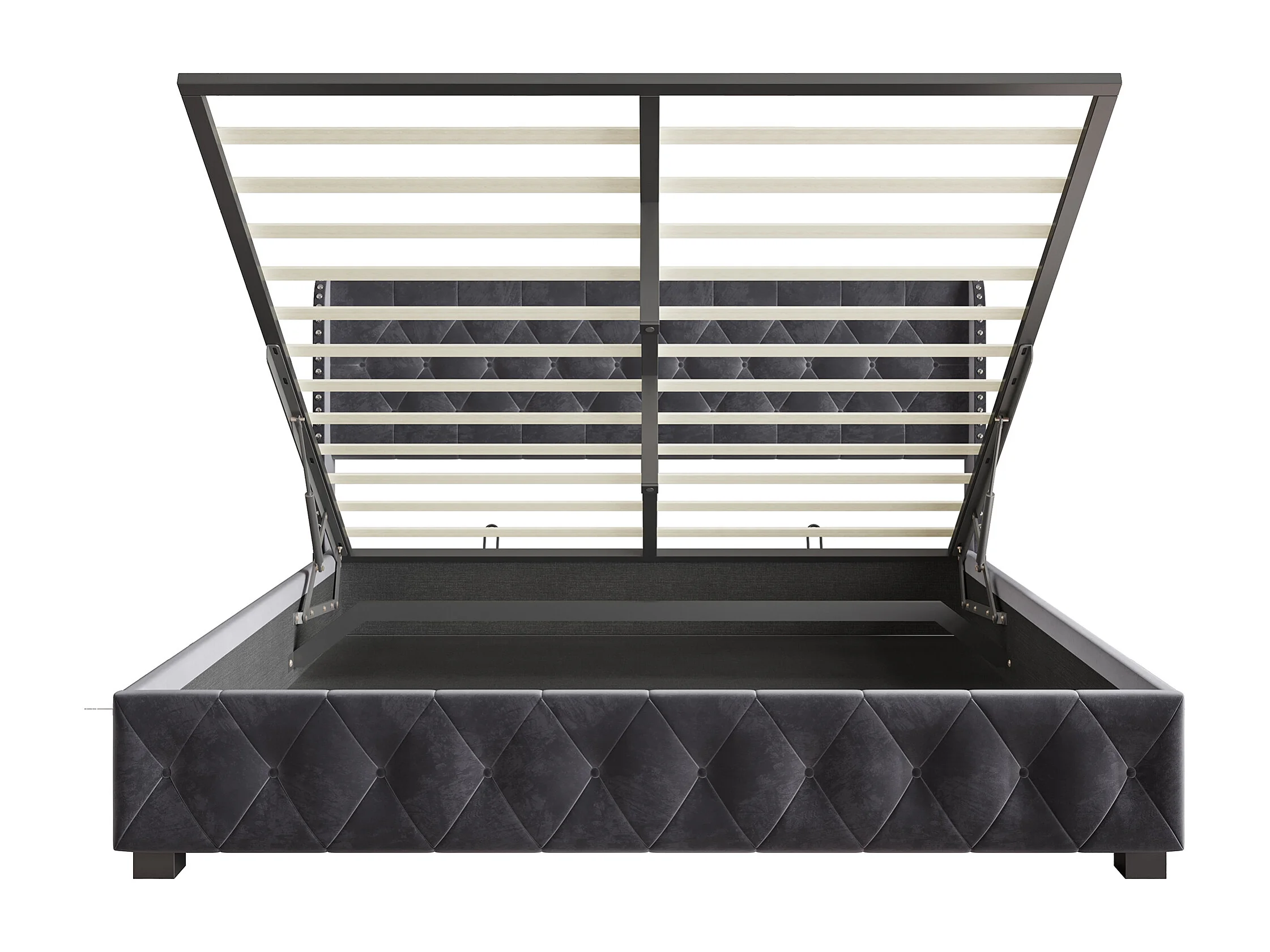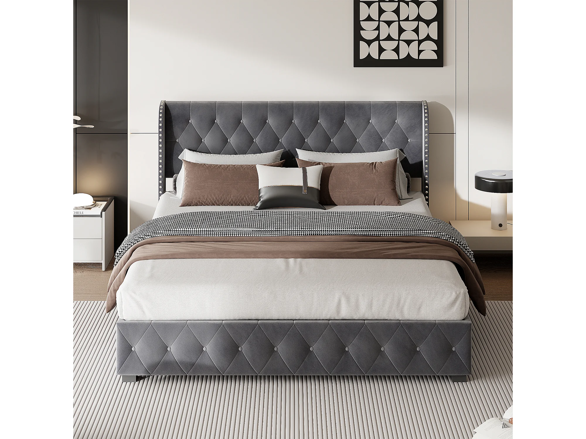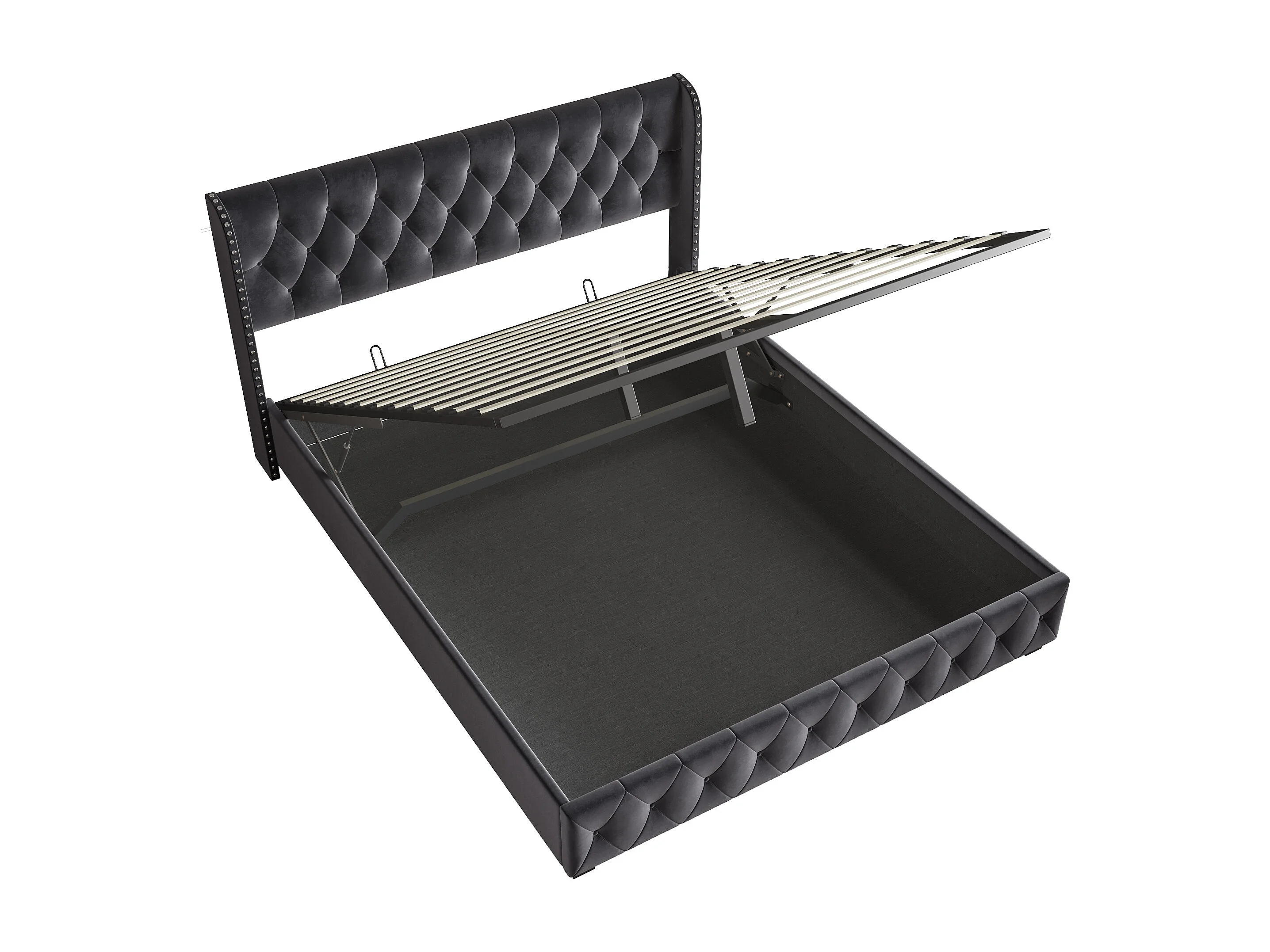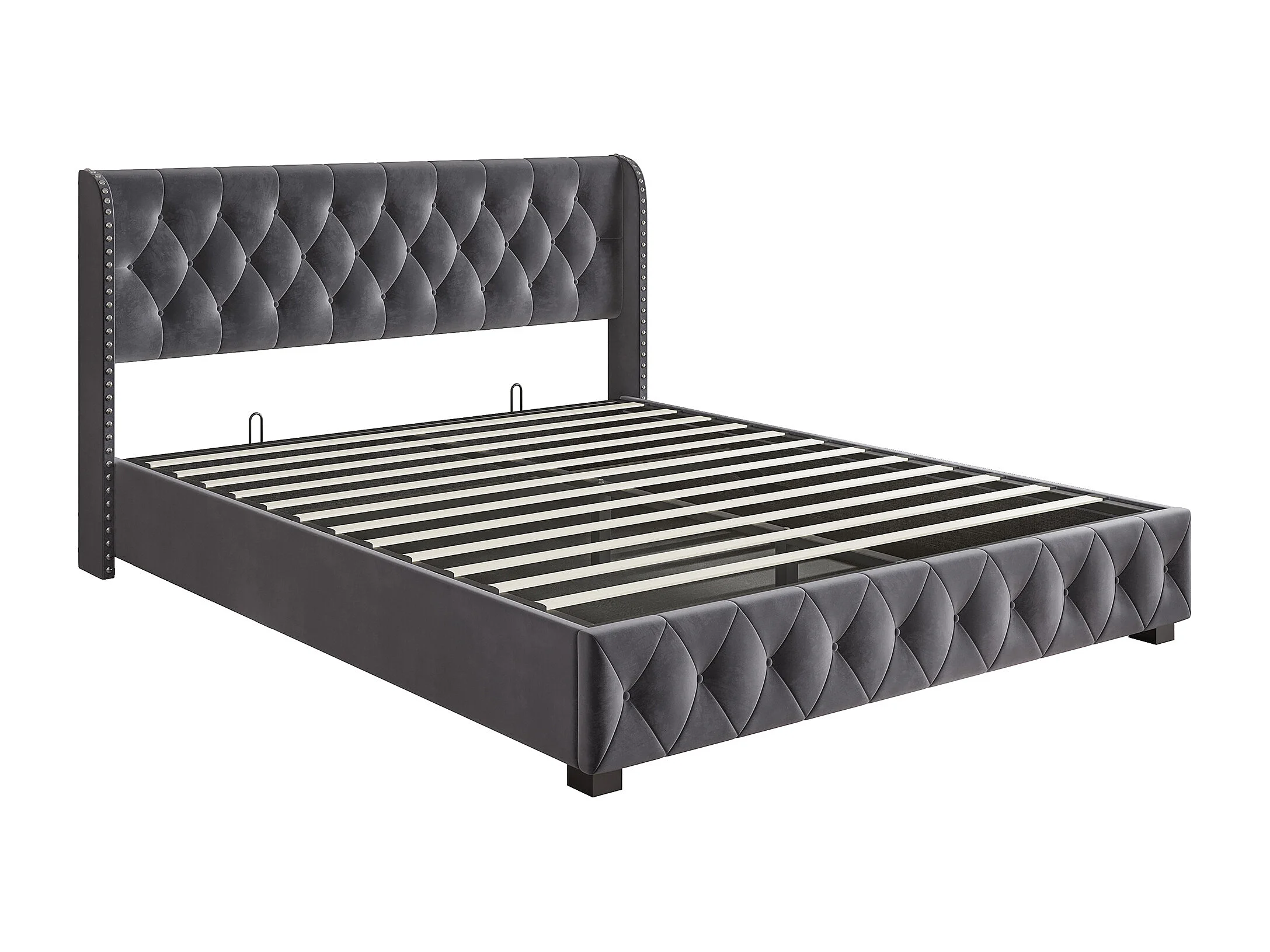 Gepolstertes Samtbett mit Stauraum – mit Nieten verziert – mit Lattenrost – 160 x 200 cm – Grau