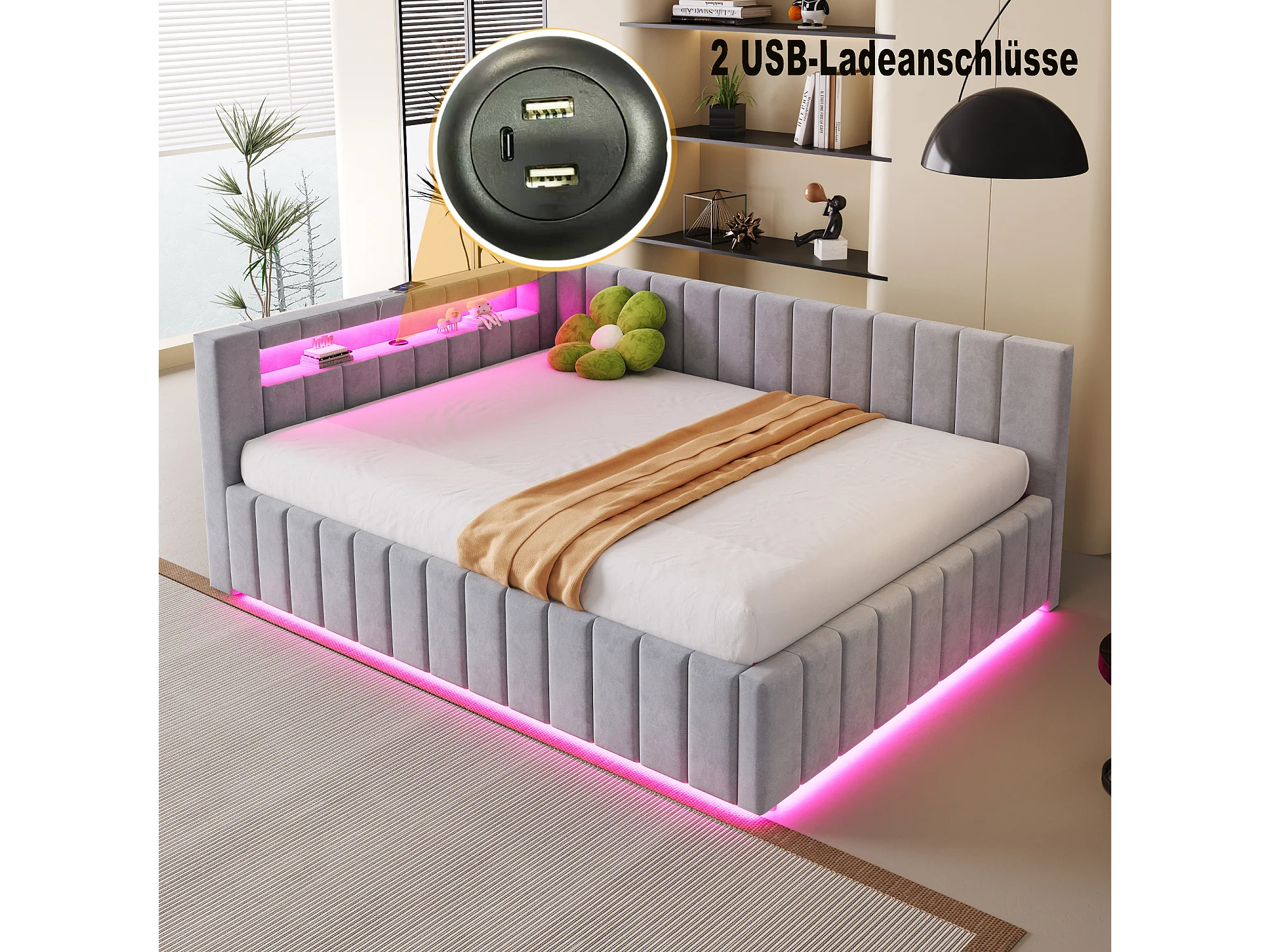 Gepolstertes Schlafsofa 140x200 cm - mit LED-Beleuchtung und USB-Ladefunktion - Samt - Grau (ohne Matratze)
