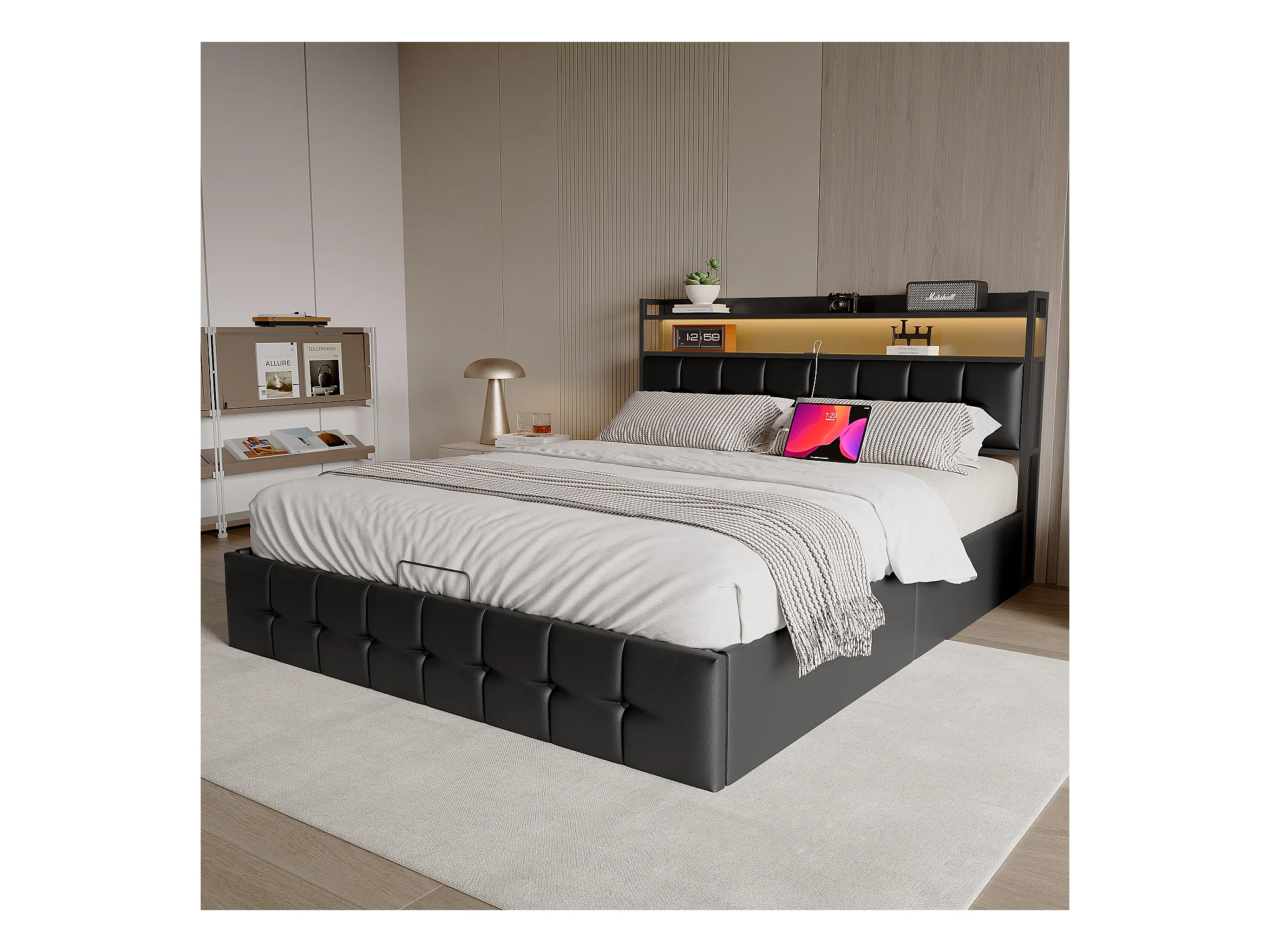 Gepolstertes Truhenbett 140 x 200 cm aus PU-Stoff – mit LED und Ladeanschluss – mit Lattenrost – Schwarz