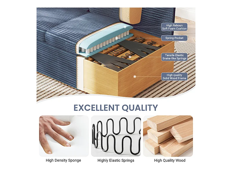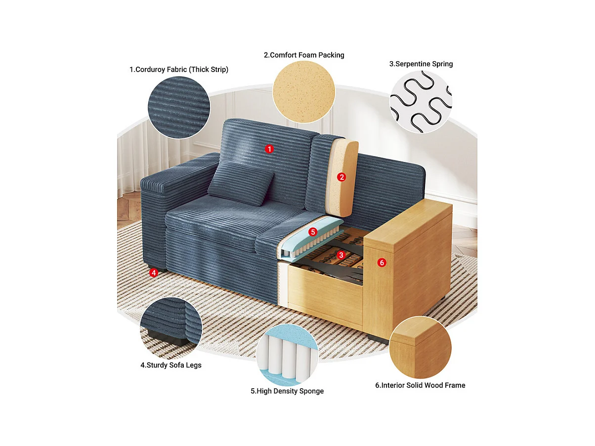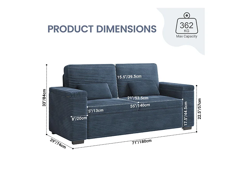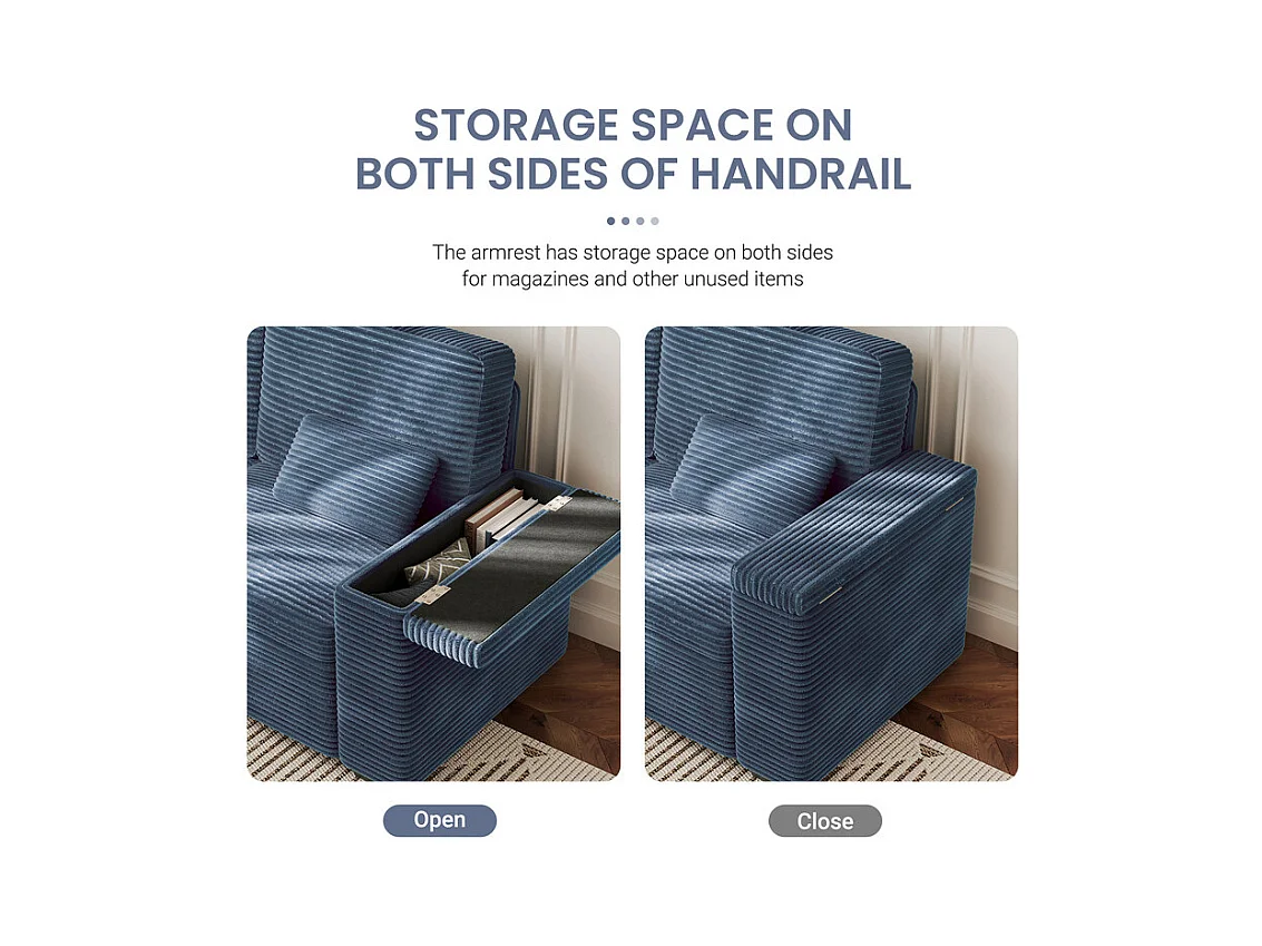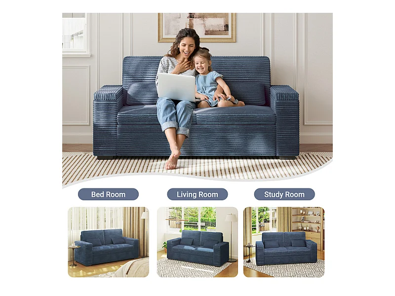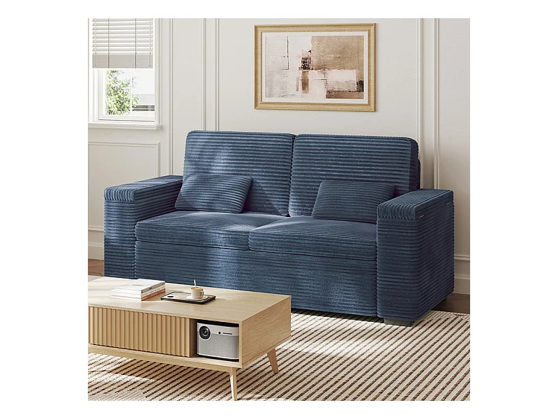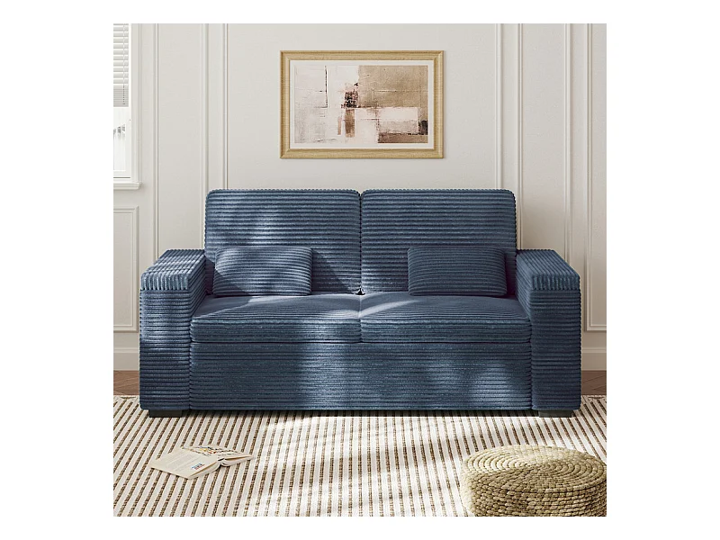 Gerades 2-Sitzer Sofa in Rippensamt Blau - mit Stauraum-Armlehnen - 180x74x84cm