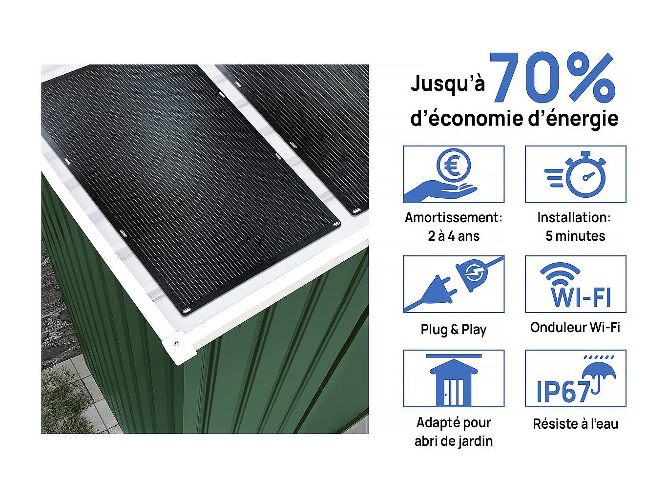 Gartenhaus aus Metall 2,71 m² mit Solarpaneelen - "Rosas" Entdecken Sie unser Gartenhaus aus Metall, das mit Solarpaneelen ausgestattet ist: Eine umweltfreundliche und kostengünstige Lösung für Ihren Außenbereich. Die integrierten Solarpaneele liefern eine saubere, erneuerbare Energiequelle, mit der Sie Ihr Gartenhaus beleuchten und Ihre Elektrogeräte betreiben können, ohne die Umwelt zu belasten. Dieses aus robustem Metall gefertigte Gartenhäuschen bietet dauerhaften Schutz für Ihre Gartengeräte und Outdoor-Ausrüstung. Entscheiden Sie sich für einen ökologischen Ansatz bei der Gartenpflege mit unserem Gartenhaus mit Solarpaneelen. Bestellen Sie jetzt für eine nachhaltige und innovative Lösung. Panel-Typ : Flexibel.