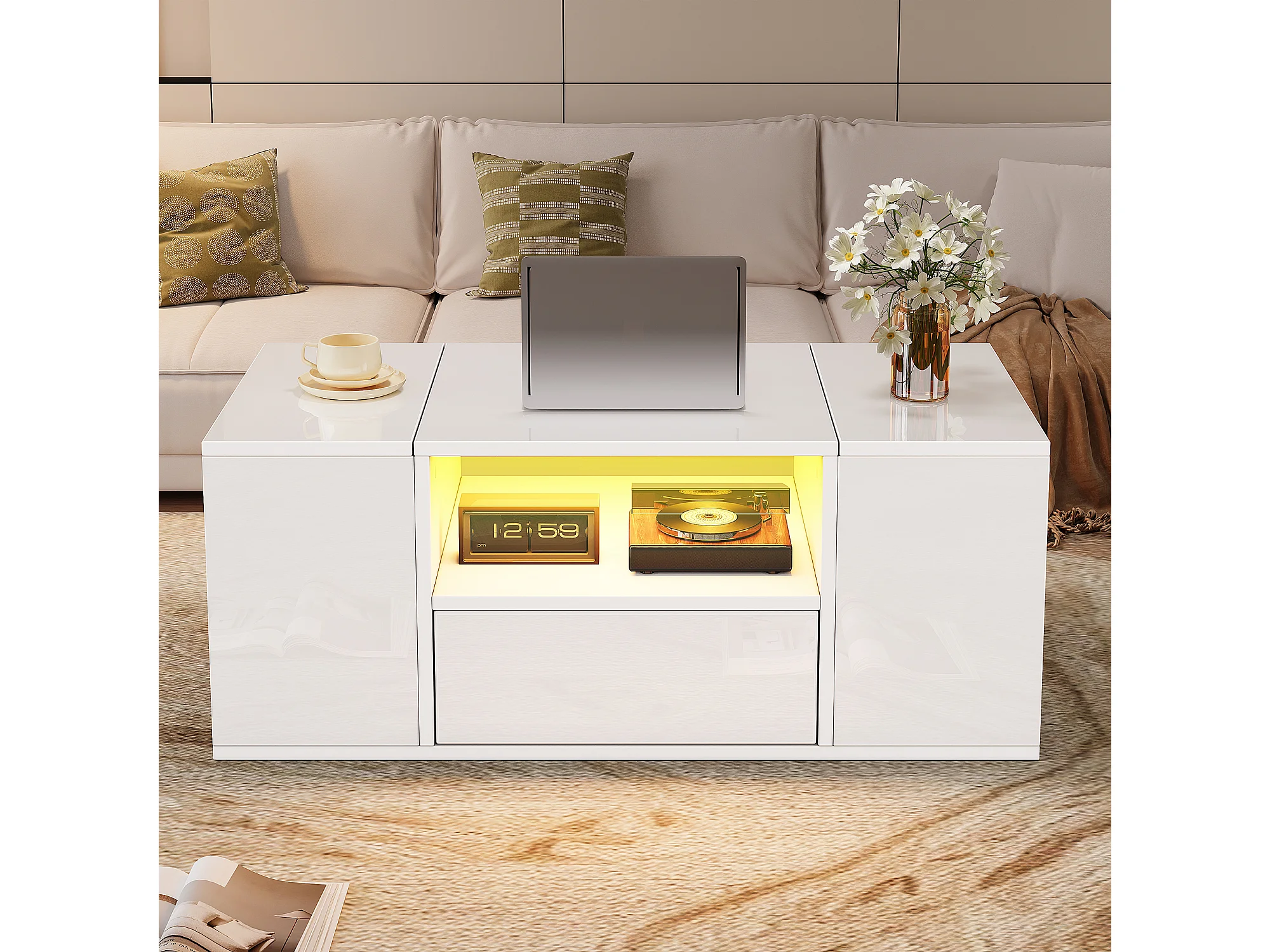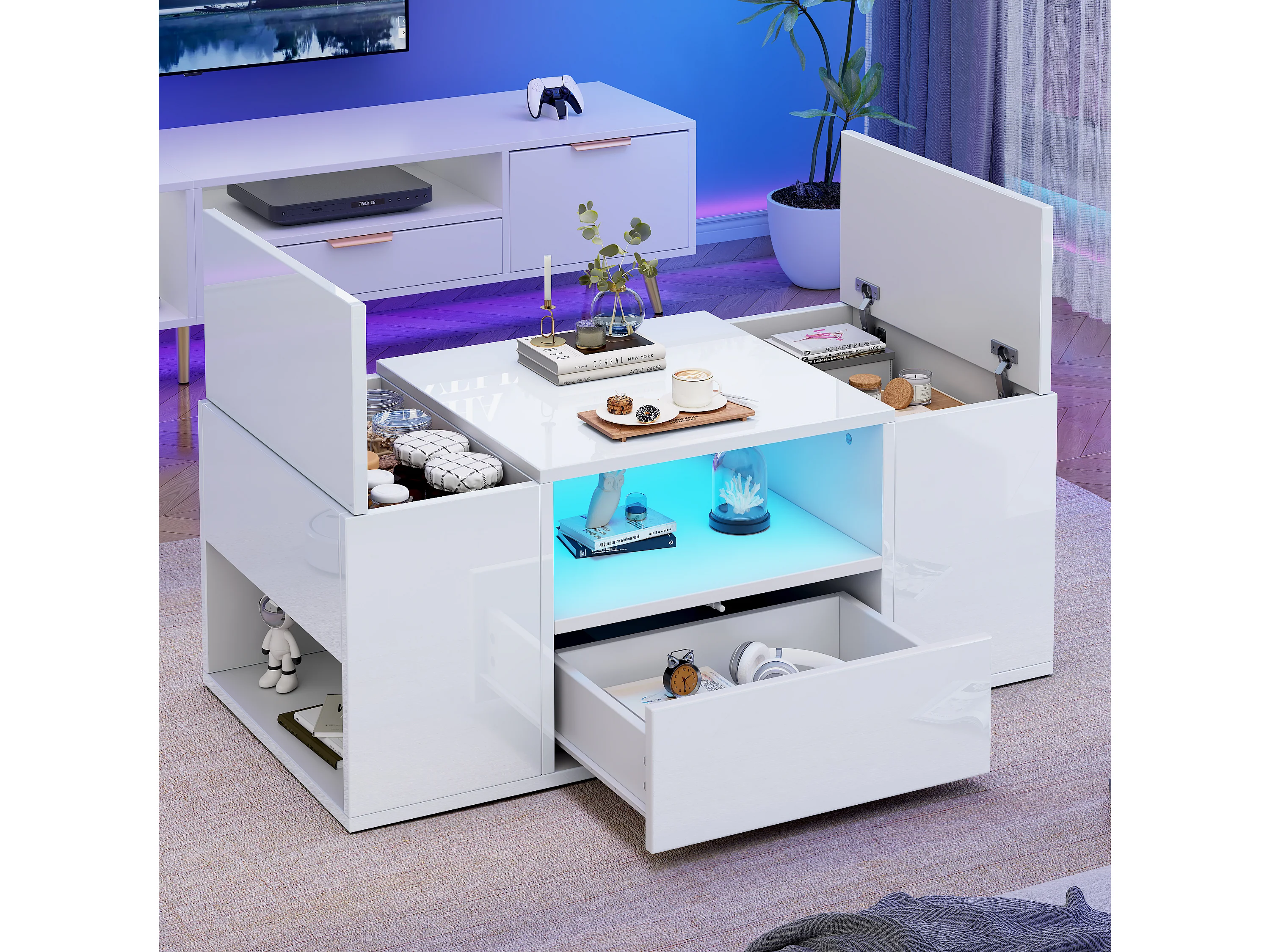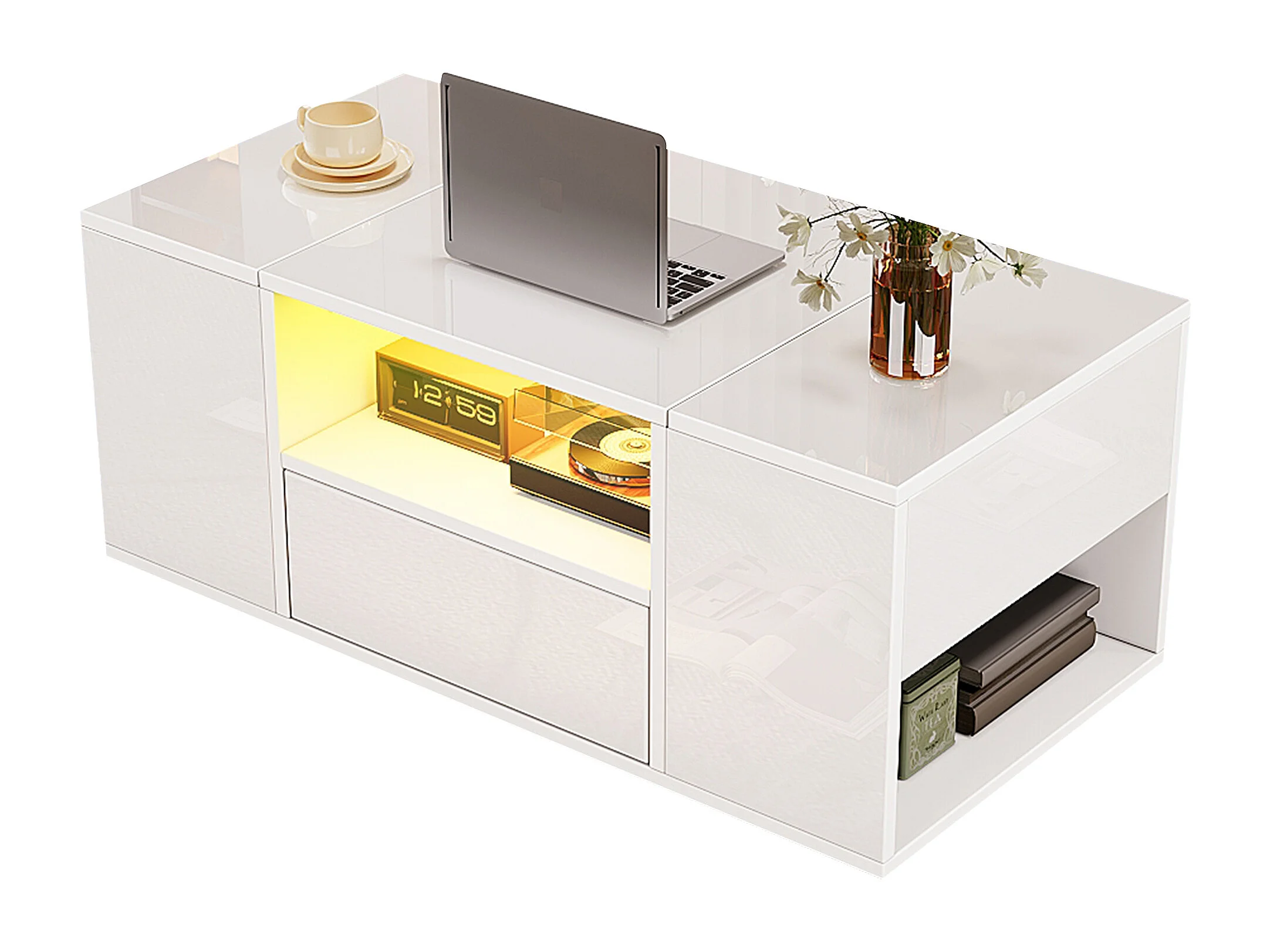 Glänzender Couchtisch 100x50x40 cm - mit 1 Schublade und Staufächern - mit LED-Beleuchtung - Spanplatten - Weiß