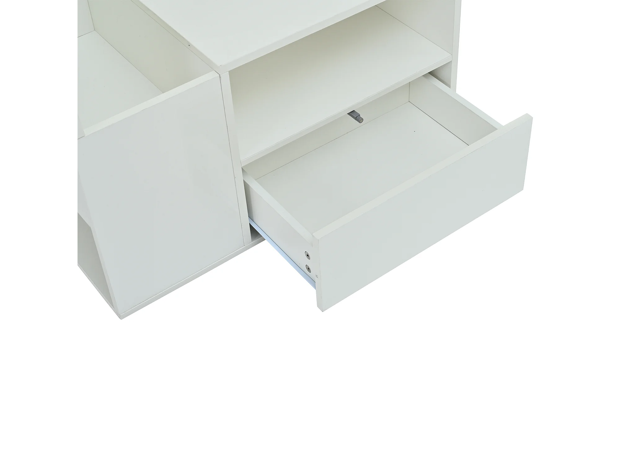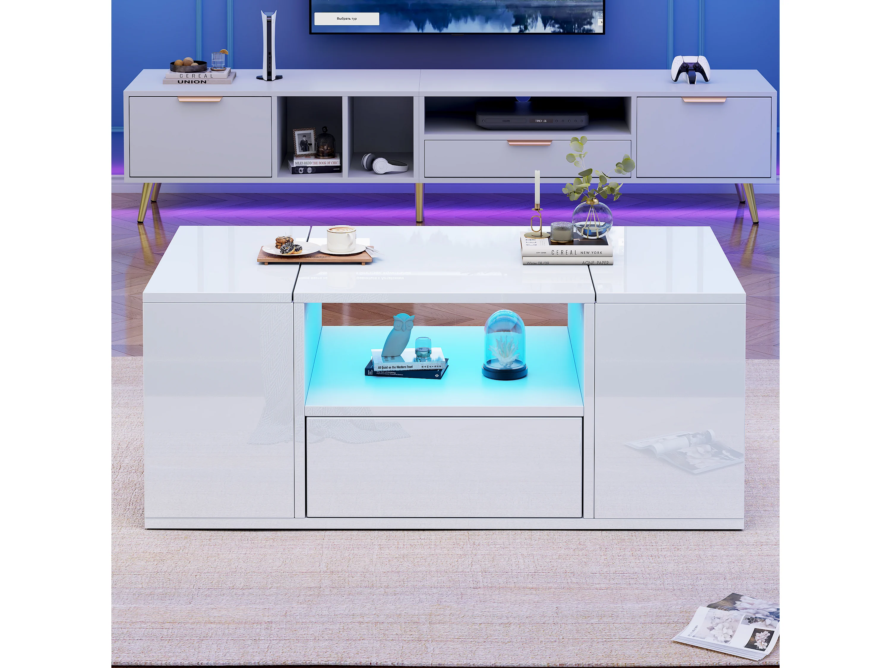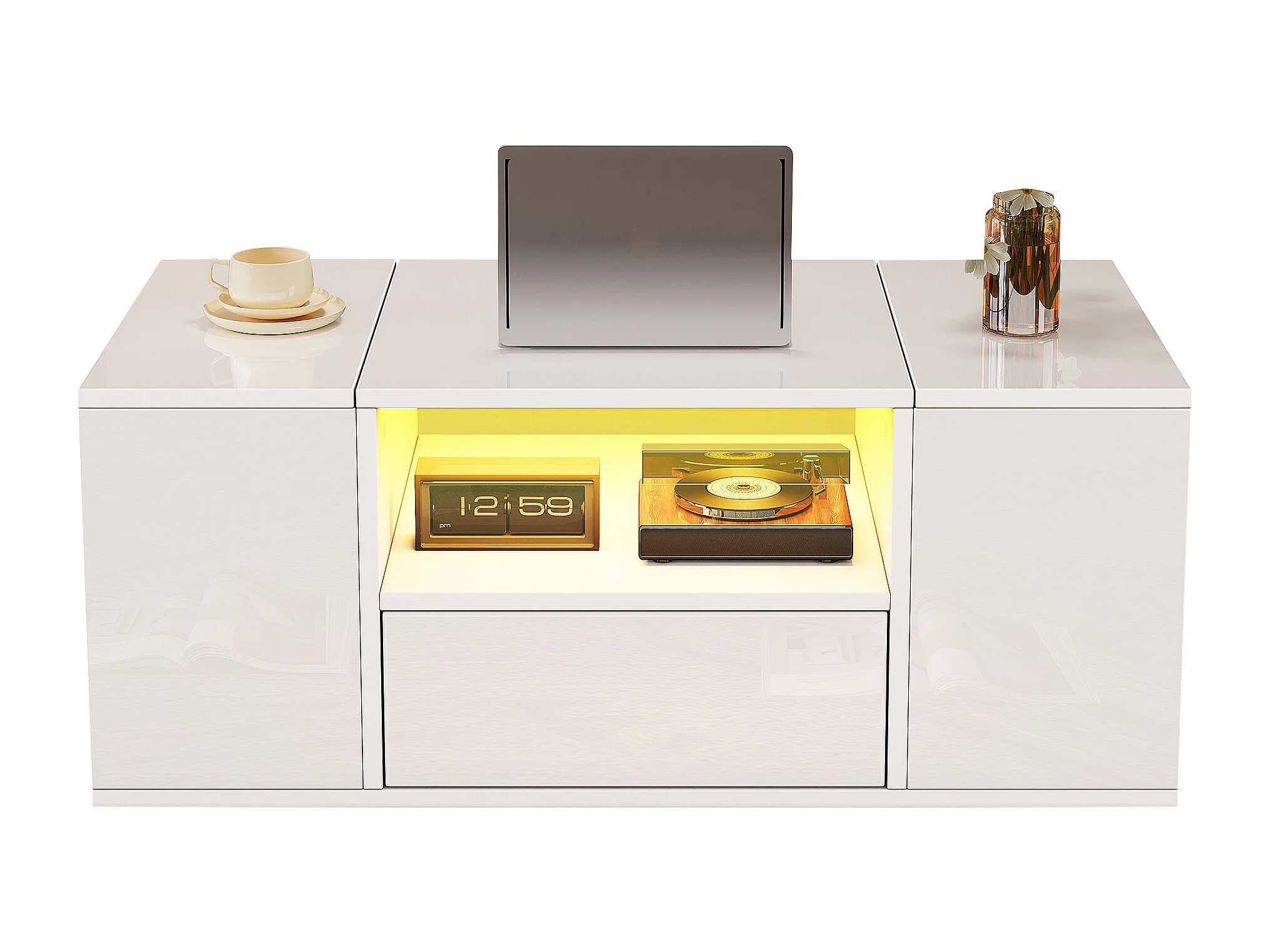 Glänzender Couchtisch 100x50x40 cm - mit 1 Schublade und Staufächern - mit LED-Beleuchtung - Spanplatten - Weiß