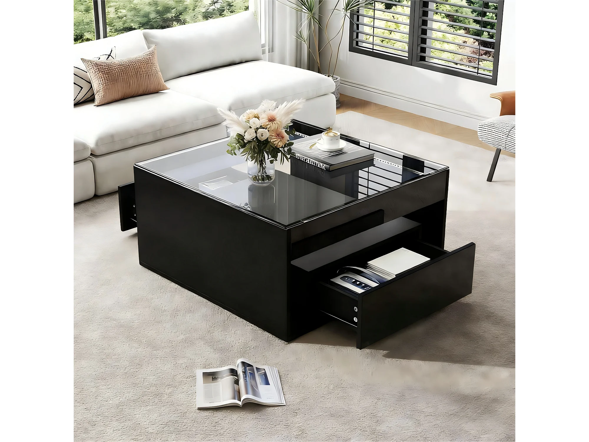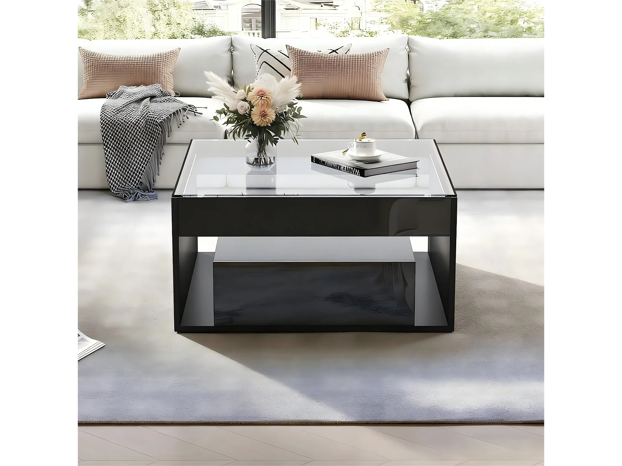 Glänzender Couchtisch 70x70x35 cm - Mit LED-Beleuchtung - 1 Schublade - Offenes Ablagefach - Platte aus gehärtetem Glas - MDF - Schwarz