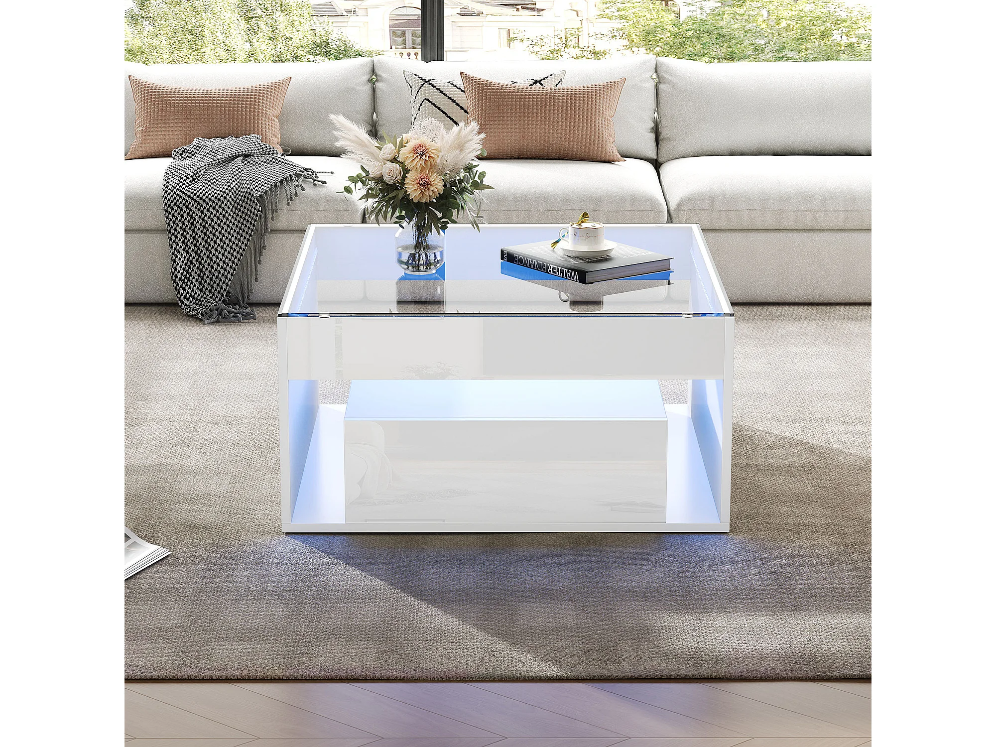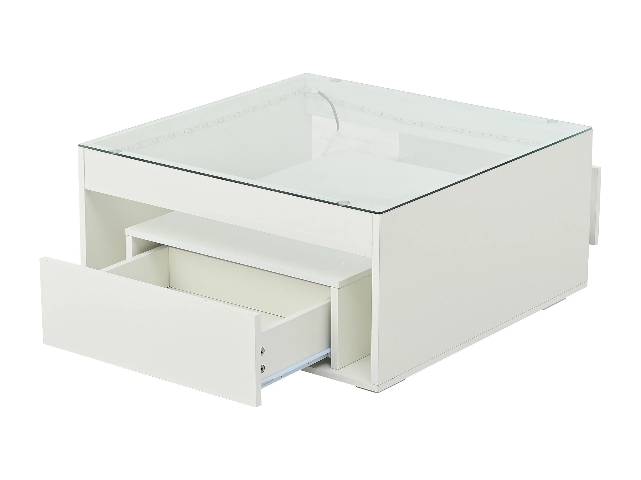 Glänzender Couchtisch 70x70x35 cm - Mit LED-Beleuchtung - 1 Schublade - Offenes Ablagefach - Platte aus gehärtetem Glas - MDF - Weiß
