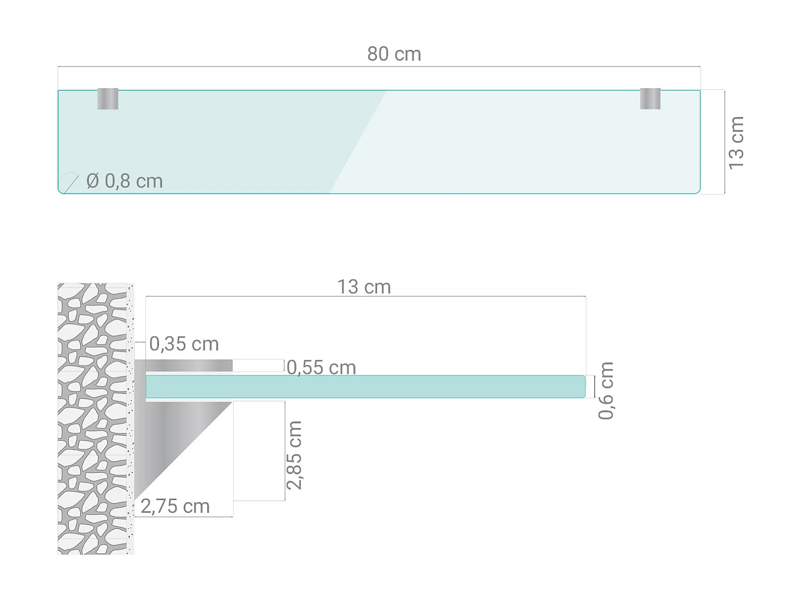 Glas Wandregal 80x13 cm Transparent – Bad Wandablage aus Glas, Glasboden klar mit Halterungen