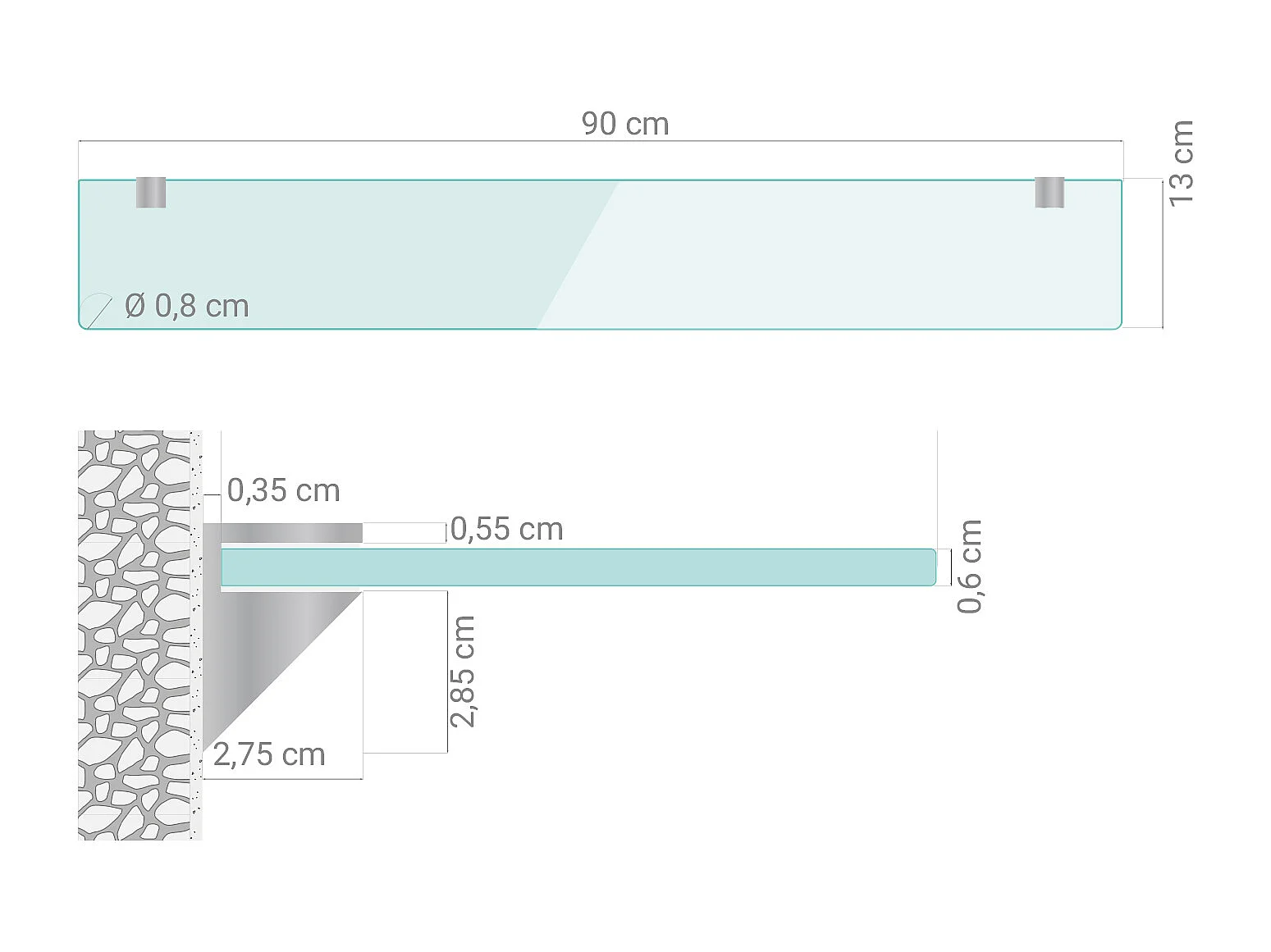 Glas Wandregal 90x13 cm Transparent – Badezimmer Glasboden unter Spiegel, Sicherheitsglas klar