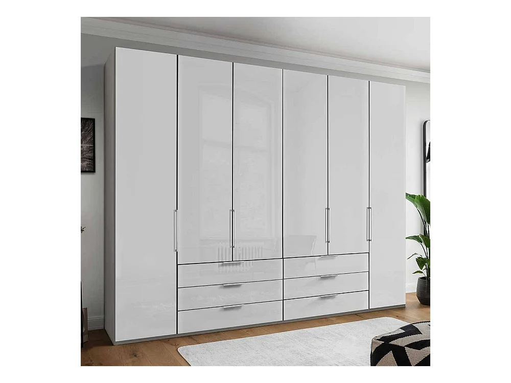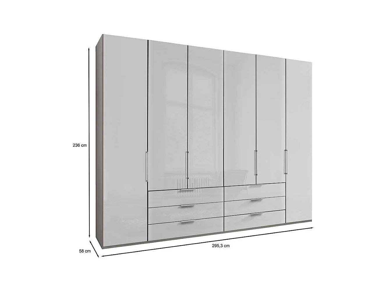 Glasfront Kleiderschrank in Weiß & Hellgrau sechs Schubladen