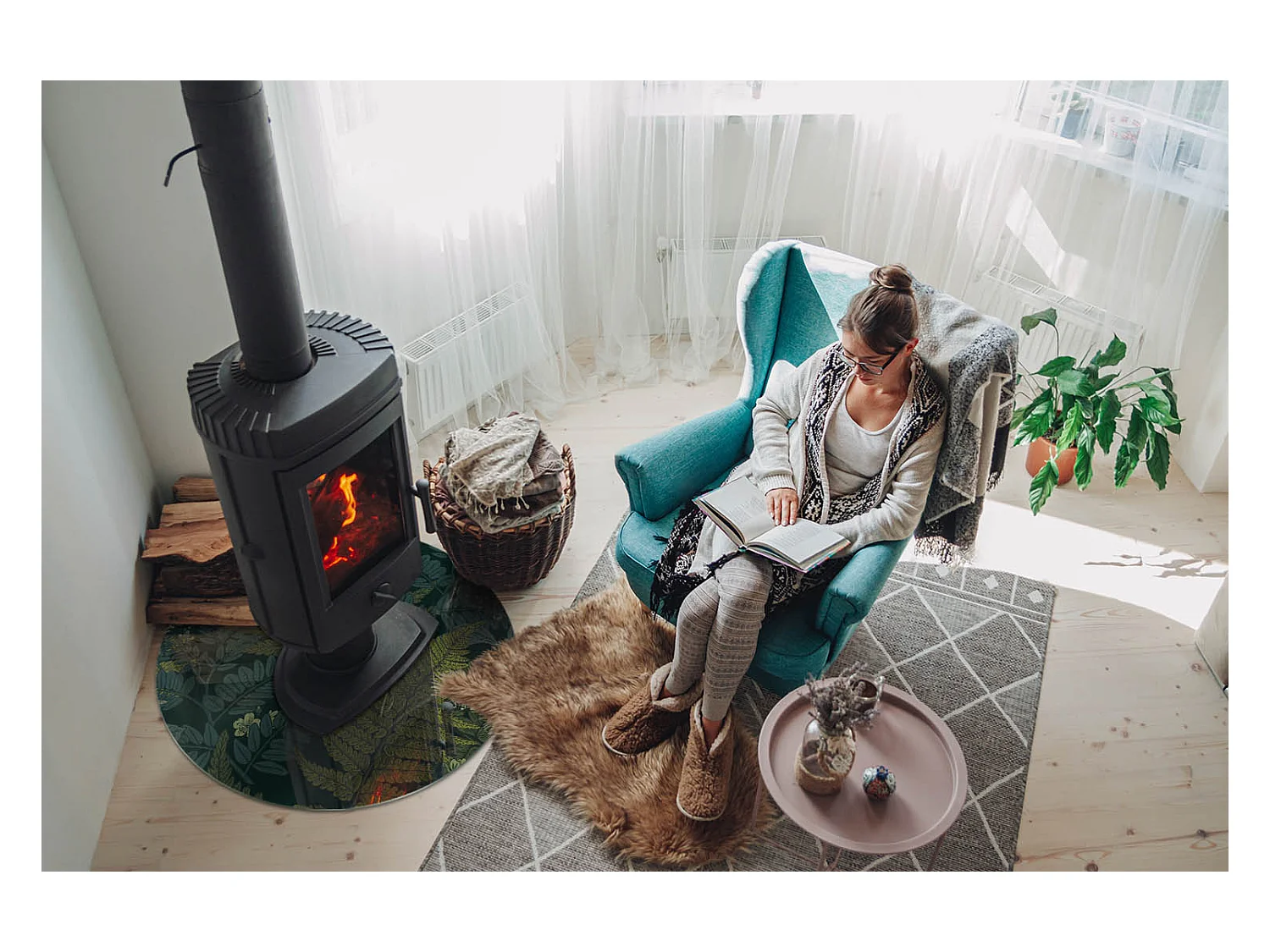 Glasplatte zum Schutz vor Funkenflug, Kaminauflage - Rad - 70X70 - Pflanzenmotive mit Schmetterlingen