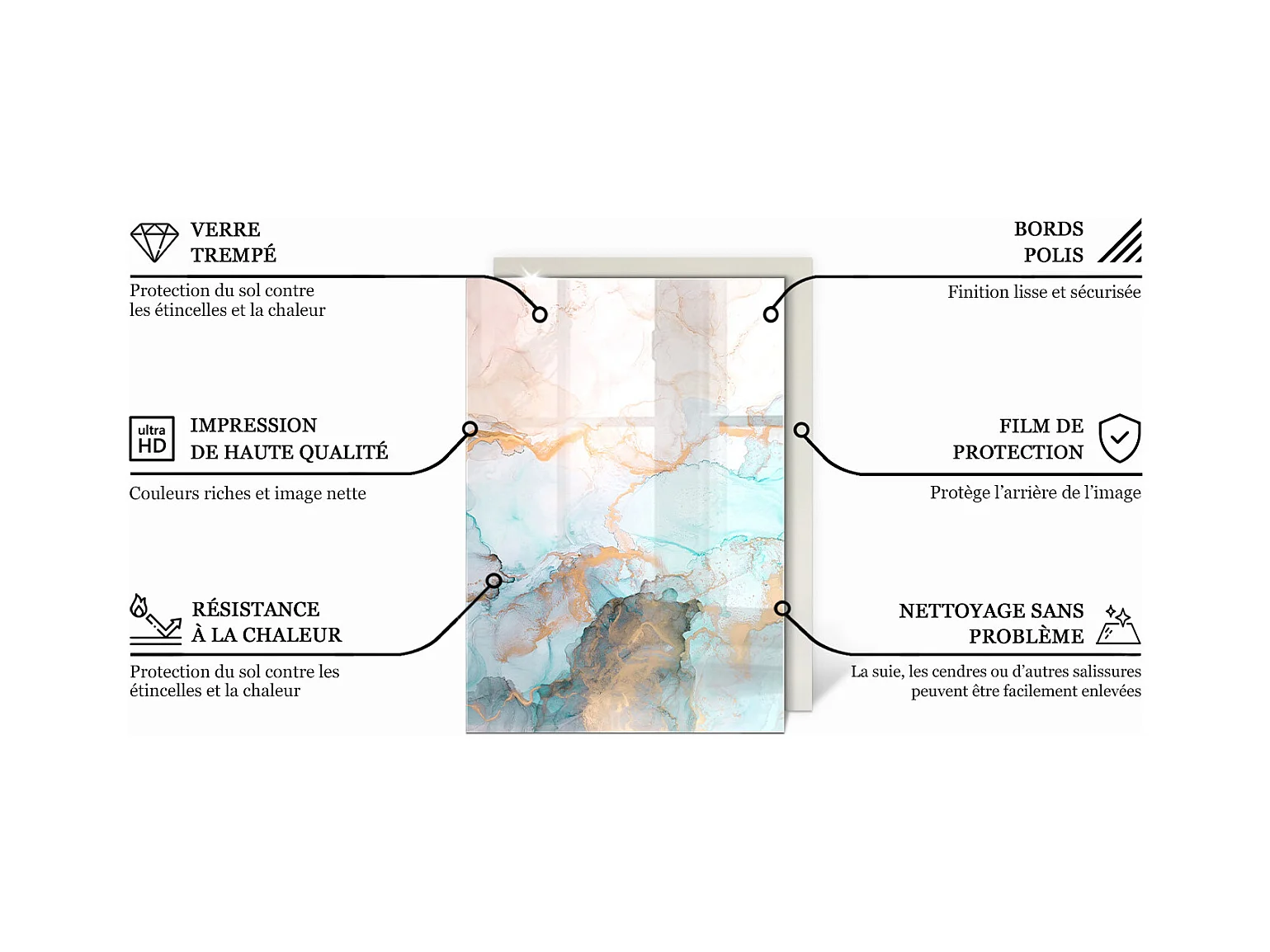 Glasplatte zum Schutz vor Funkenflug, Kaminauflage - Rechteck - 100x70 - Marmormuster mit Adern