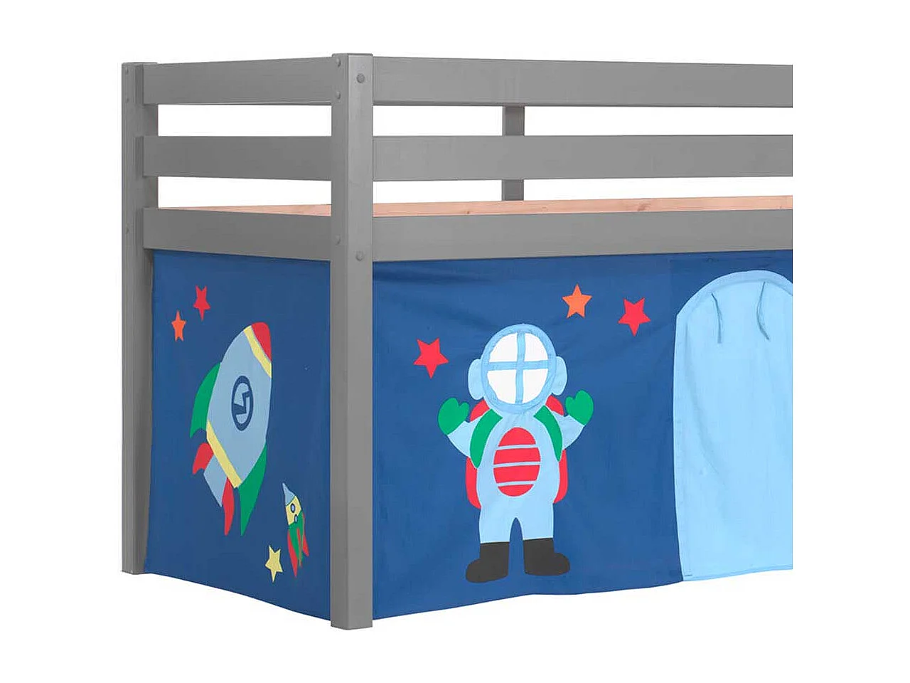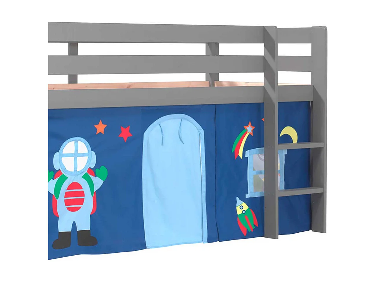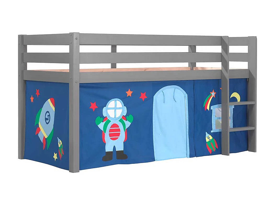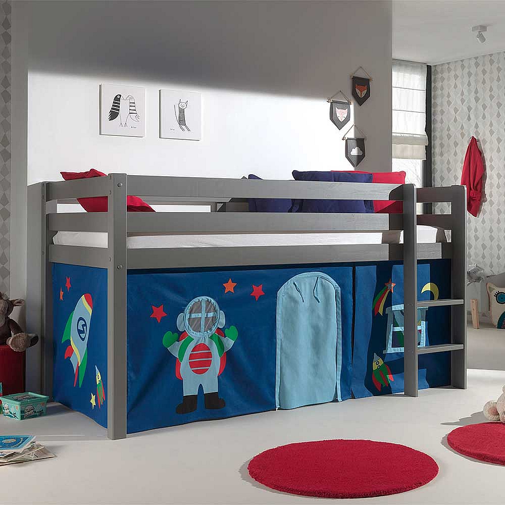 Graues Hochbett aus Kiefer Massivholz Vorhang