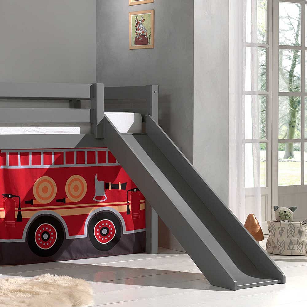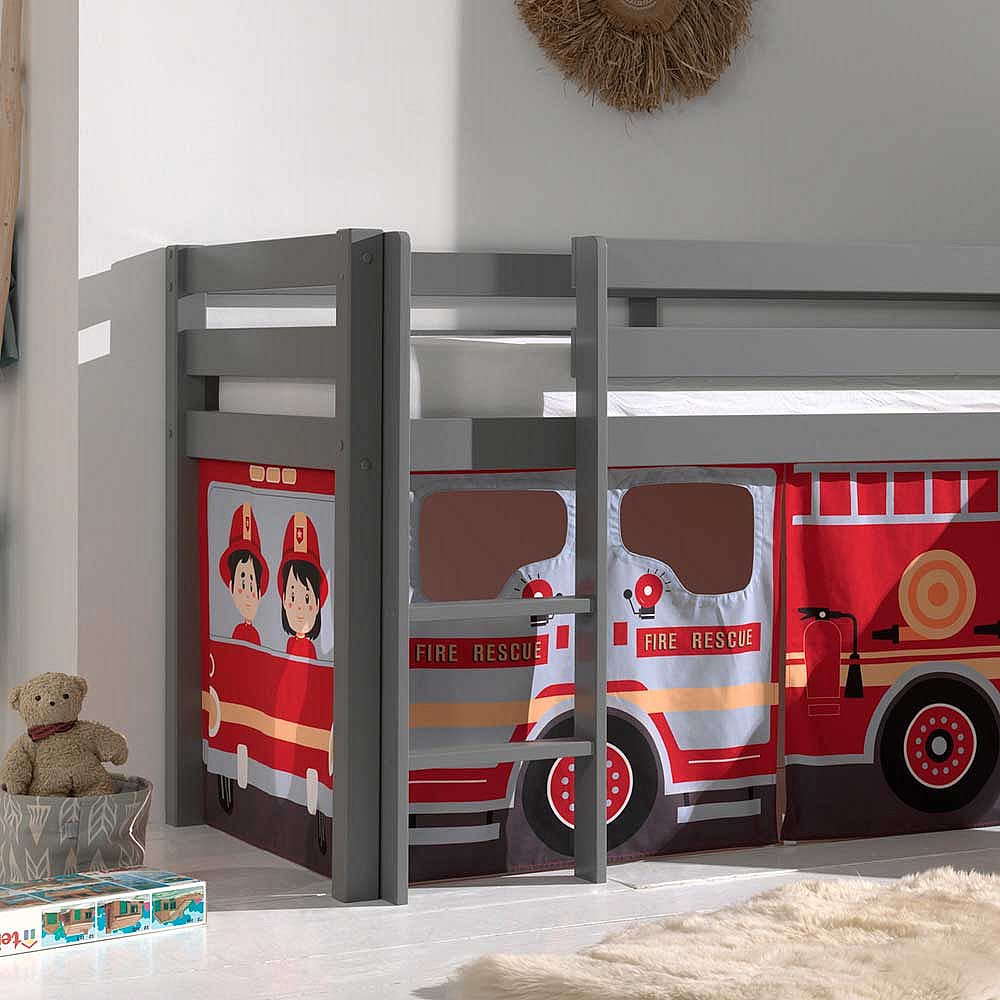 Graues Kinder Halbhochbett mit Rutsche Vorhang mit Feuerwehr Motiv