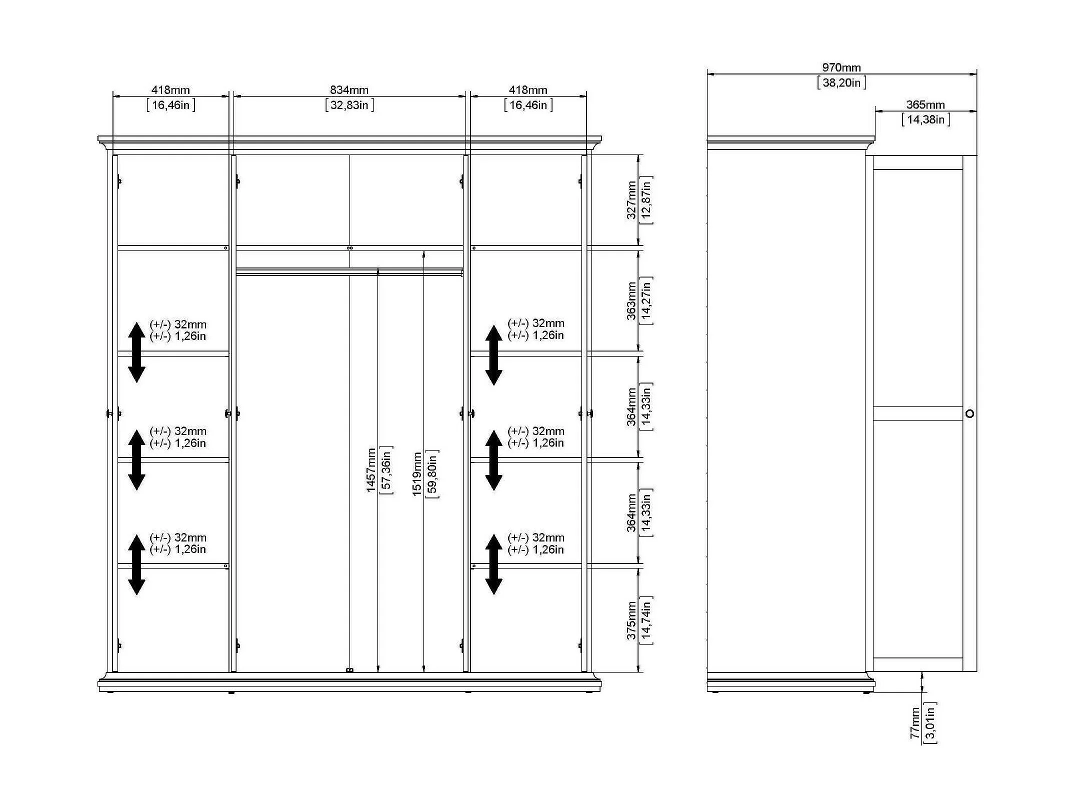 Großer Kleiderschrank Dserp, Schlafzimmermöbel, Schrank, Garderobe, 181x61 h201 cm, Weiß
