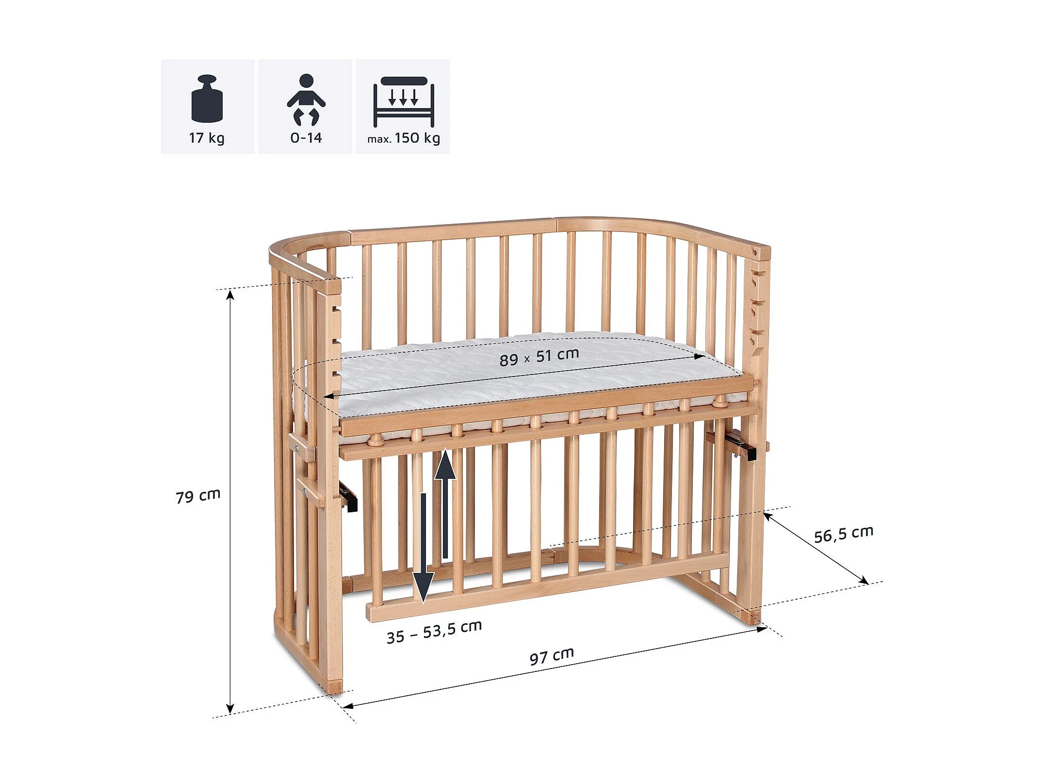 Großes Cododo Wiegenbett aus Naturholz mit Matratze - Maxi Comfort +