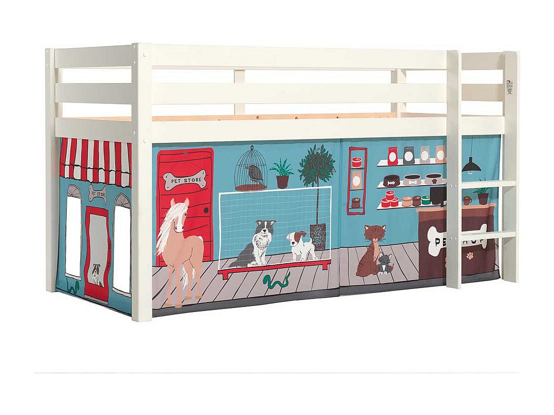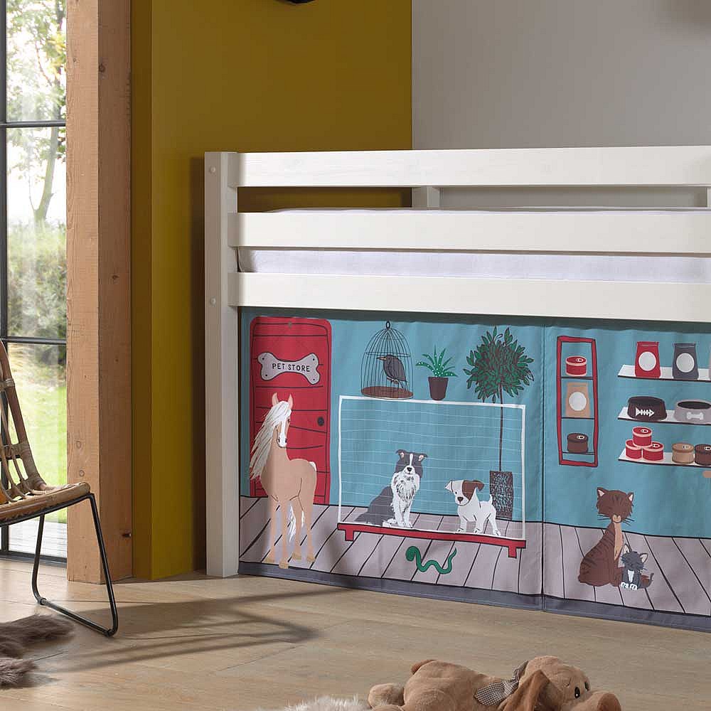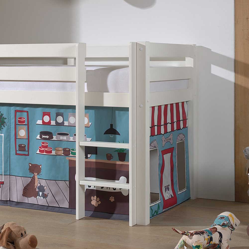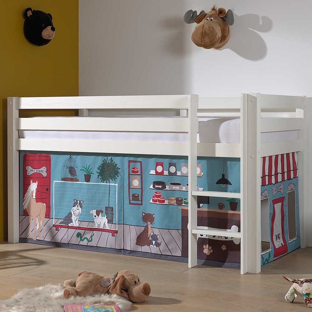Halbhohes Kinderbett aus Kiefer Massivholz Vorhang Set Tiere