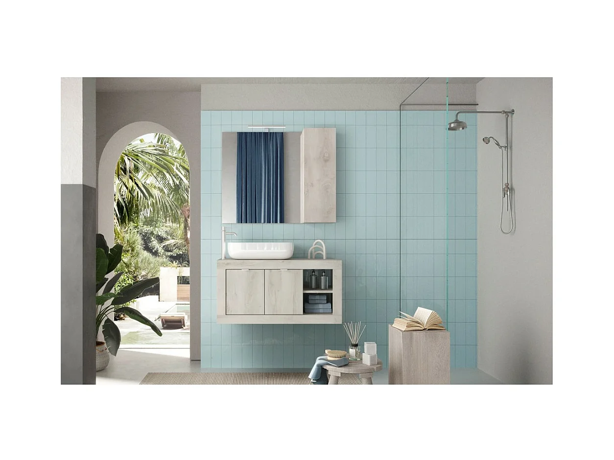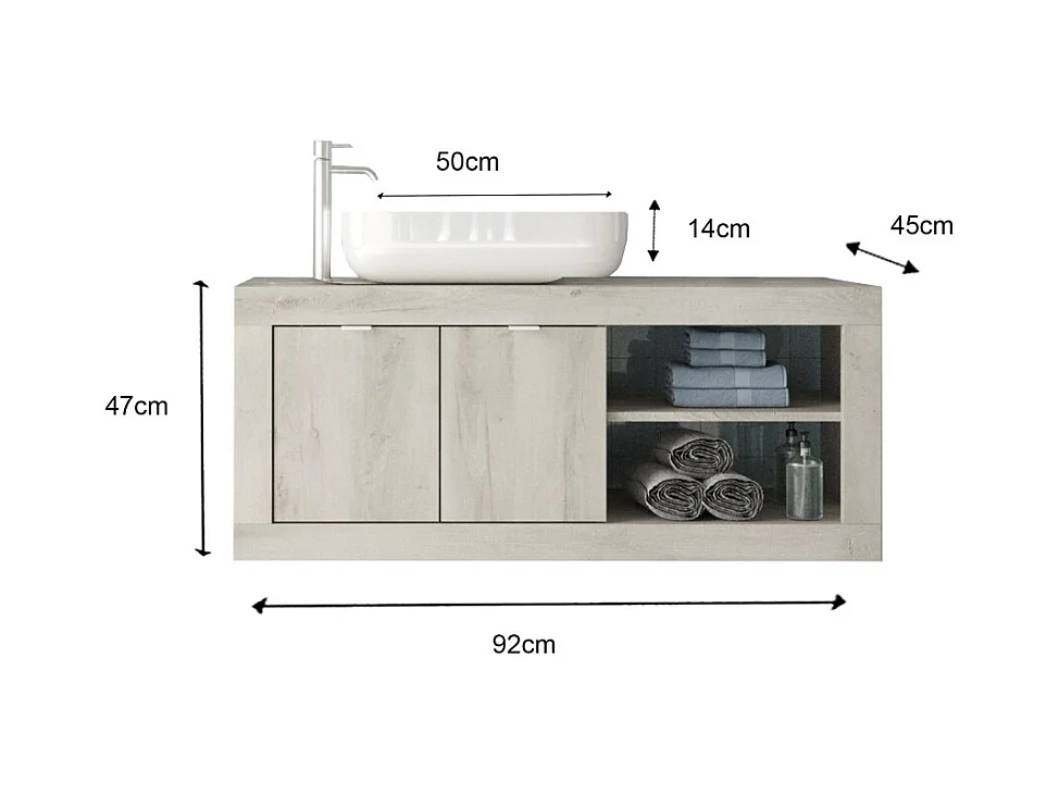 Wandhängendes Badezimmermöbel mit einem Waschbecken und 2 Türen, Länge 92 cm, Kollektion ISORA, Farbe Weiß Holzeffekt