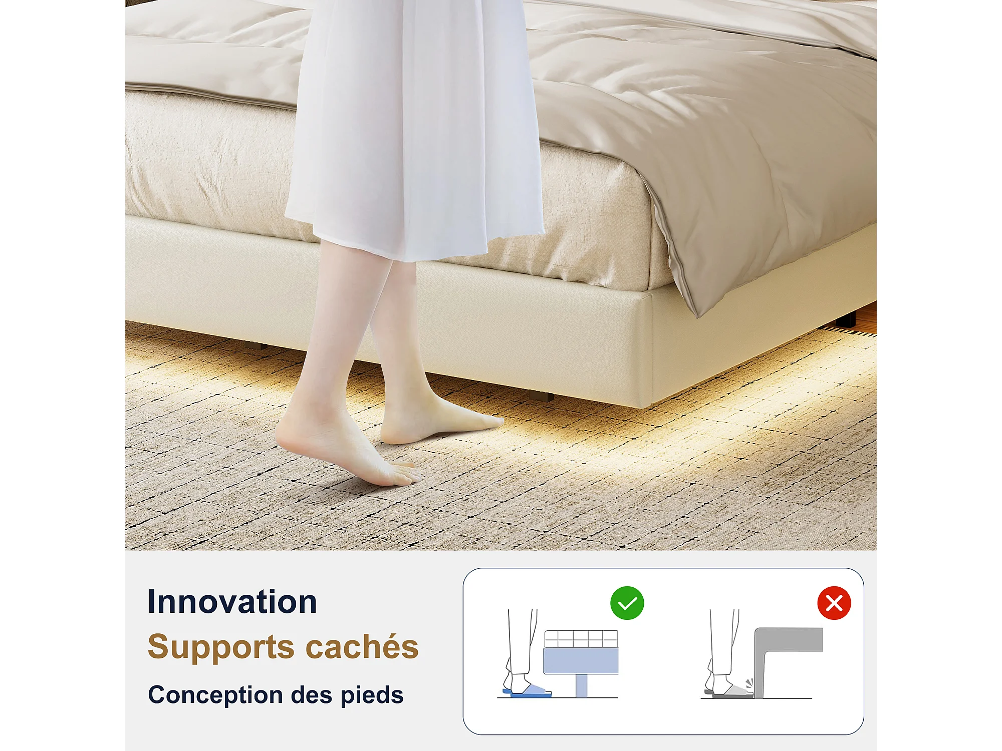Hängendes Designer-Doppelbett 160 × 200 cm mit Stauraum, mehrfarbigen LEDs und USB-Anschlüssen – Weißes Kunstleder & helle Eiche