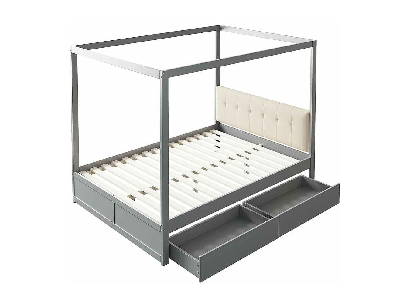 Himmelbett 140*200 cm, mit großen Schubladen und weicher Rückenlehne, graues Holzbett.
