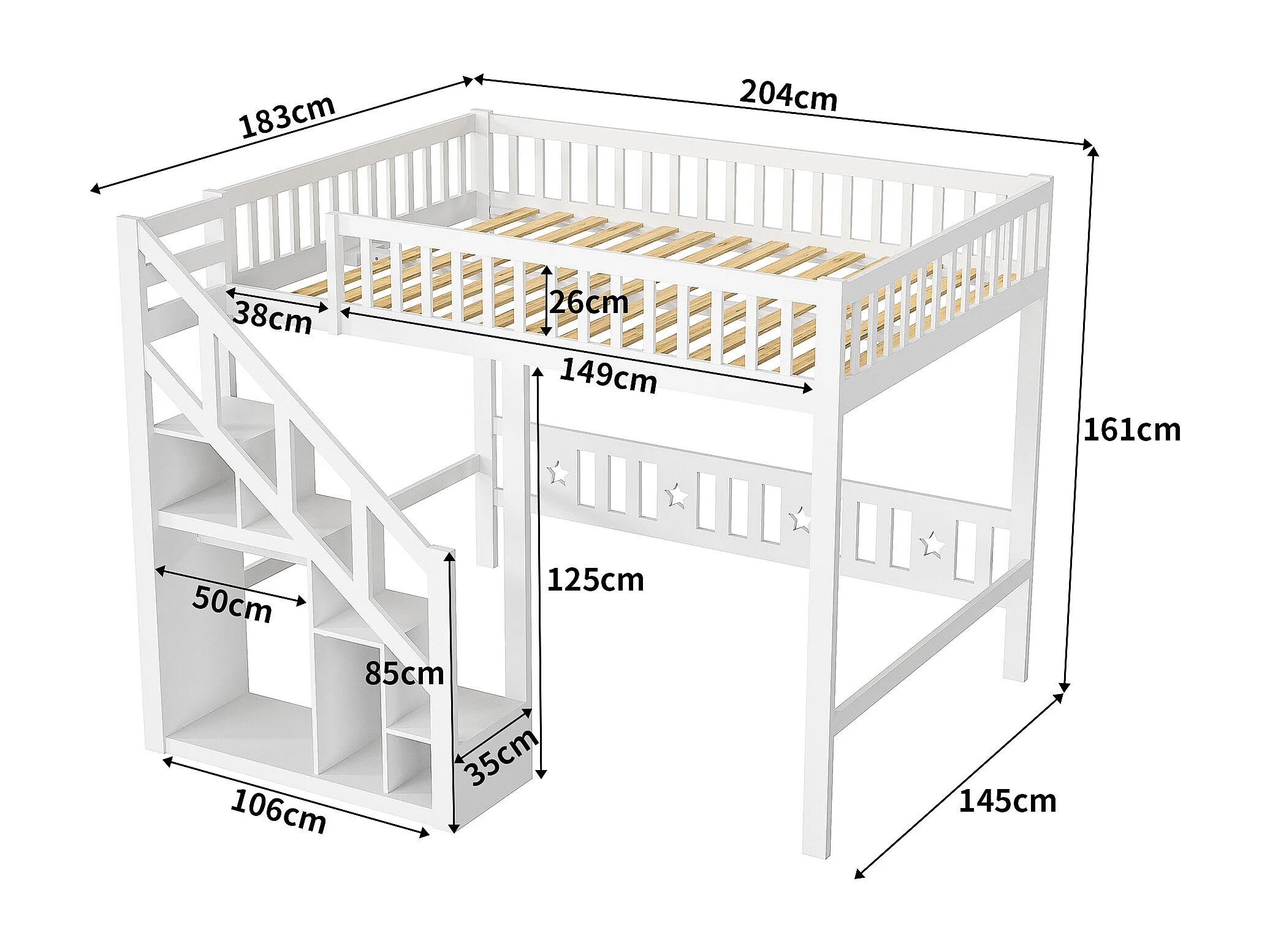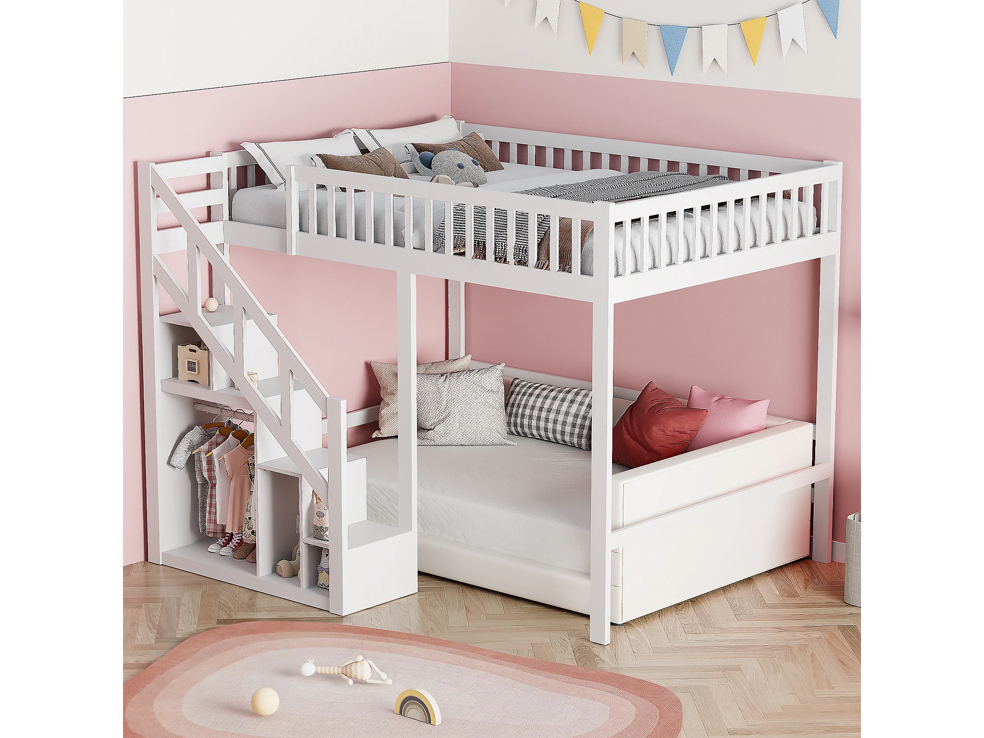 Hochbett 140 x 200 cm, multifunktionales Kinderbett mit Stauraumtreppe, weiß