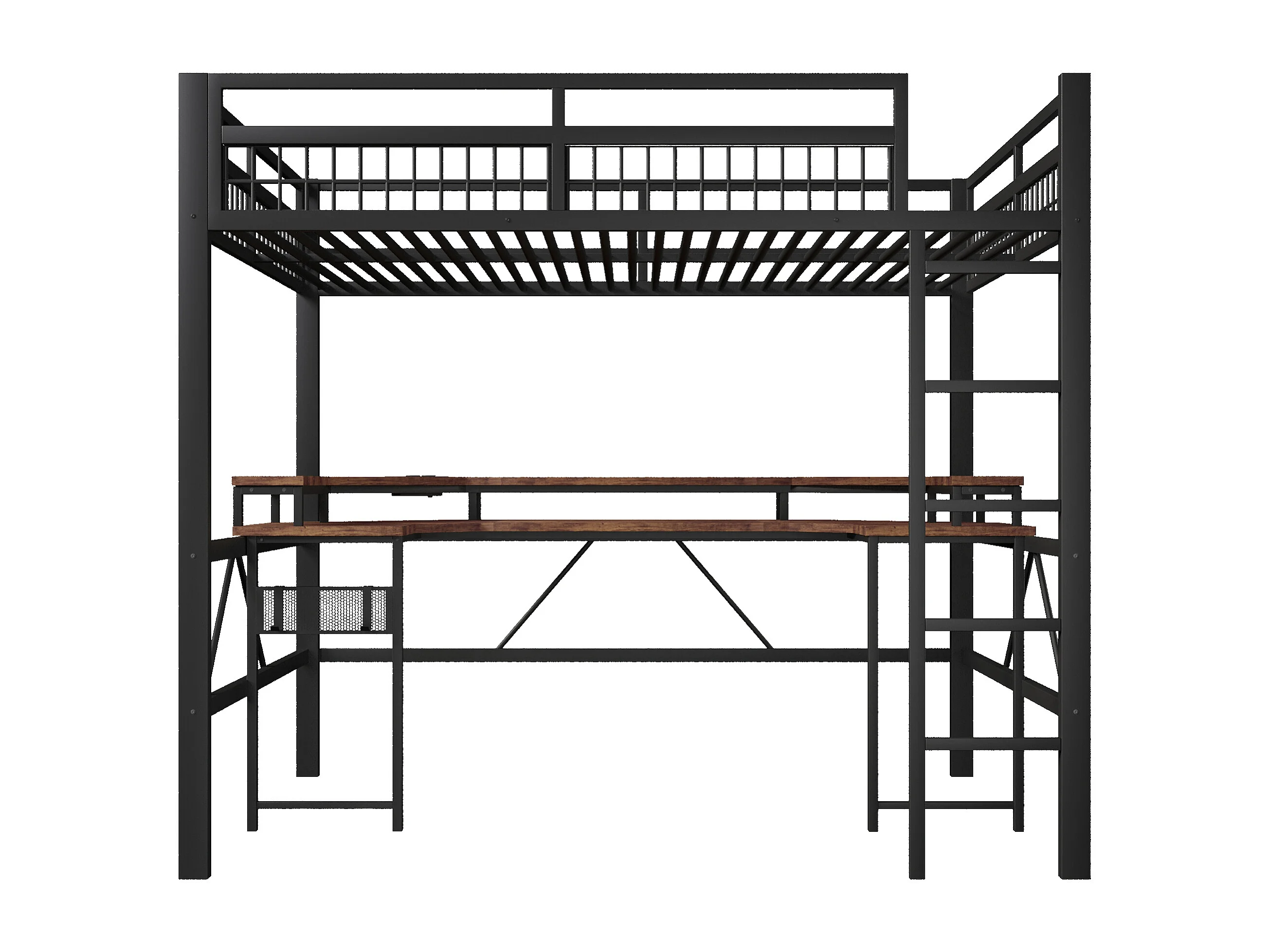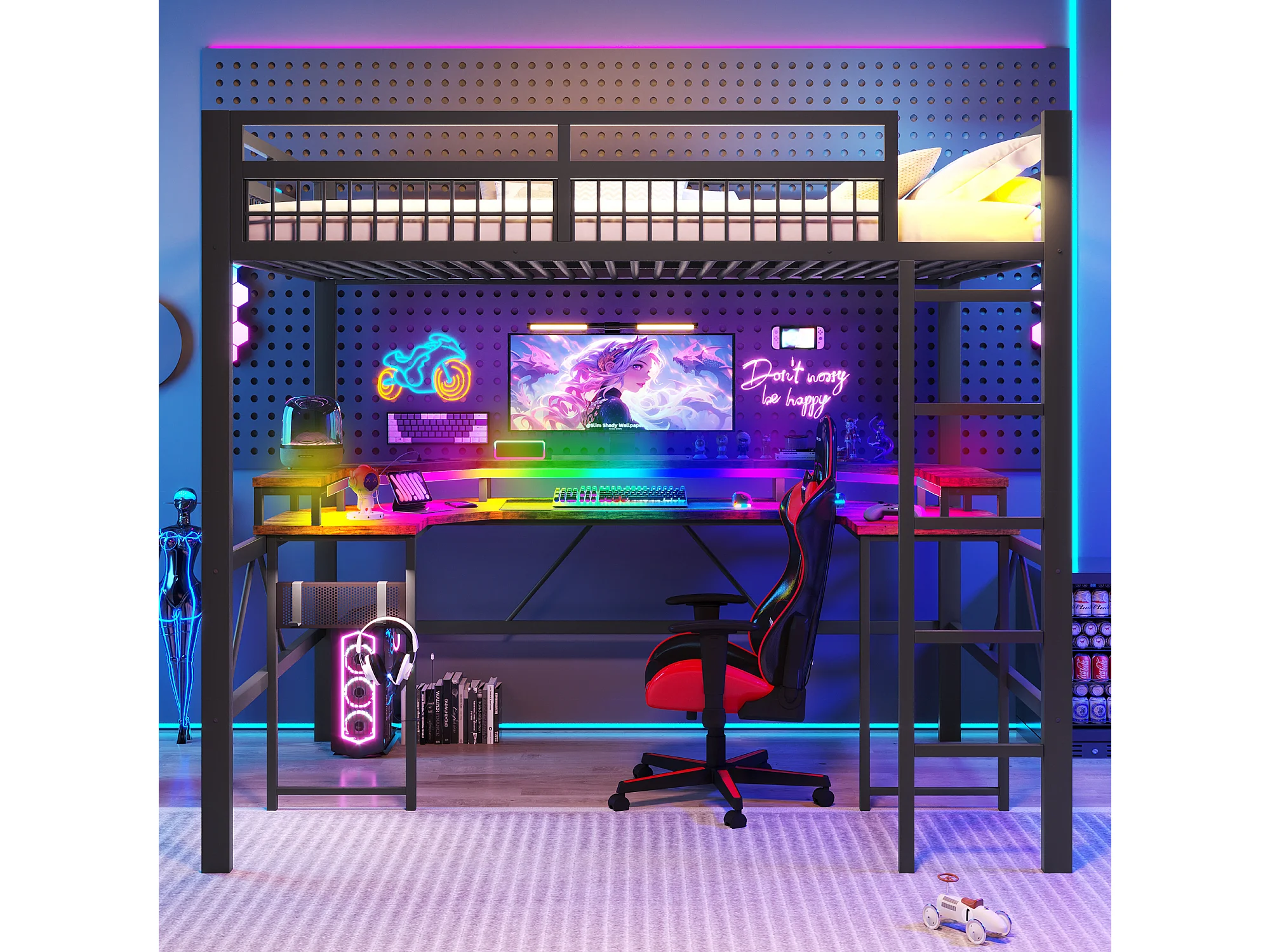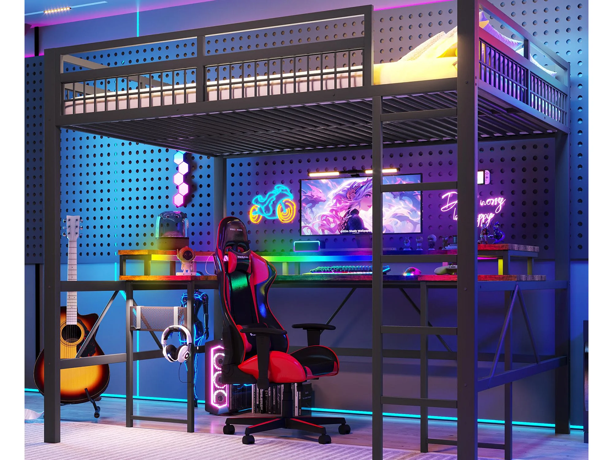Hochbett 140x200 cm - LED-Beleuchtung - Integrierter Schreibtisch - 1 USB-Anschluss + 1 Type-C-Anschluss + 2 Steckdosen - Schwarz​ (Matratze nicht inbegriffen)
